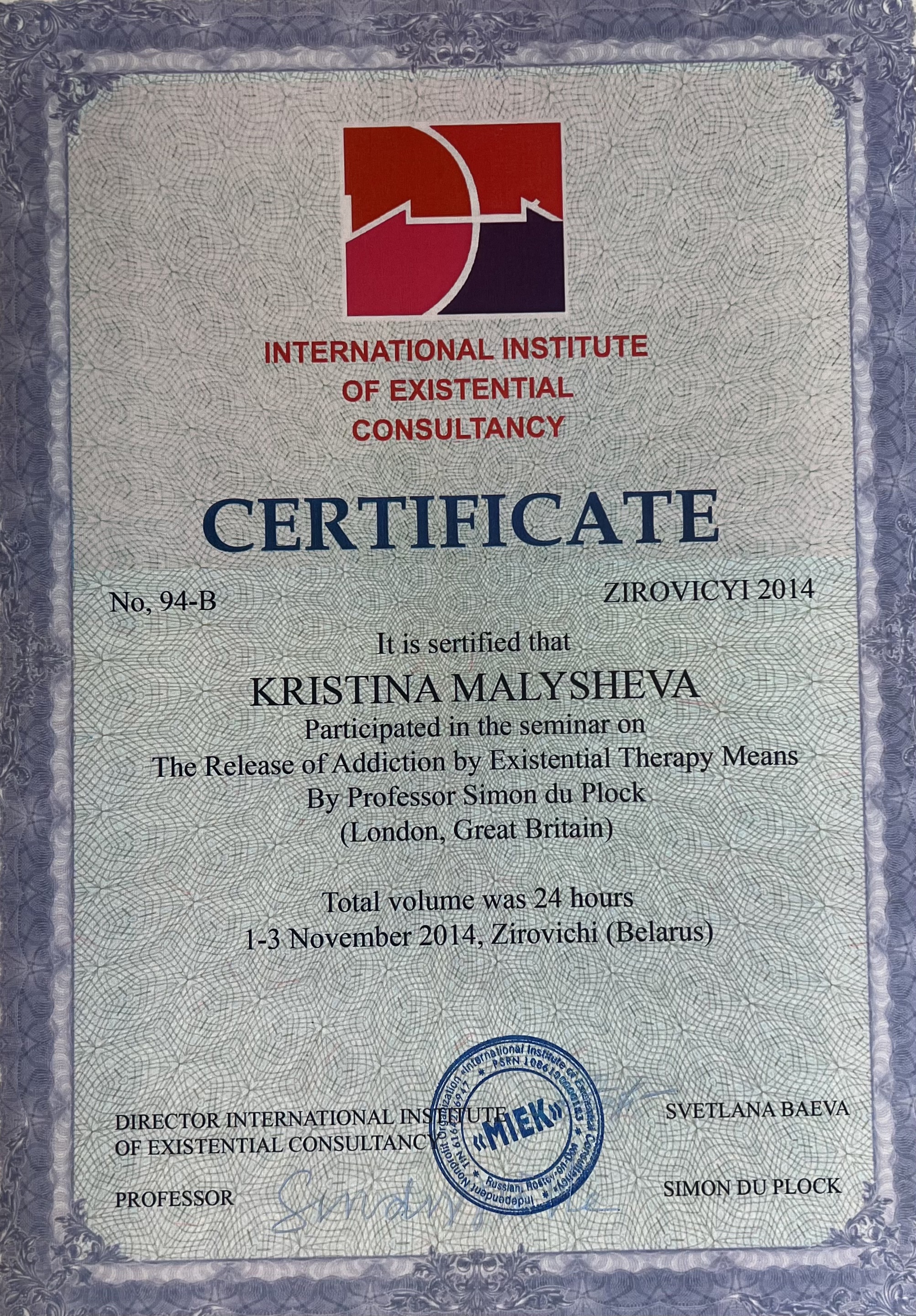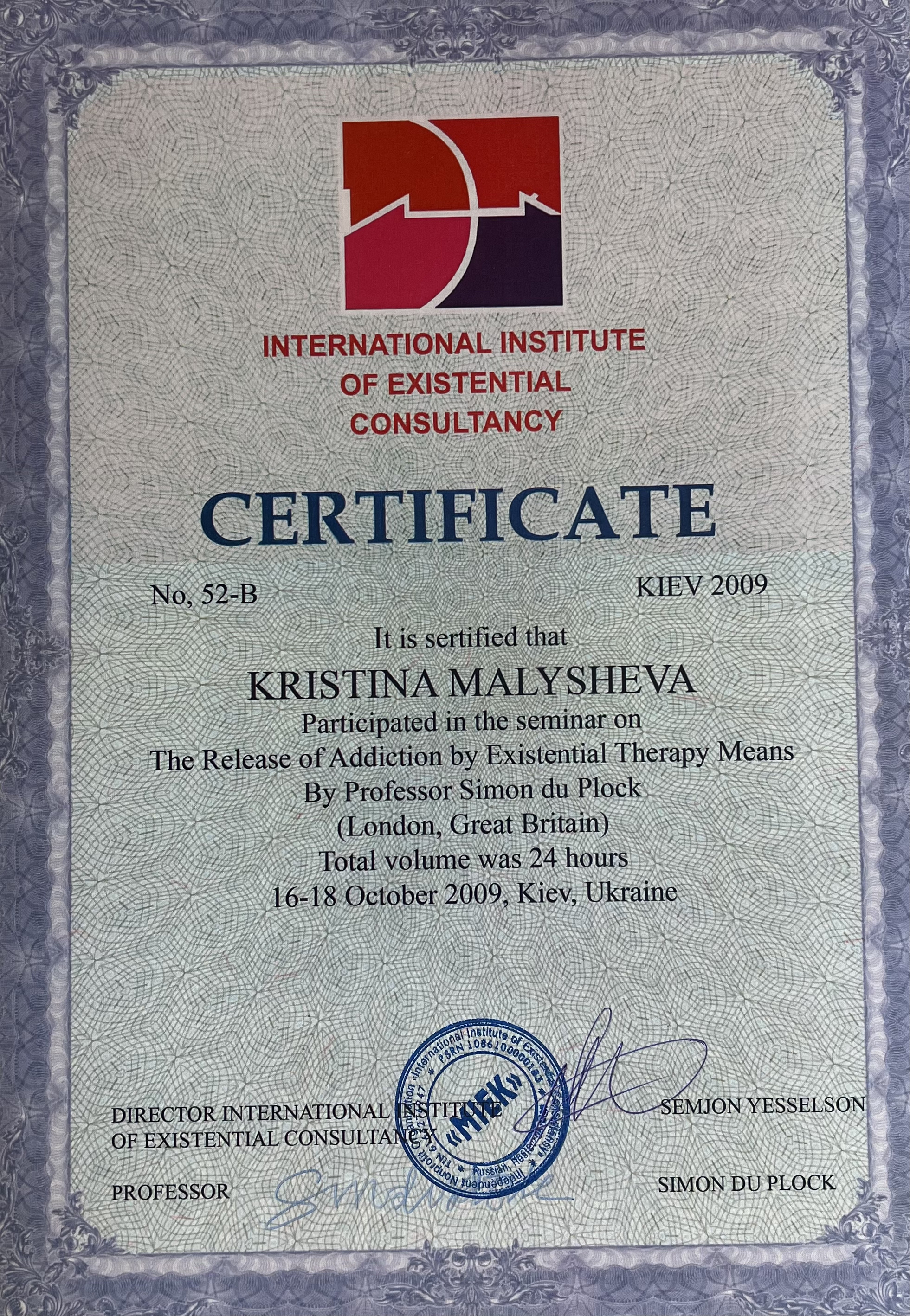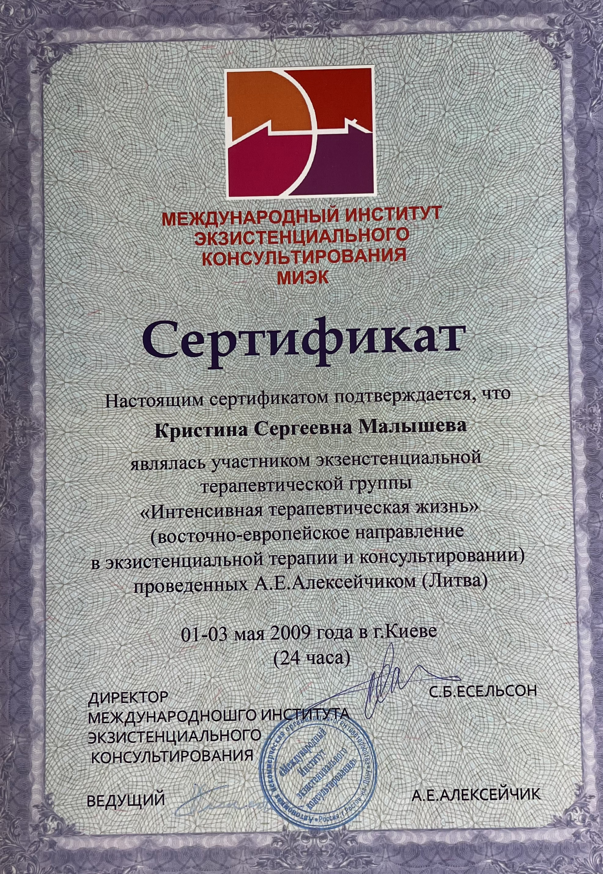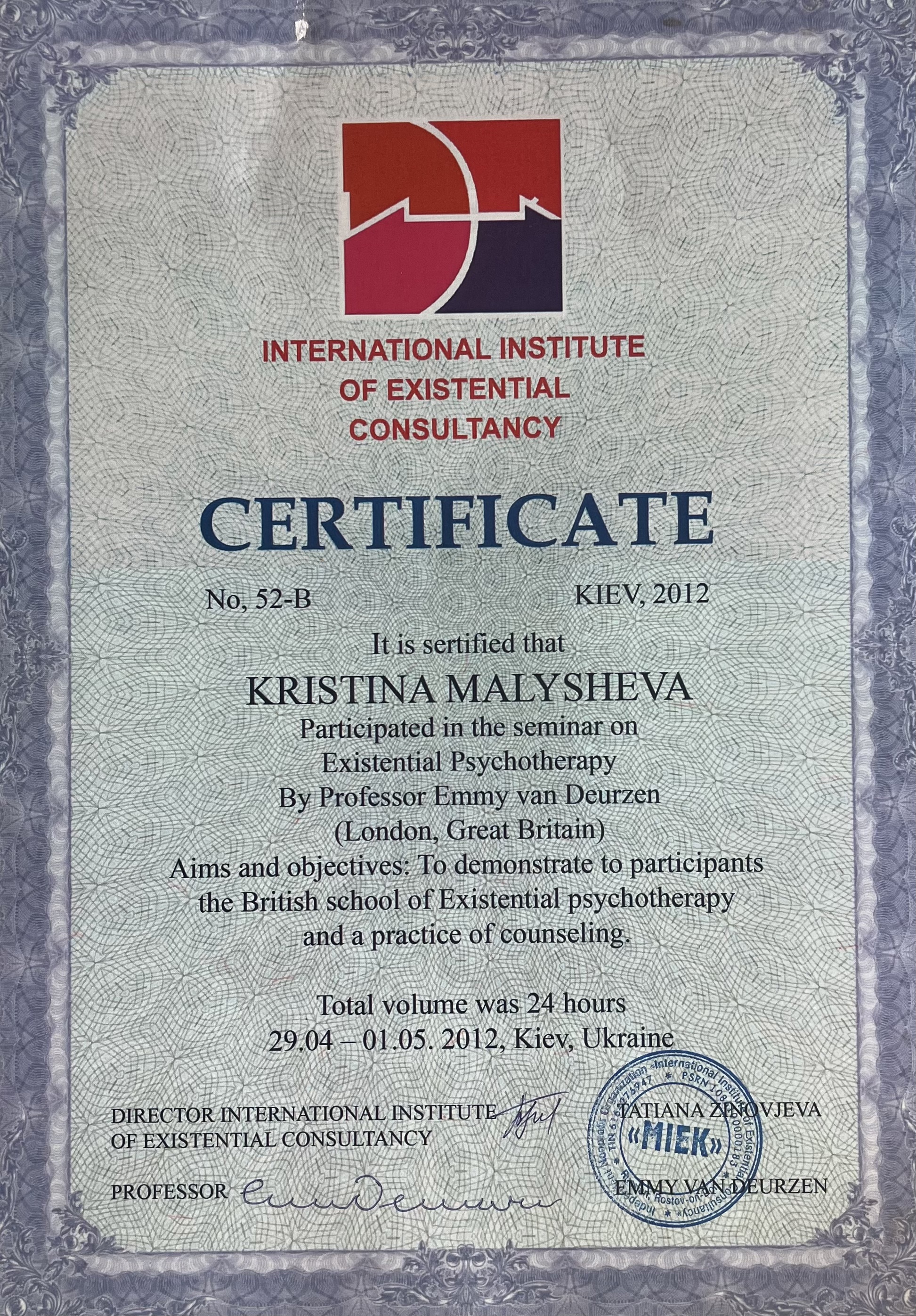 4-летняя программа повышения квалификации по направлению "Экзистенциальное консультирование и терапия", Международный институт экзистенциального консультирования, 2008-2012 гг.