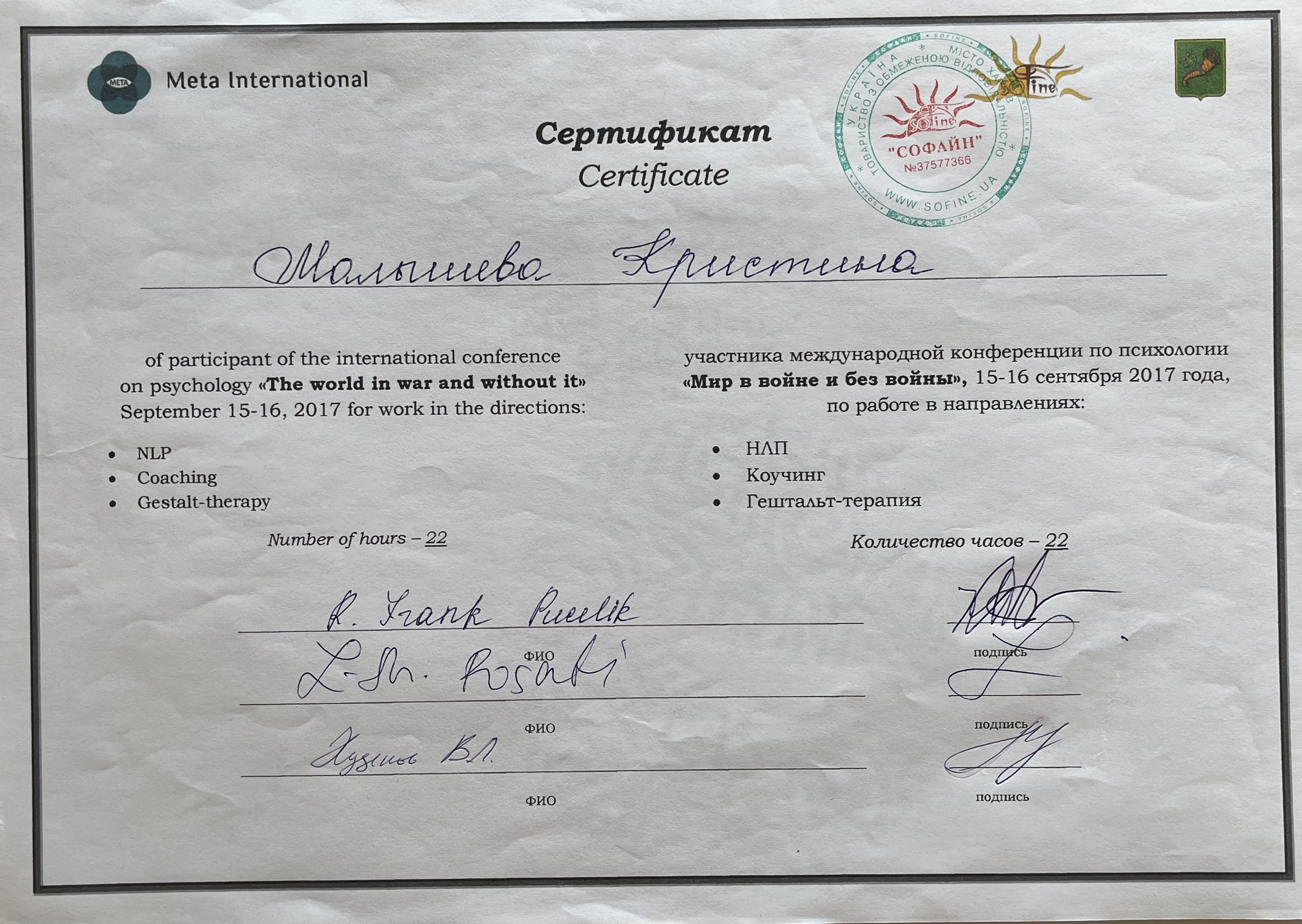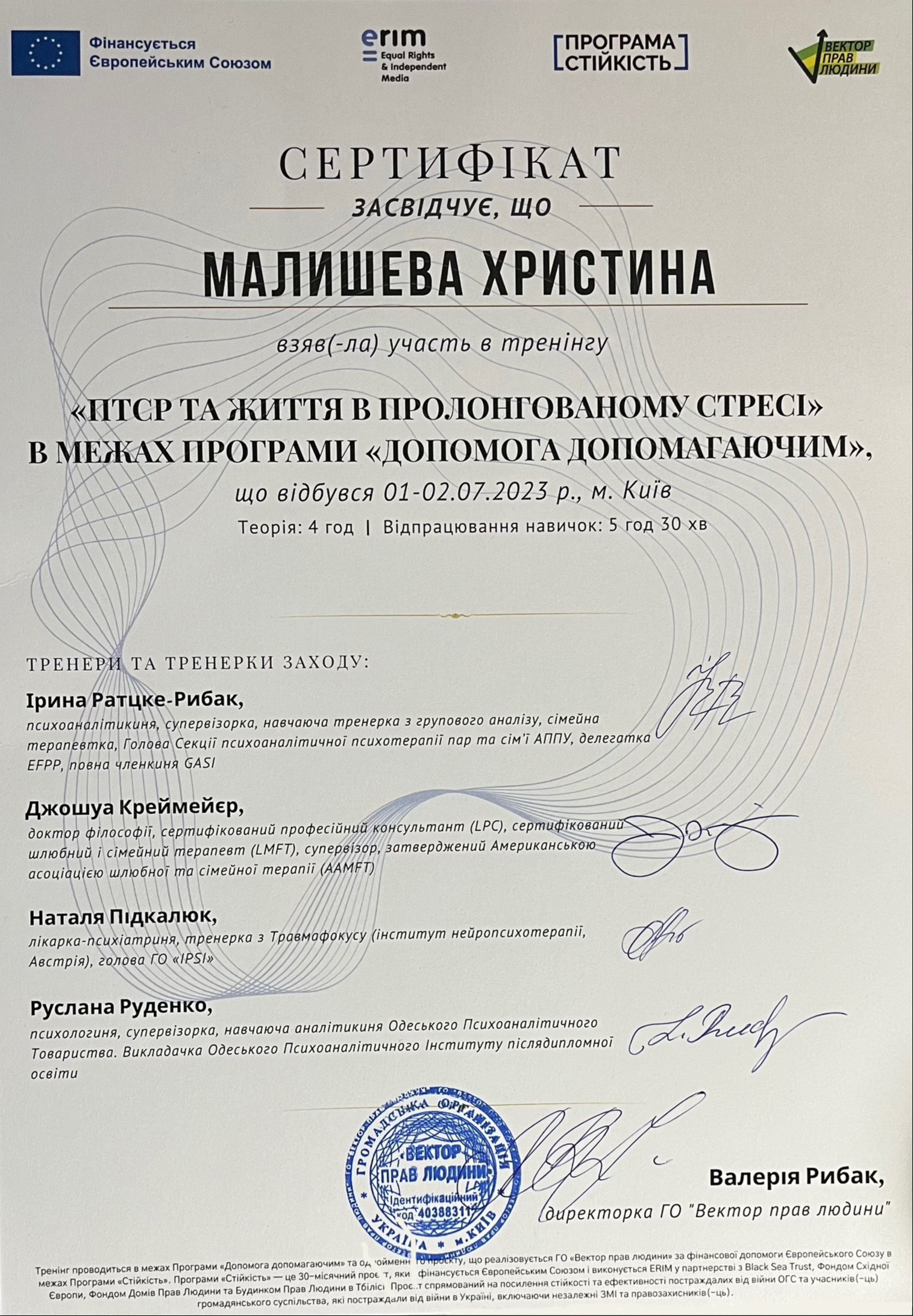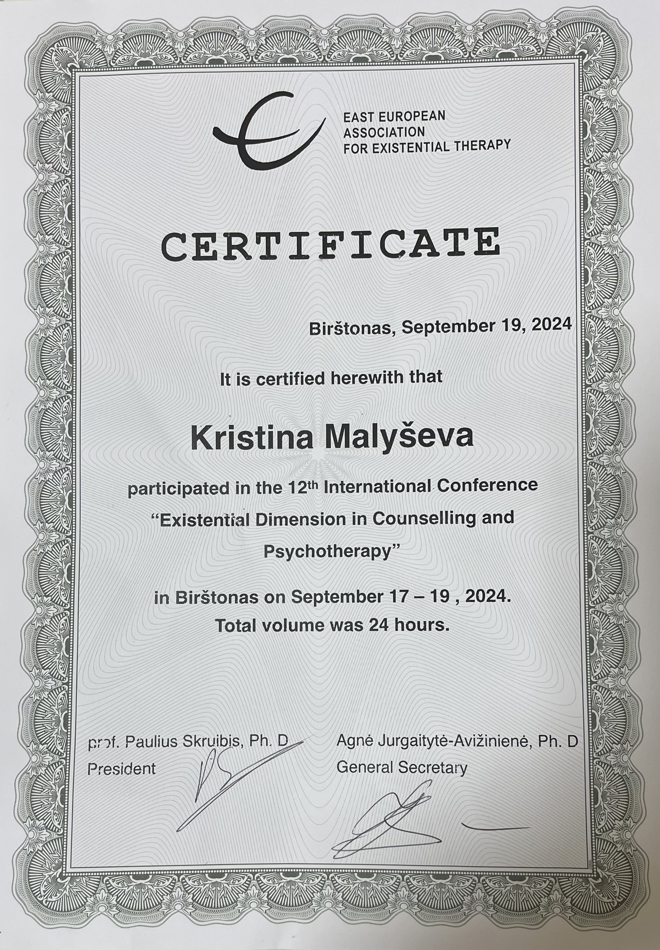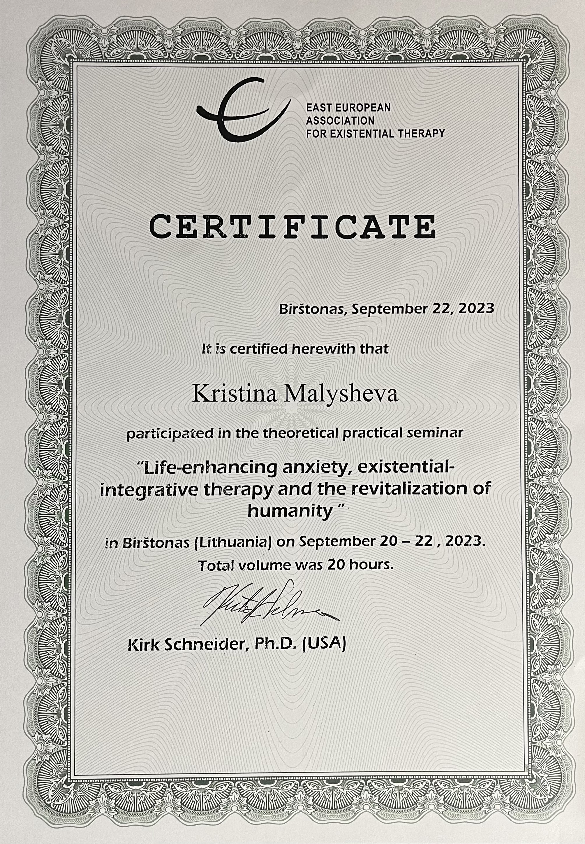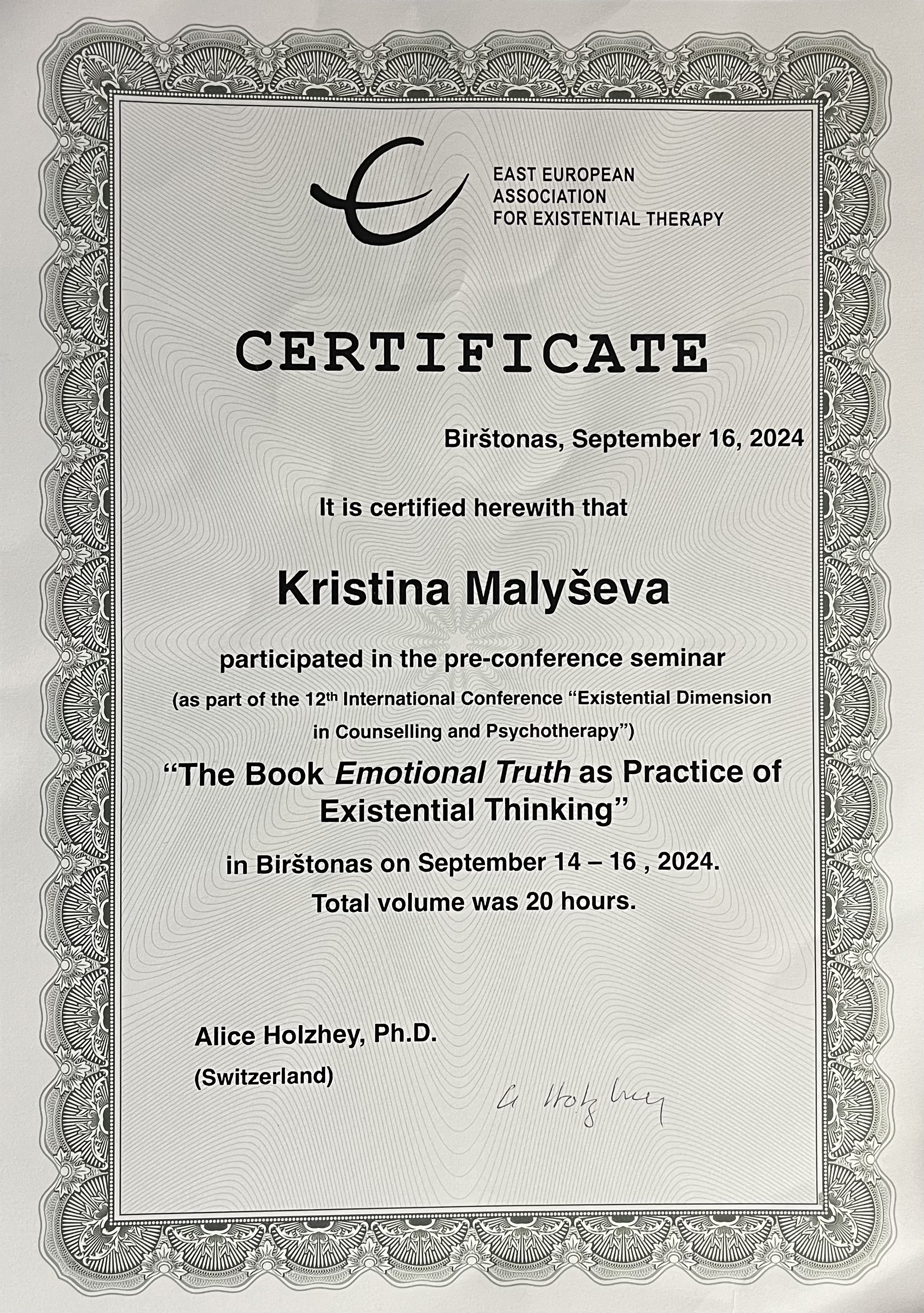 4-летняя программа повышения квалификации по направлению "Экзистенциальное консультирование и терапия", Международный институт экзистенциального консультирования, 2008-2012 гг.