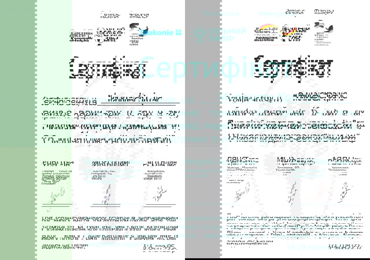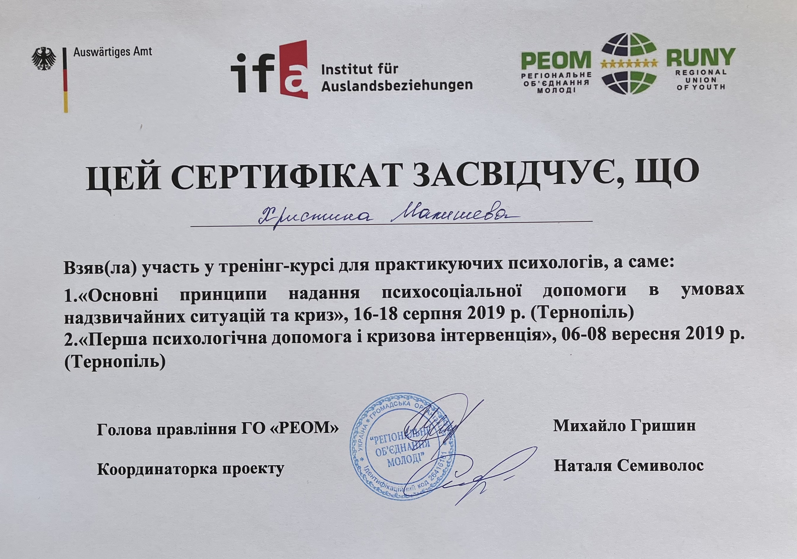 Тренинг "Первая психологическая помощь и кризисная интервенция", ОО "Региональное объединение молодежи", Тернополь, 6-8 сентября 2019 года.