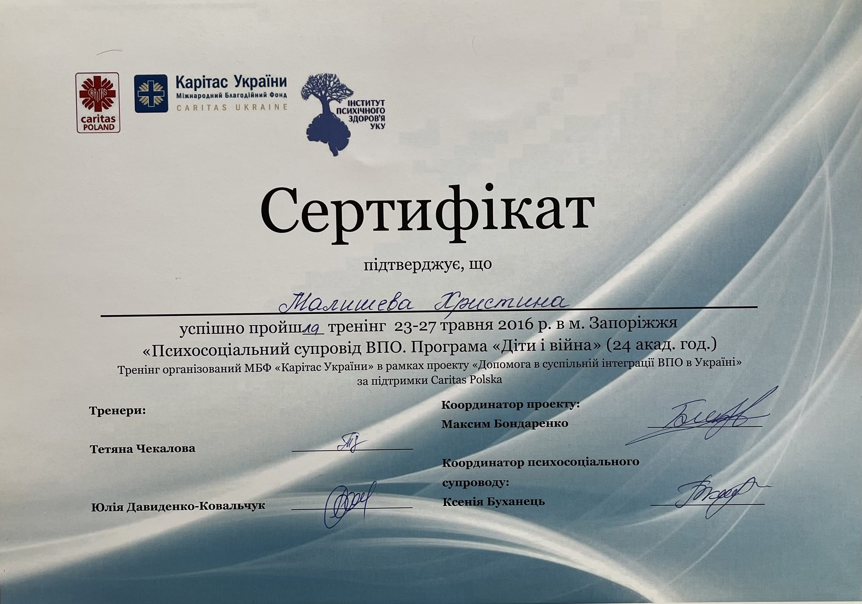 Тренинг «Психосоциальное сопровождение ВПЛ. Программа «Дети и война», БО БФ «Каритас Украины», Запорожье, 23-27 мая 2016 (24 часа).