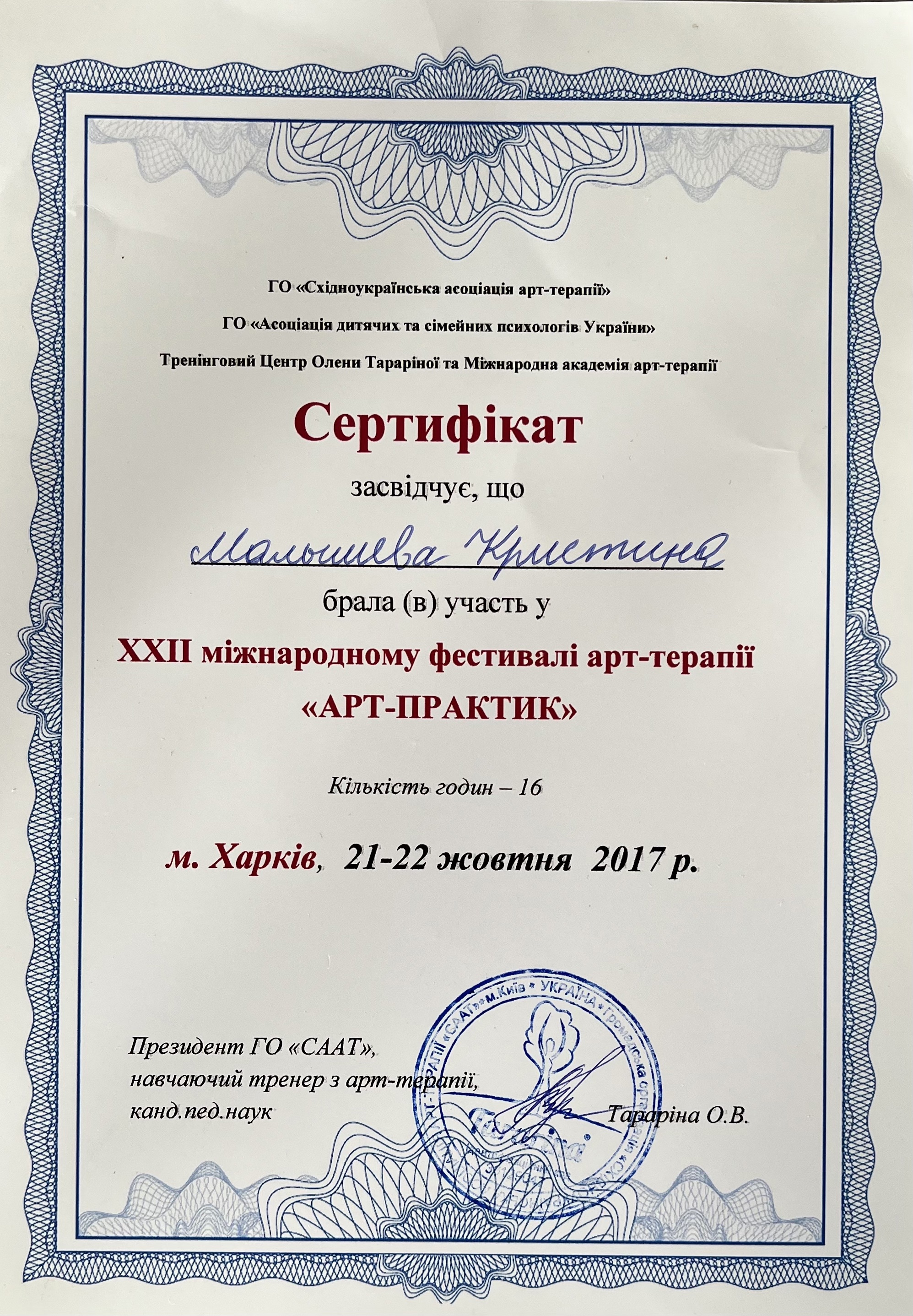 Тренинг «Использование арт-терапии в консультировании с детьми и взрослыми», БО БФ «Каритас Харьков», Харьков, 21 ноября 2016 (8 часов).