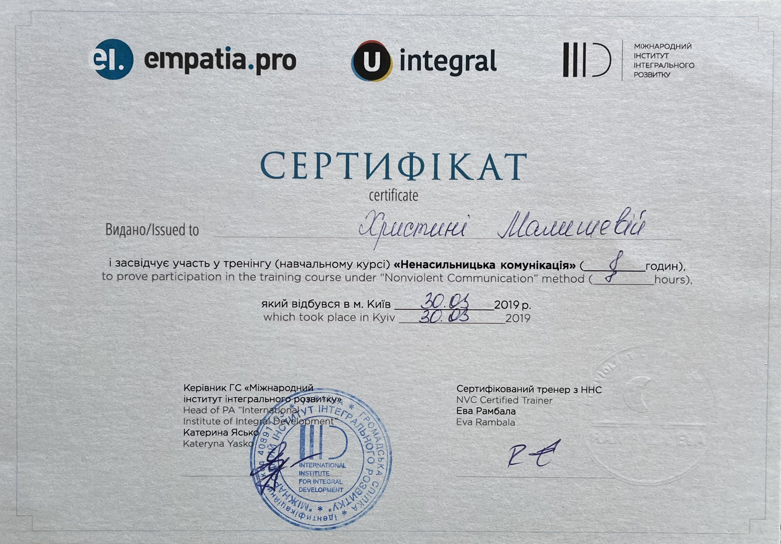 Тренинг "Ненасильственное общение", Международный институт интегрального развития, Киев, 30 марта 2019 г. (8 часов).