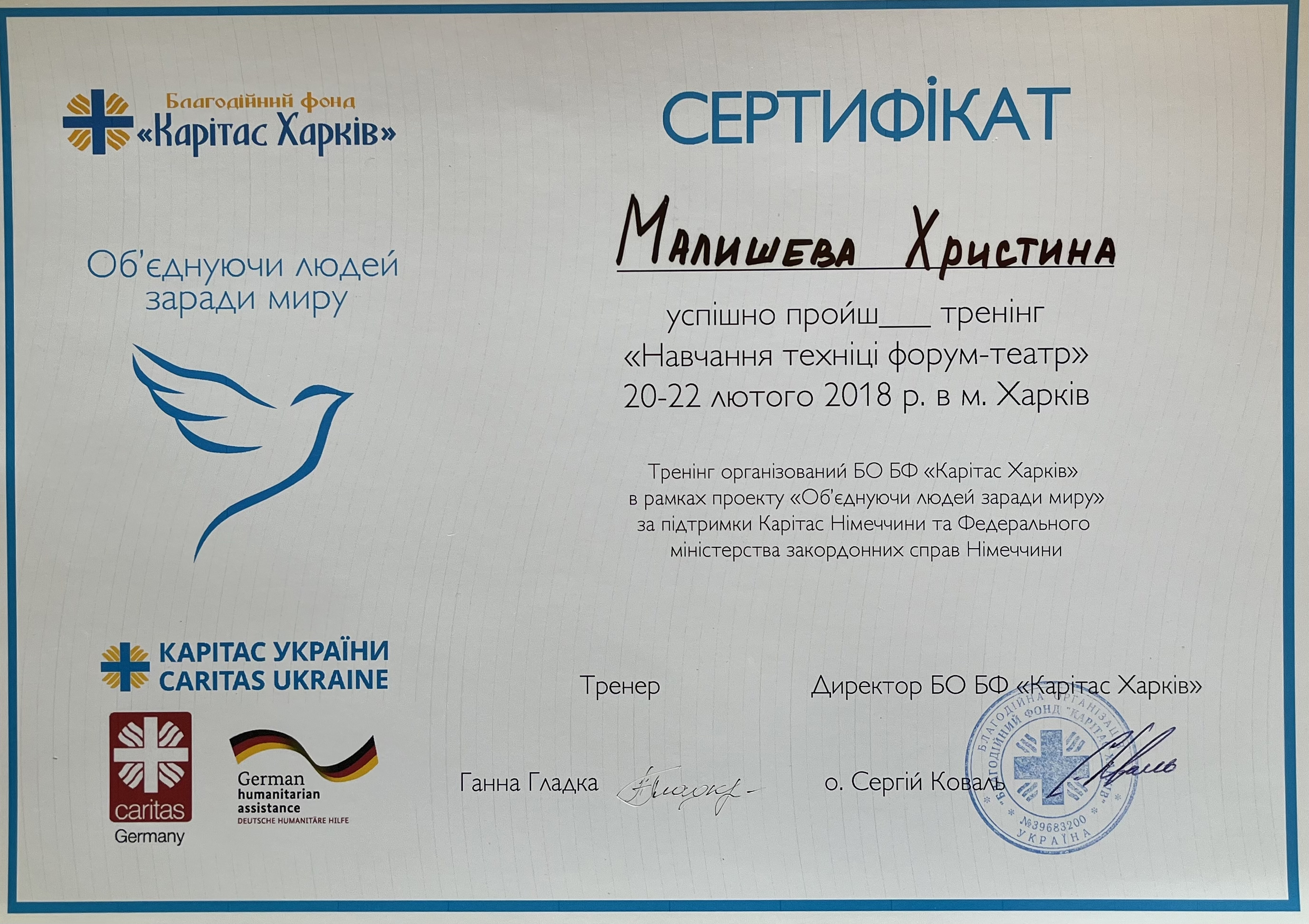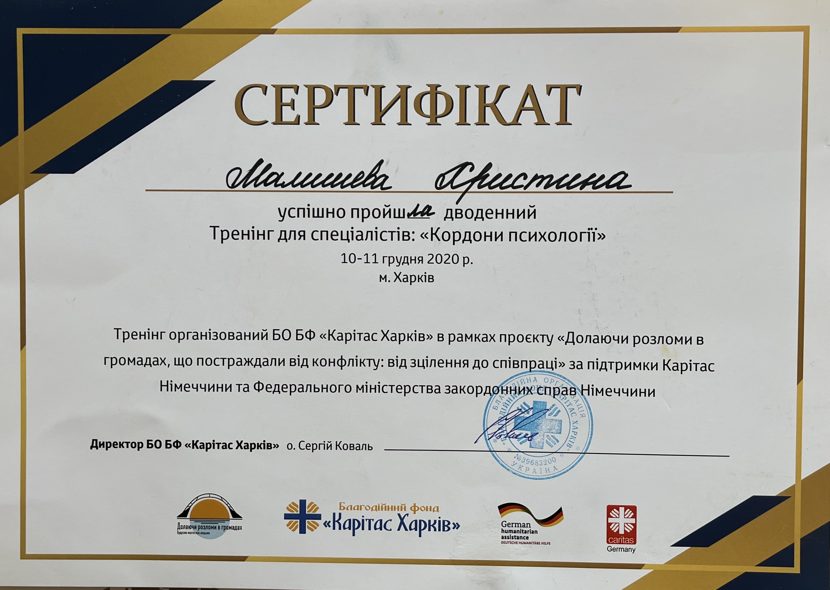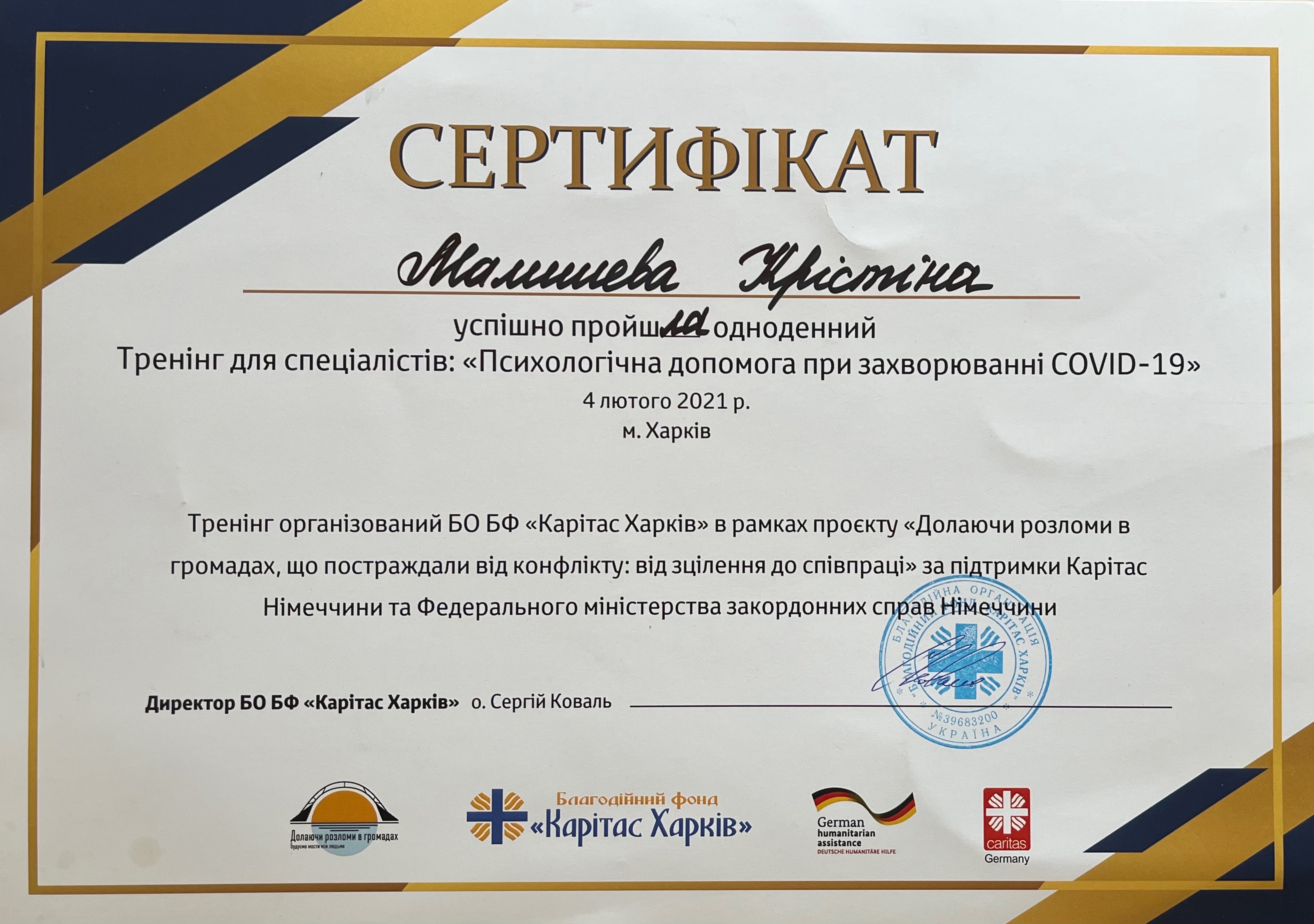Тренинг "Психологическая помощь при заболевании Covid-19", БО БФ "Каритас Харьков", Харьков, 4 февраля 2021 года (8 часов).