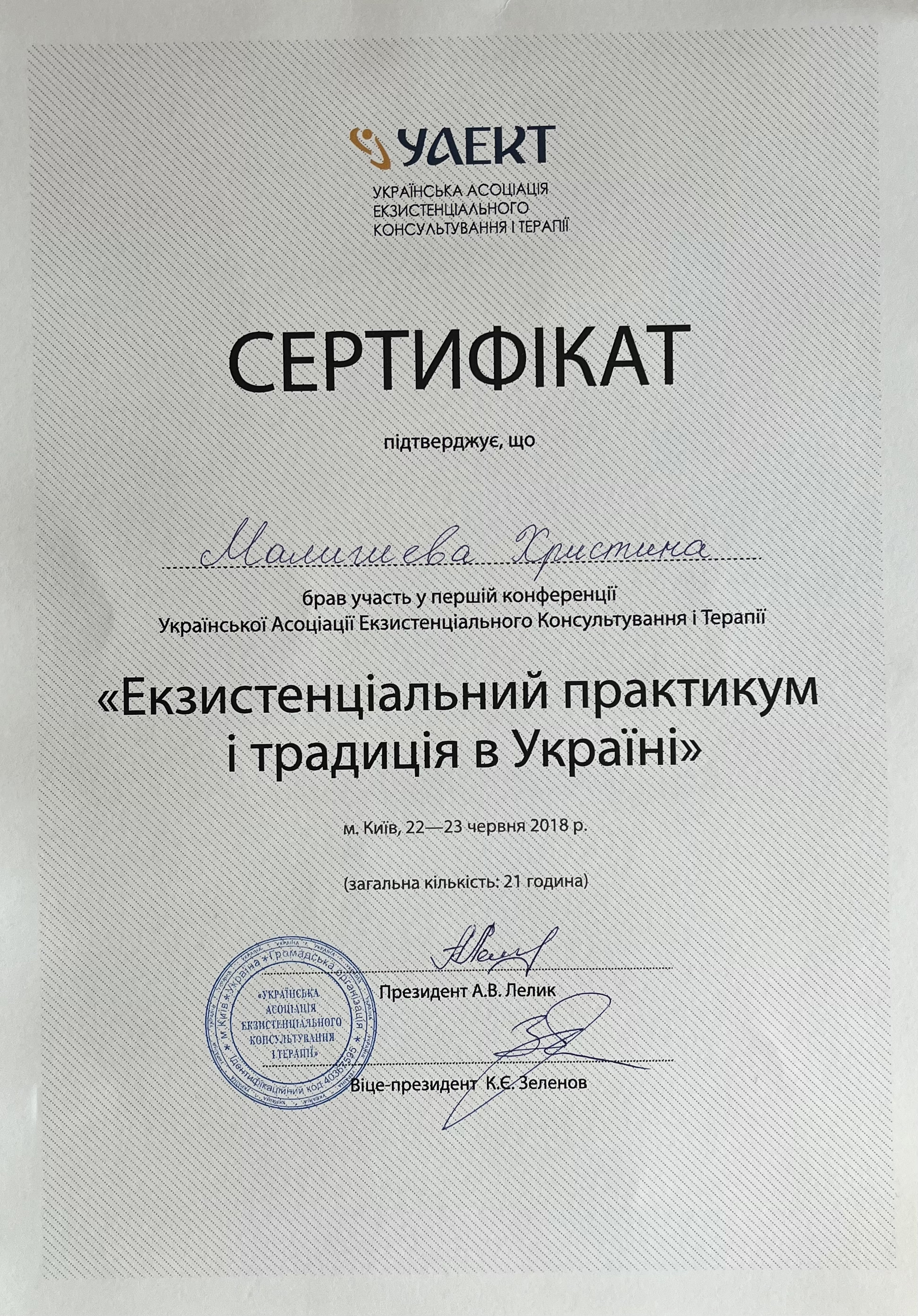 Член Президиума Украинской ассоциации экзистенциального консультирования и терапии (УАЭКТ), ассоциированный член Европейской федерации экзистенциальной терапии (FETE).