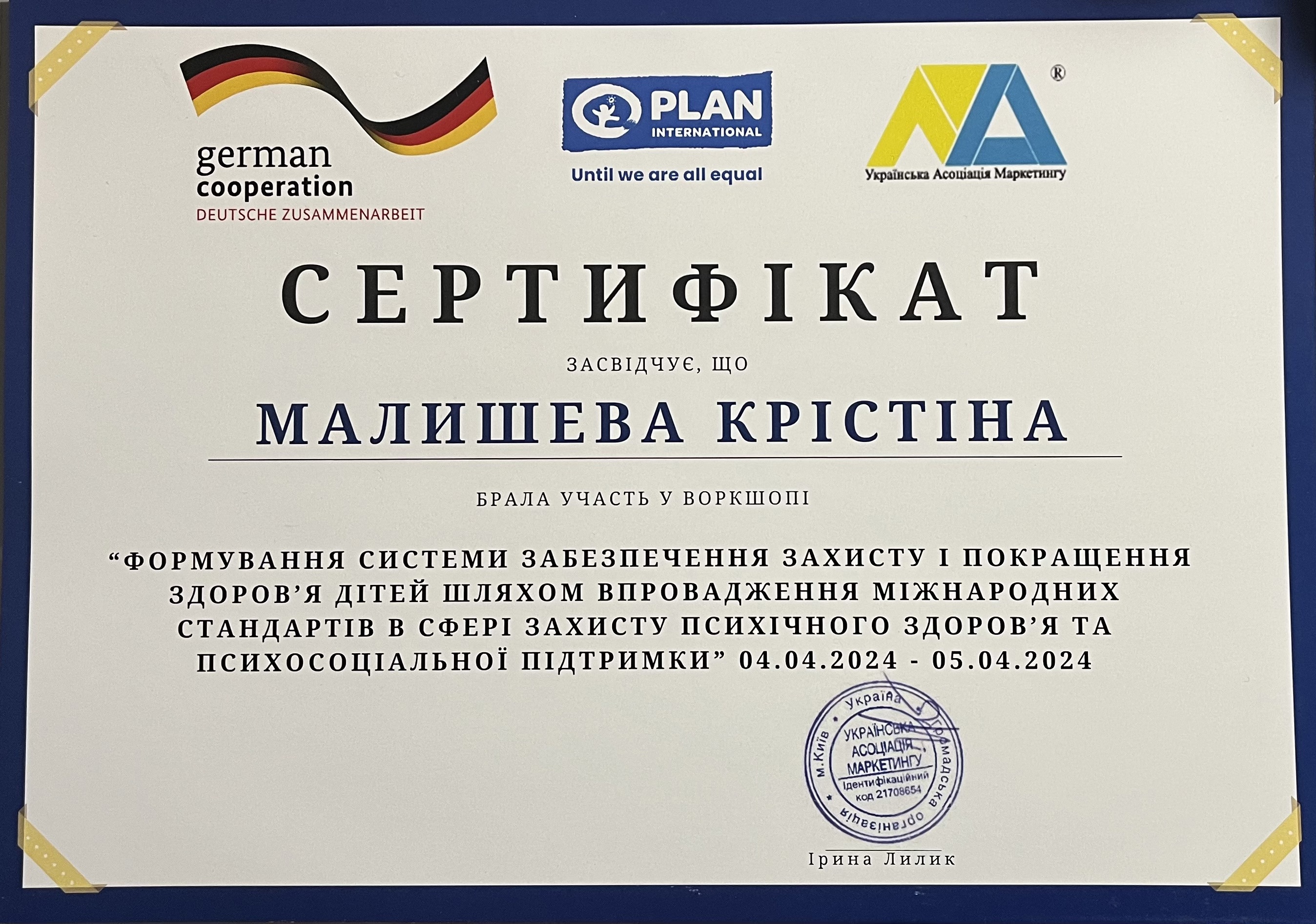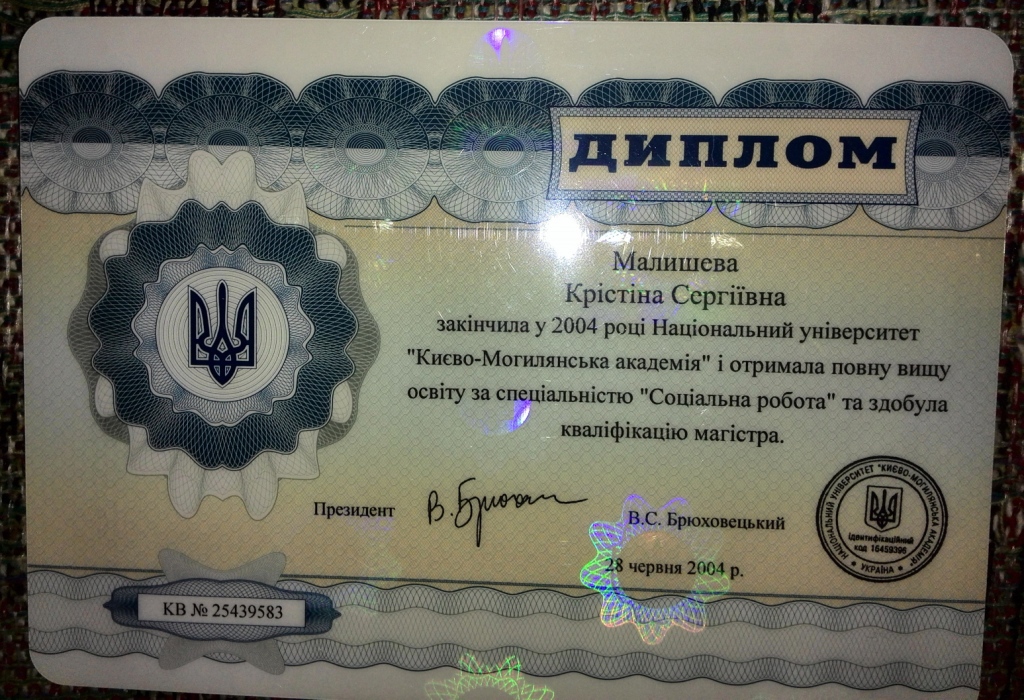 Национальный университет "Киево-Могилянская академия", специальность "Социальная политика/социальное управление", "Социальное консультирование", магистр социальной работы, 2002-2004 гг.