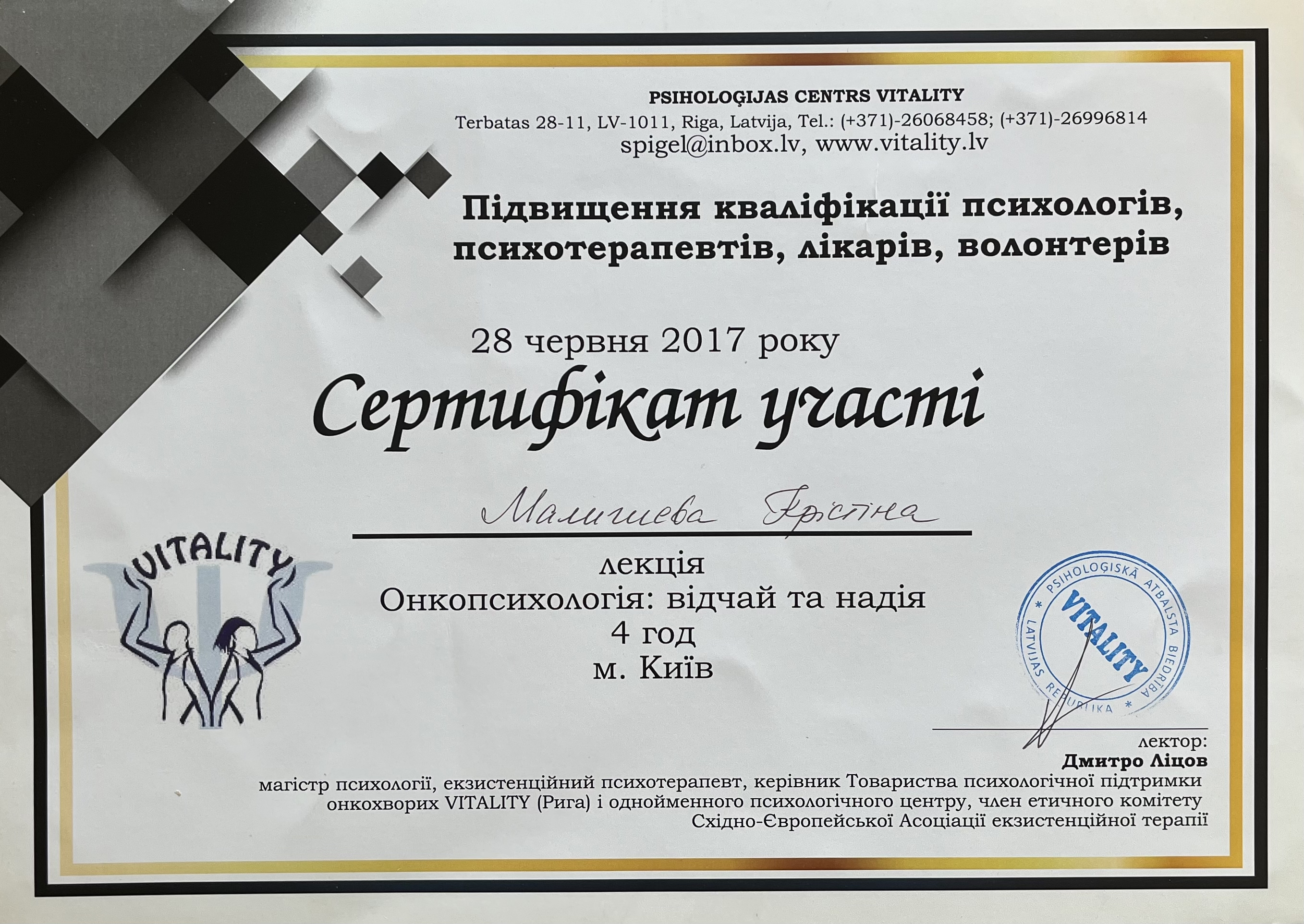 Практический семинар "Онкопсихология – точка опоры", Психологический центр "Vitality" (Рига), Киев, 28-29 июня 2017 (14 часов).