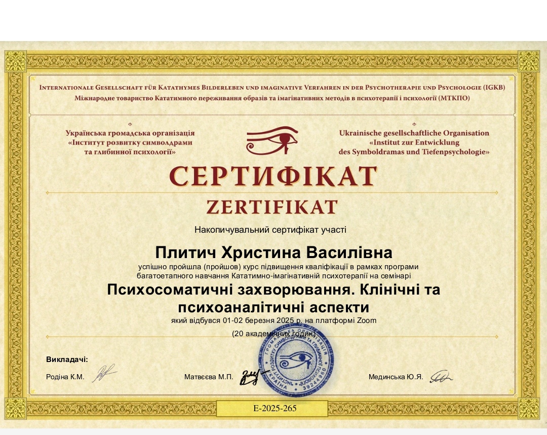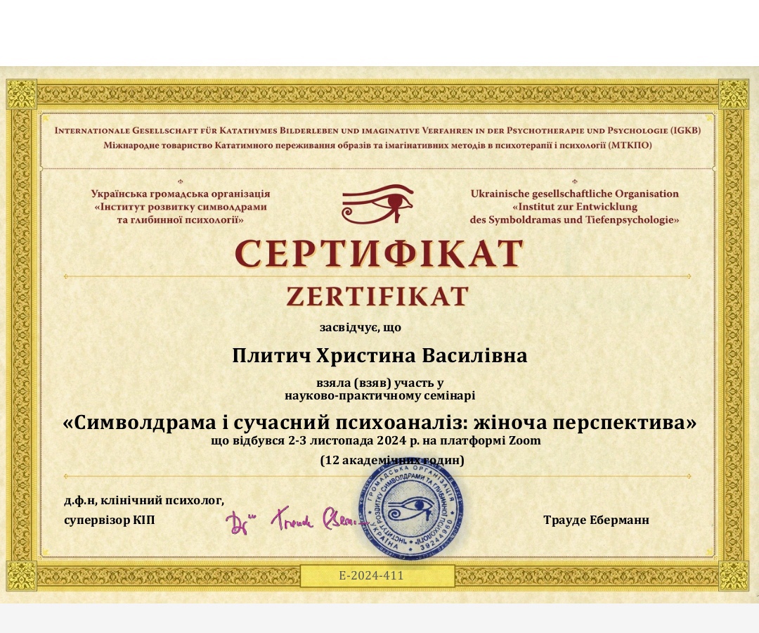 Інститут розвитку символдрами і глибинної психології (ІРСГП) Навчаюсь, кандидат в психотерапевти.