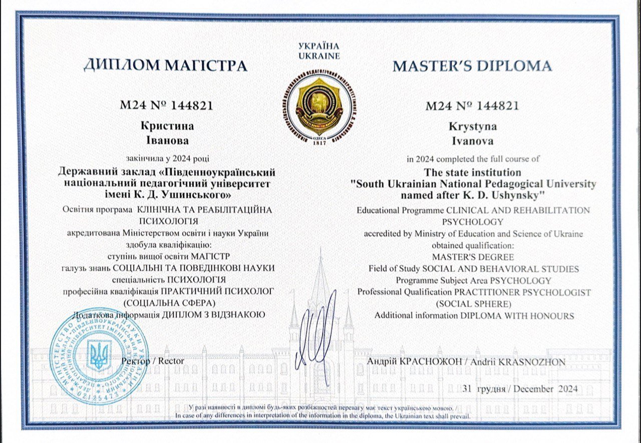 Магистр клинической и реабилитационной психологии в Южноукраинском национальном педагогическом университете имени К.Д. Ушинского.