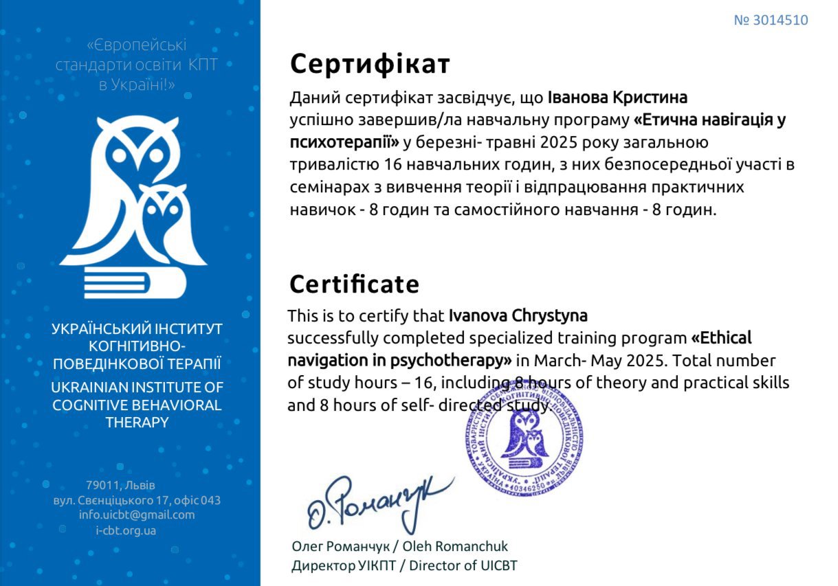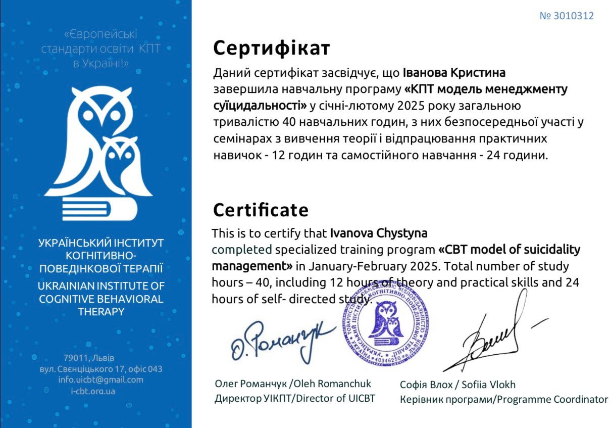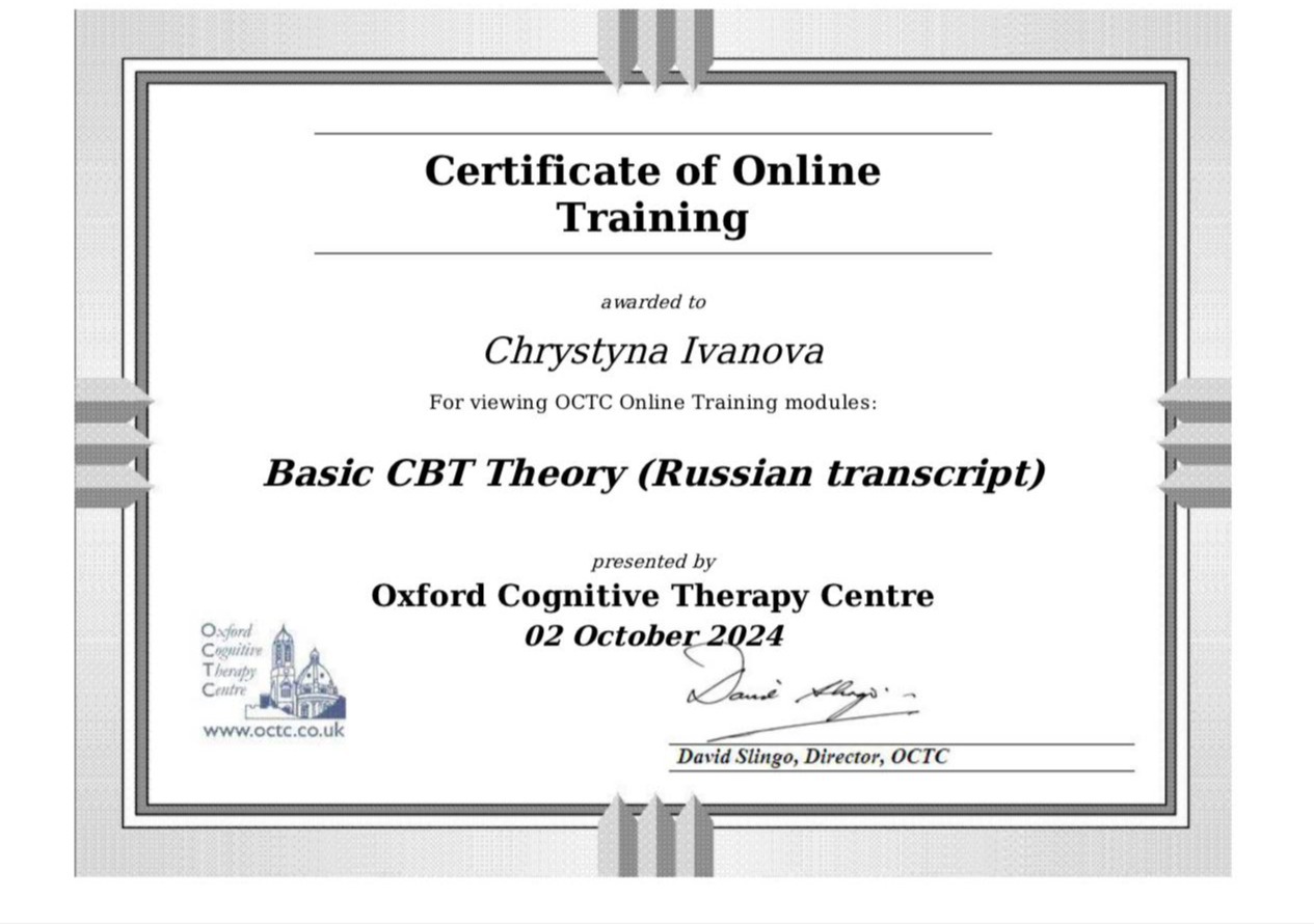 Мой профессиональный интерес сосредоточен на работе именно с психическими расстройствами, что предполагает повышенный уровень ответственности и требует постоянного обновления знаний. Я понимаю, что клиническая работа не допускает упрощений, шаблонных решений или опоры на интуицию без научной основы. Именно поэтому регулярное повышение квалификации для меня не формальность, а необходимое условие этической и эффективной практики.