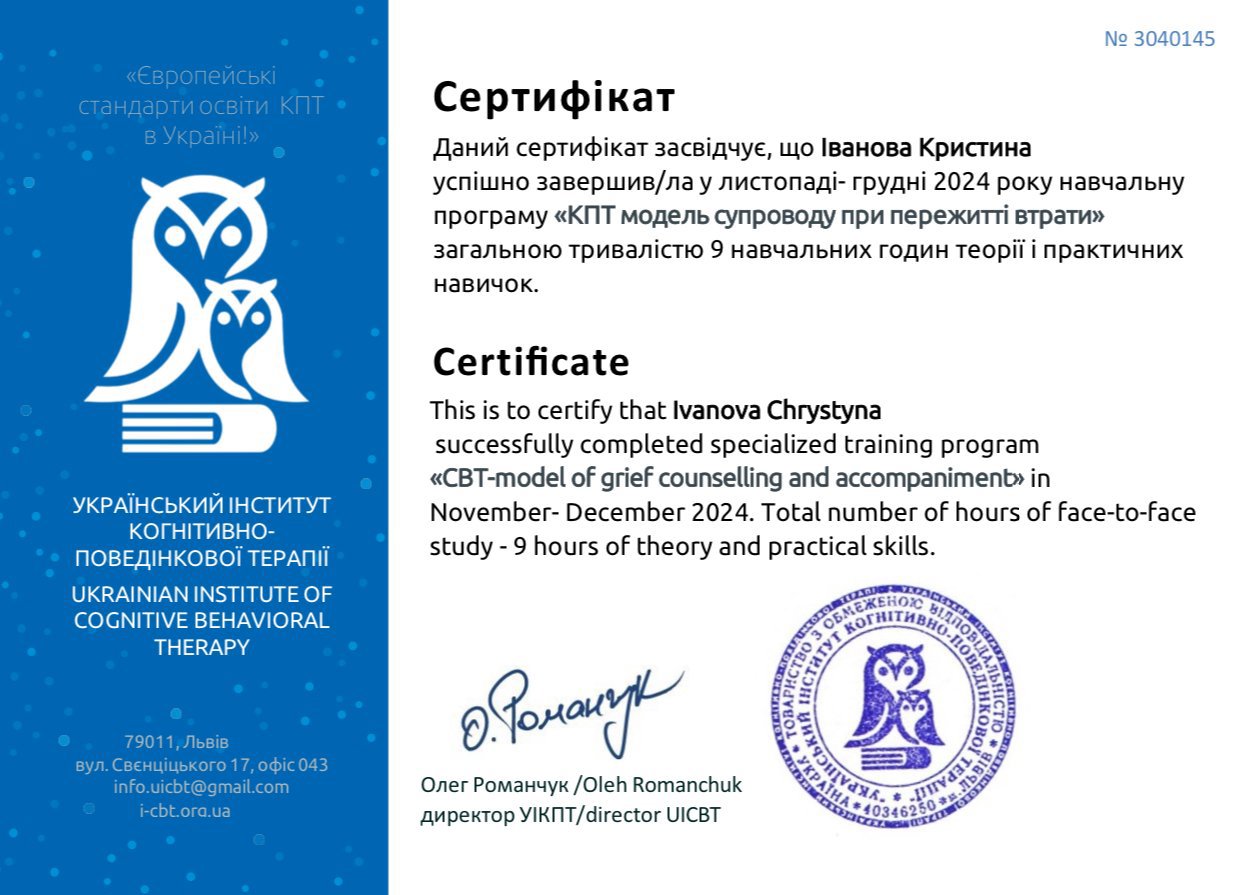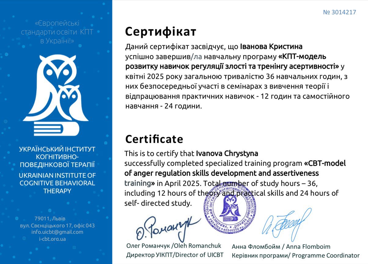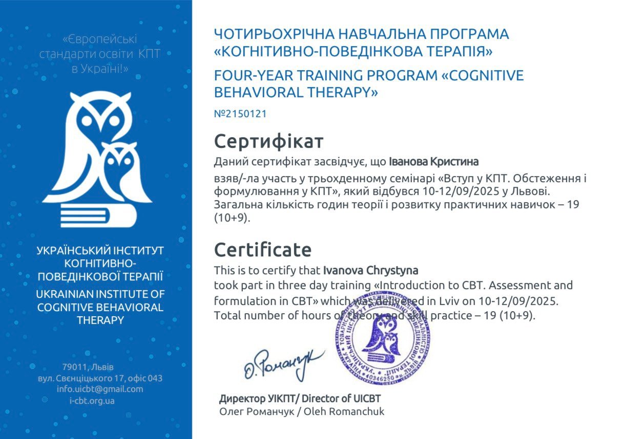 Мой профессиональный интерес сосредоточен на работе именно с психическими расстройствами, что предполагает повышенный уровень ответственности и требует постоянного обновления знаний. Я понимаю, что клиническая работа не допускает упрощений, шаблонных решений или опоры на интуицию без научной основы. Именно поэтому регулярное повышение квалификации для меня не формальность, а необходимое условие этической и эффективной практики.
