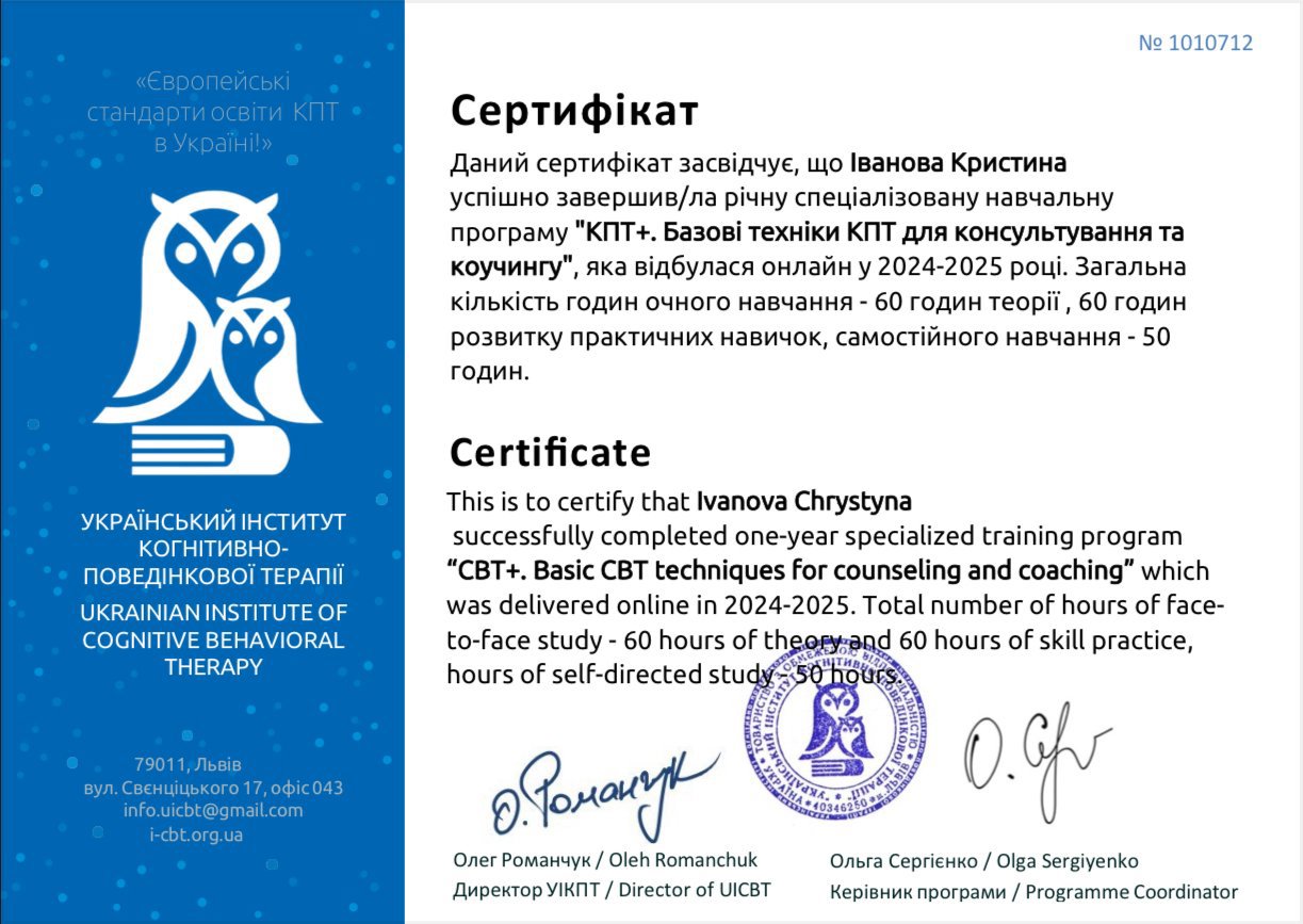 Терапия со мной - это структурированный, безопасный и живой процесс, в котором нет случайных разговоров «просто чтобы выговориться». Мы начинаем с четкого понимания запроса: что именно происходит в вашей жизни, какие повторяющиеся трудности, какие эмоции и мысли вас истощают. Я объясняю, как работает психика, чтобы вы понимали, что с вами происходит и почему. Без мистики, с опорой на науку и логику.