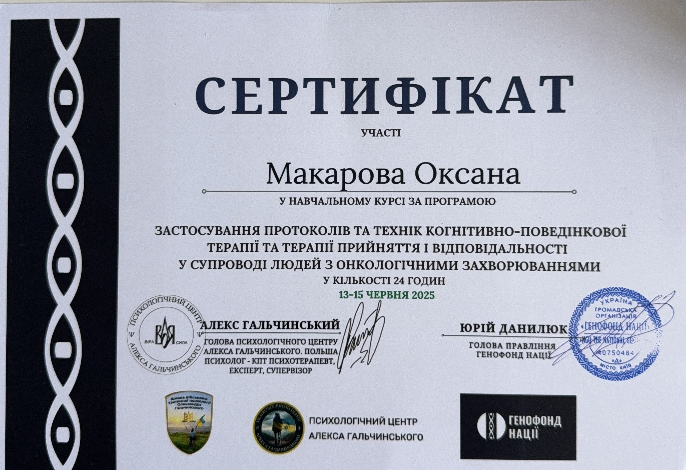 Училась МАУП, в КИГИП. Имею специализацию – Психотравма и ПТСР. Работа с разными видами травм. . И специализацию – Работа с семьей в Гештальт-подходе. Продолжайте совершенствовать свои навыки и расширять свои знания. Посещаю конференции, лекции, семинары.