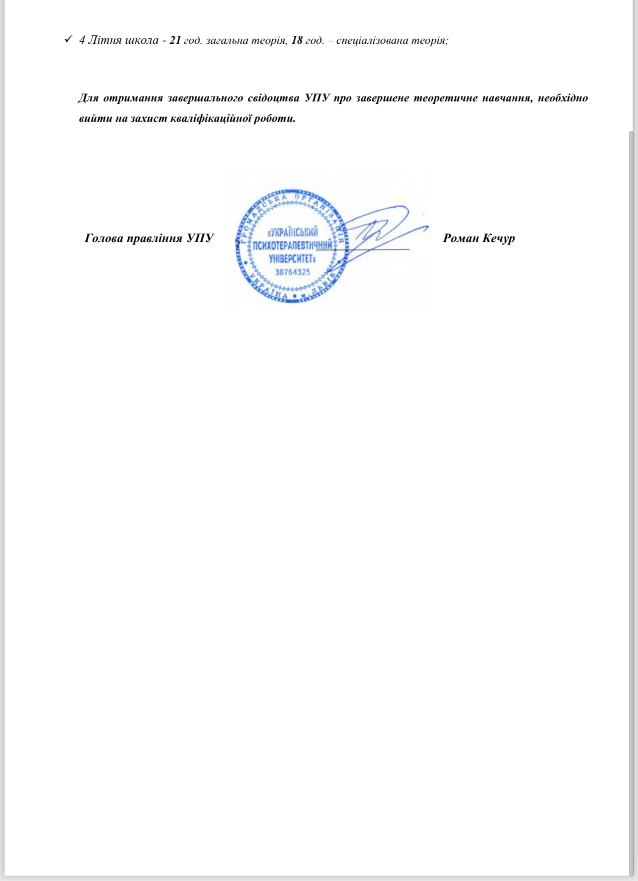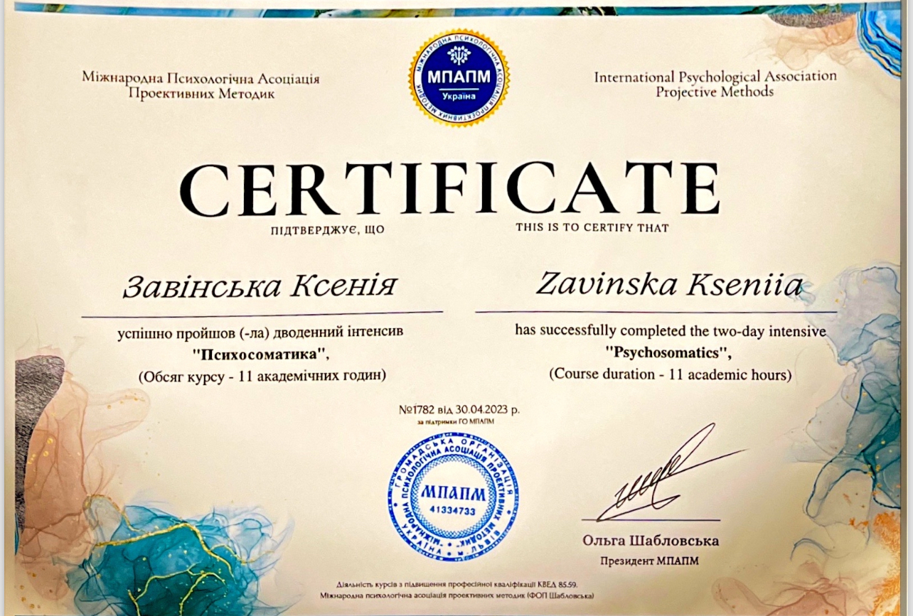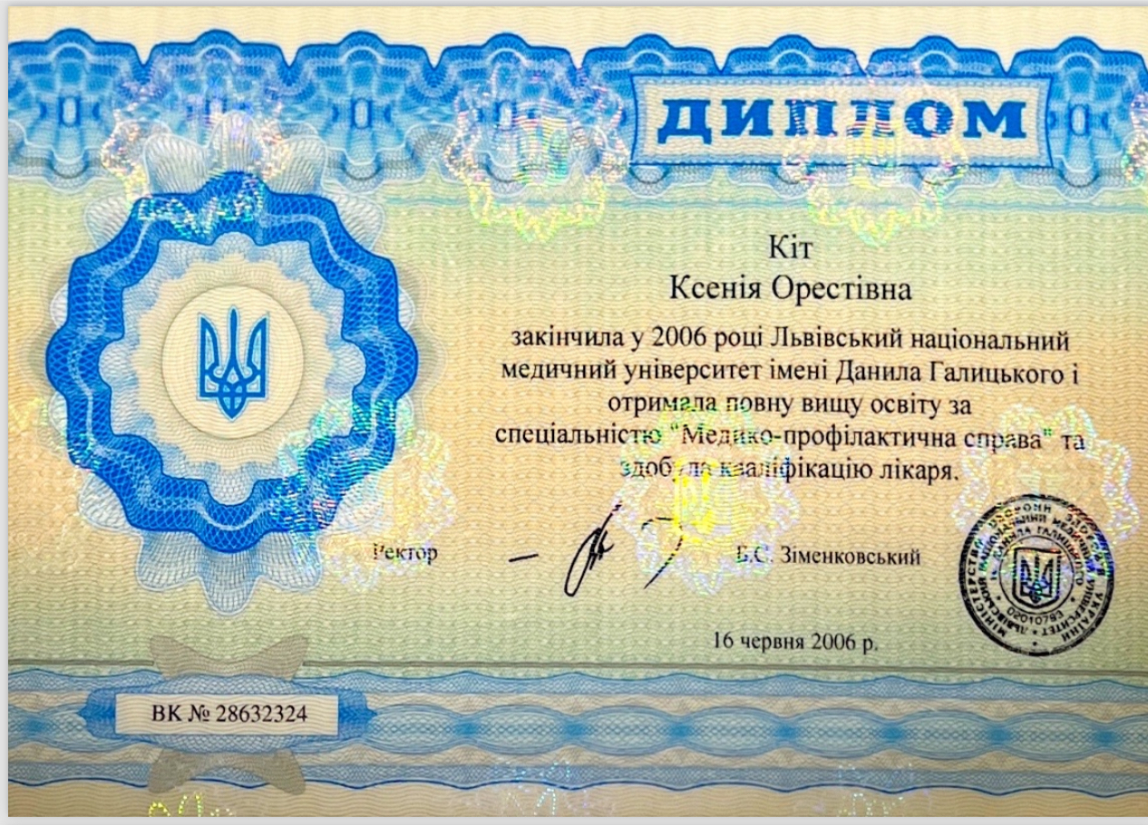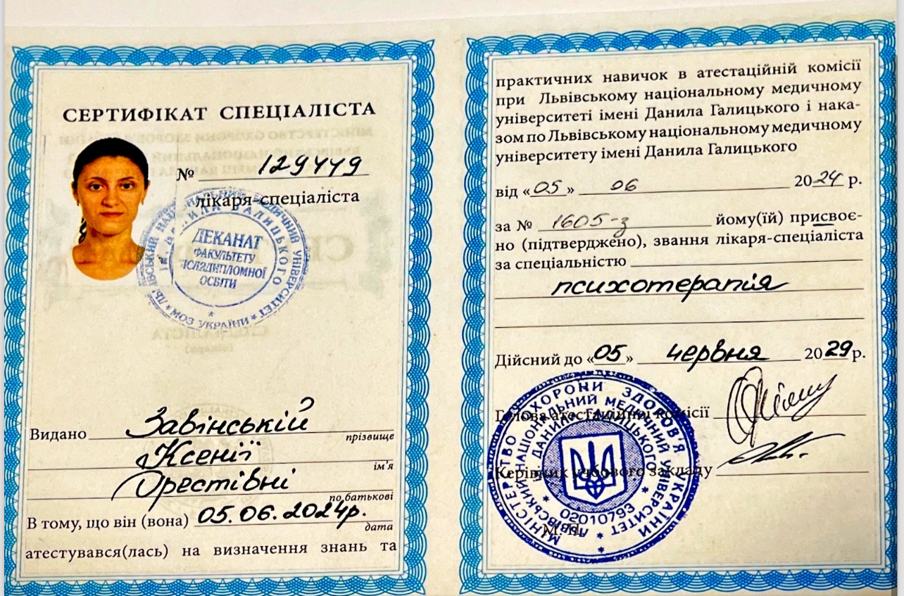 Прошла специализацию в ЛНМУ и получила звание врача-специалиста по специальности психотерапия.