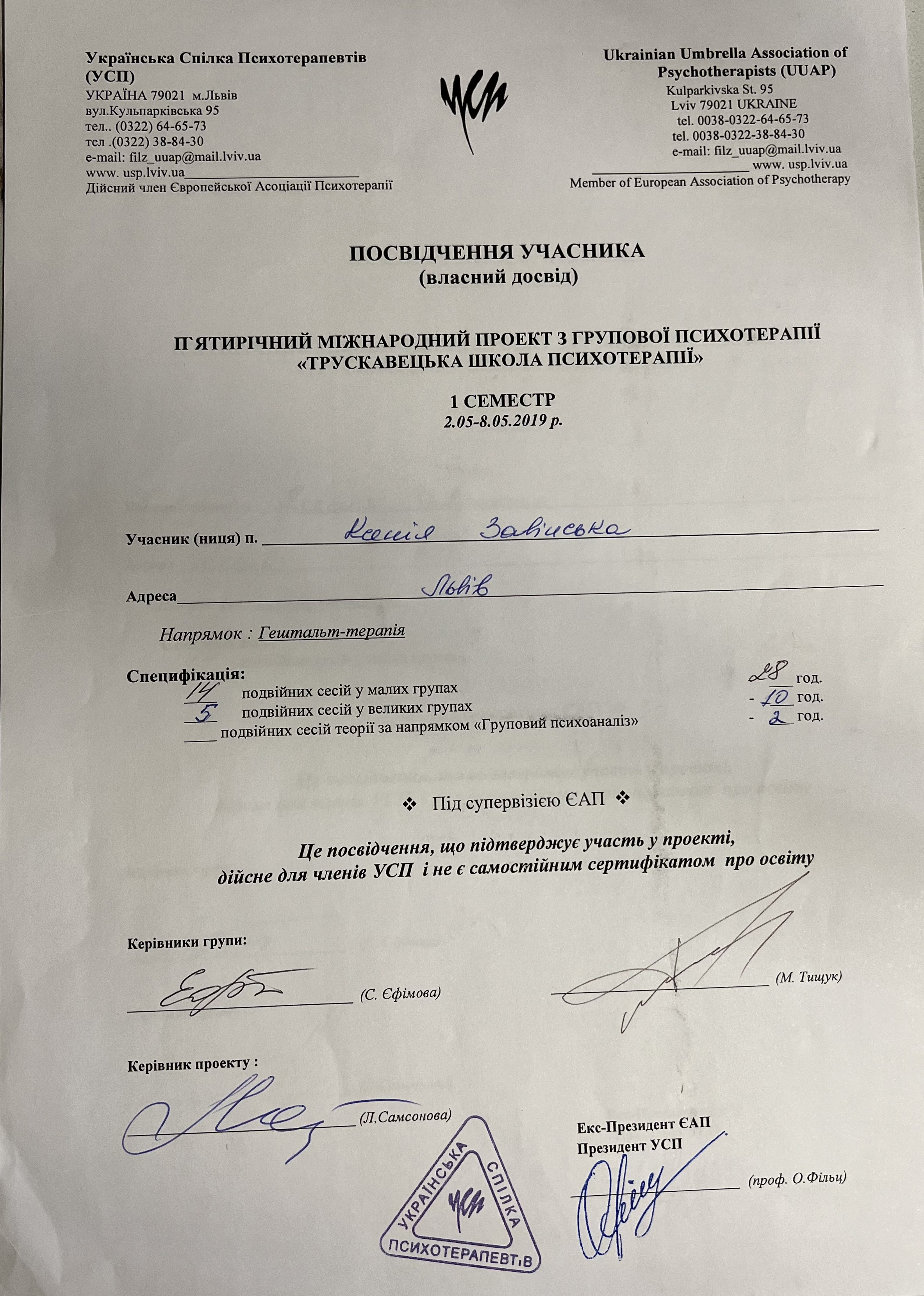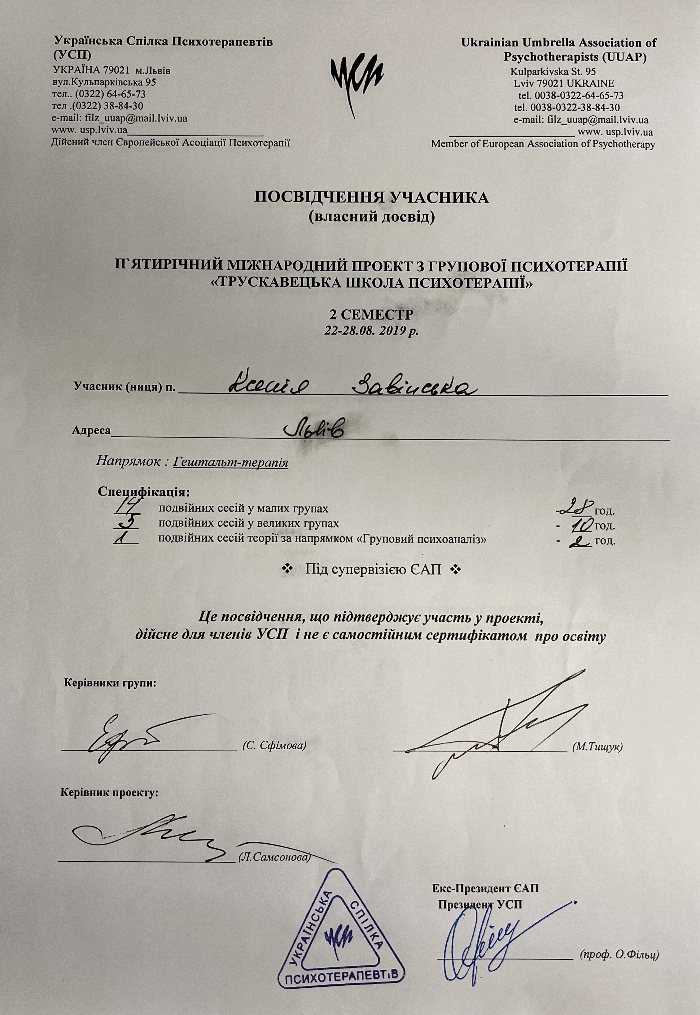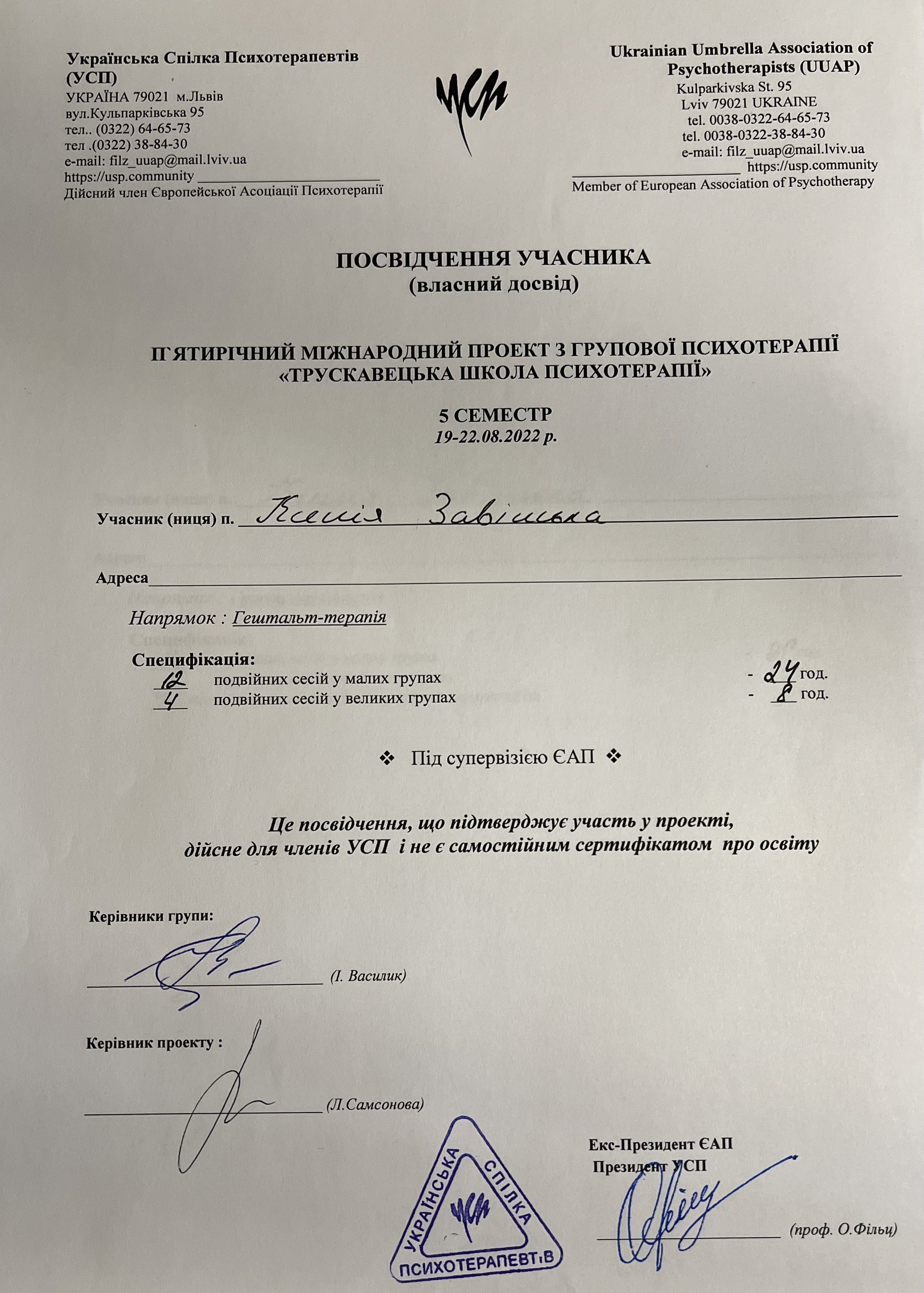 Участие в международном проекте по групповой психотерапии «Трускавецкая школа психотерапии» направление гештальт