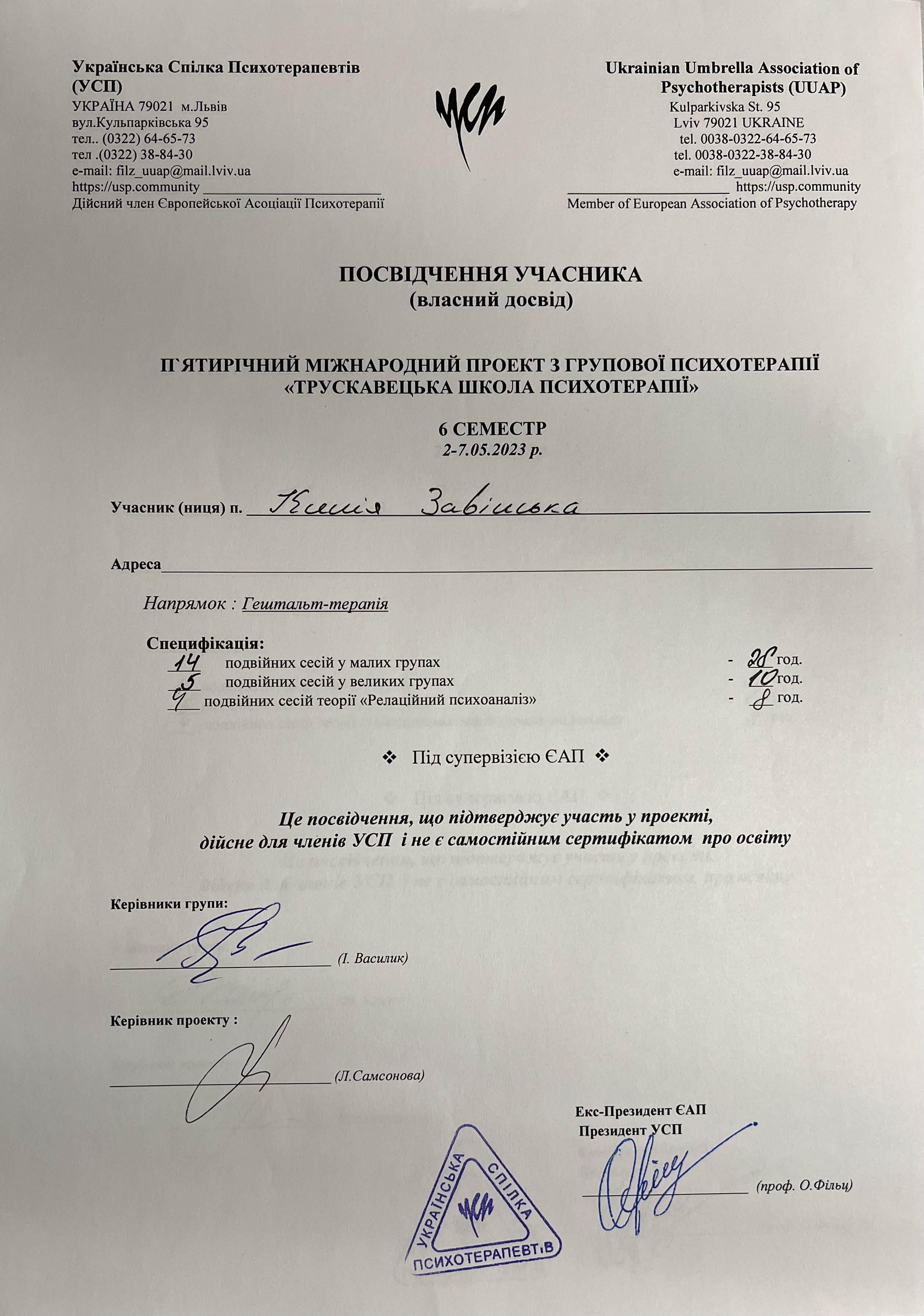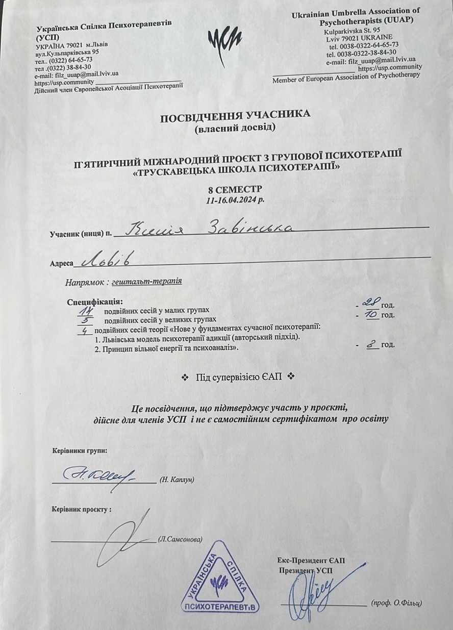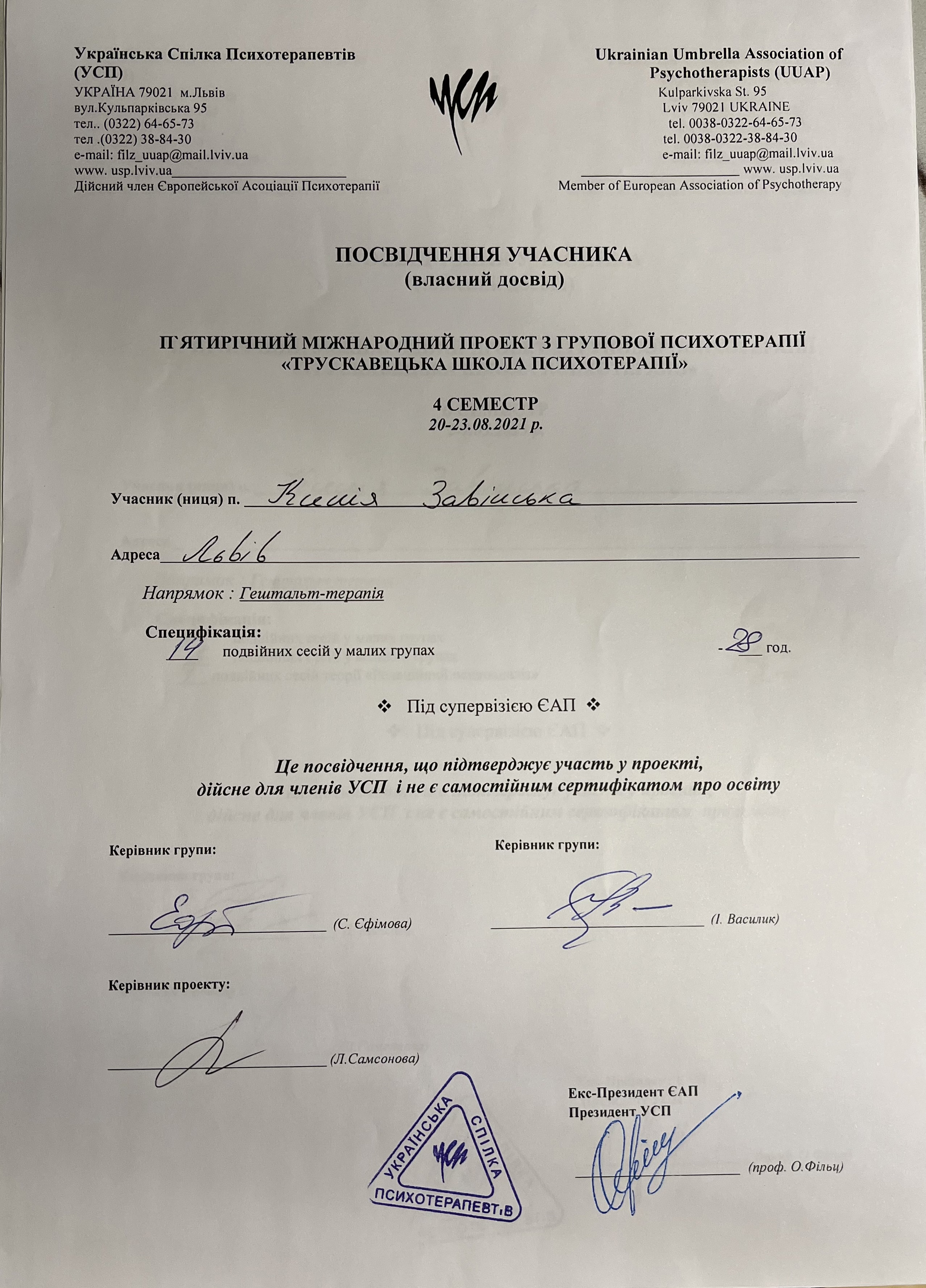 Участие в международном проекте по групповой психотерапии «Трускавецкая школа психотерапии» направление гештальт