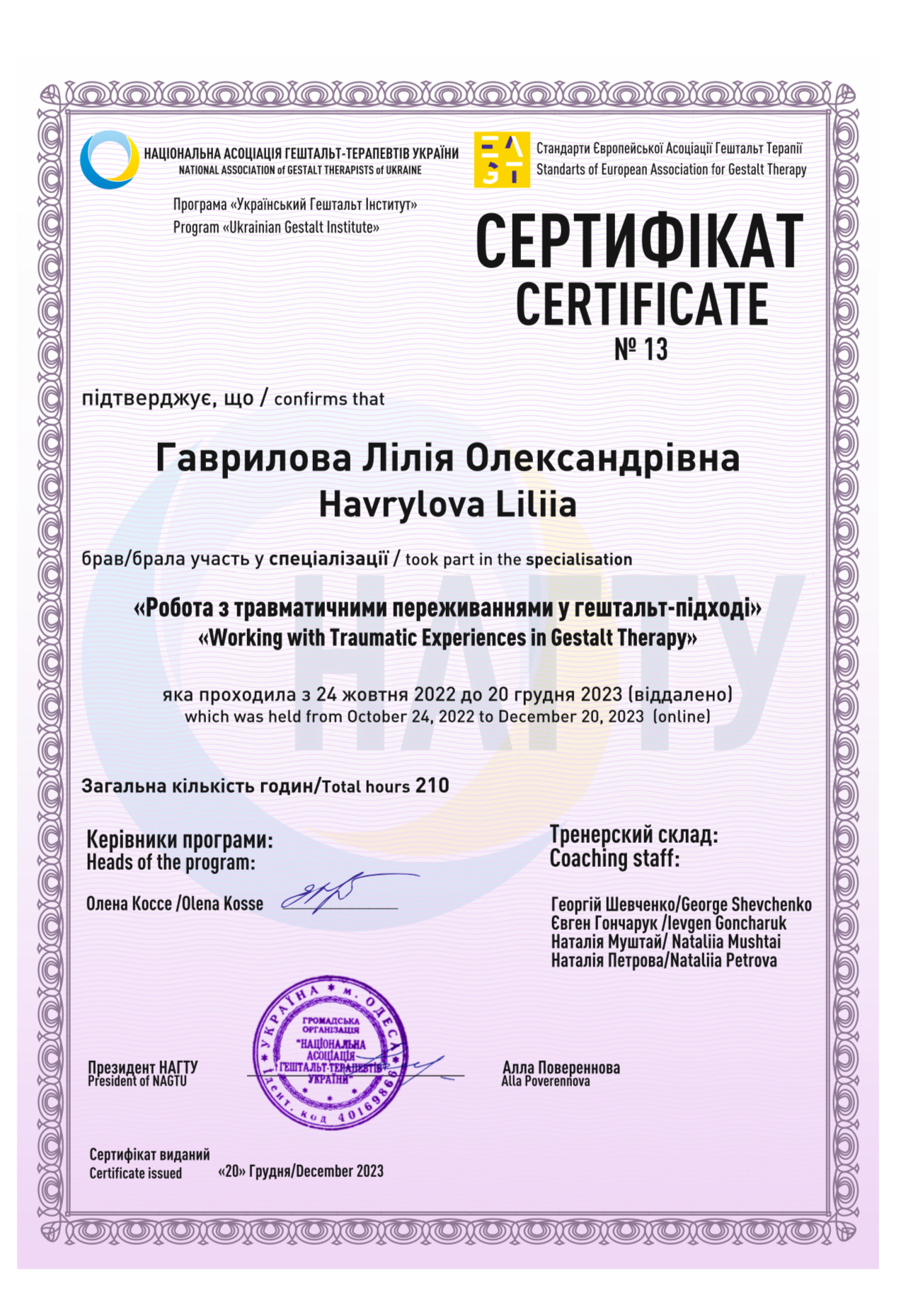 НАГТУ - гештальт терапевт, специализация - Психотерапия кризисов и травмы, УСП - специализация Консультирование детей, подростков и родителей, Психосоматика. Нейропсихология.