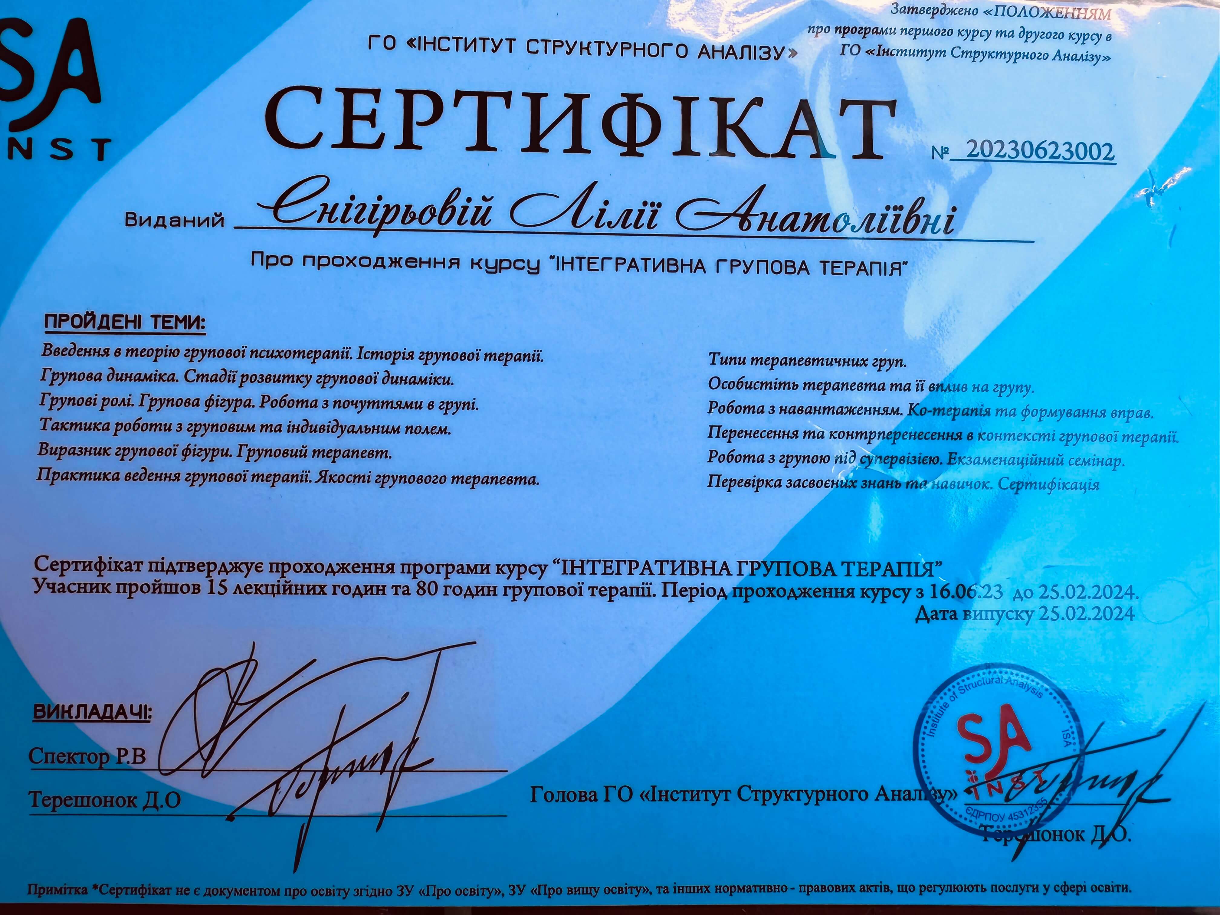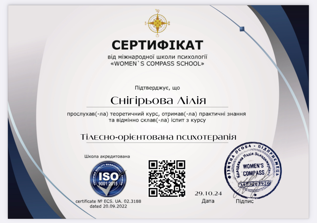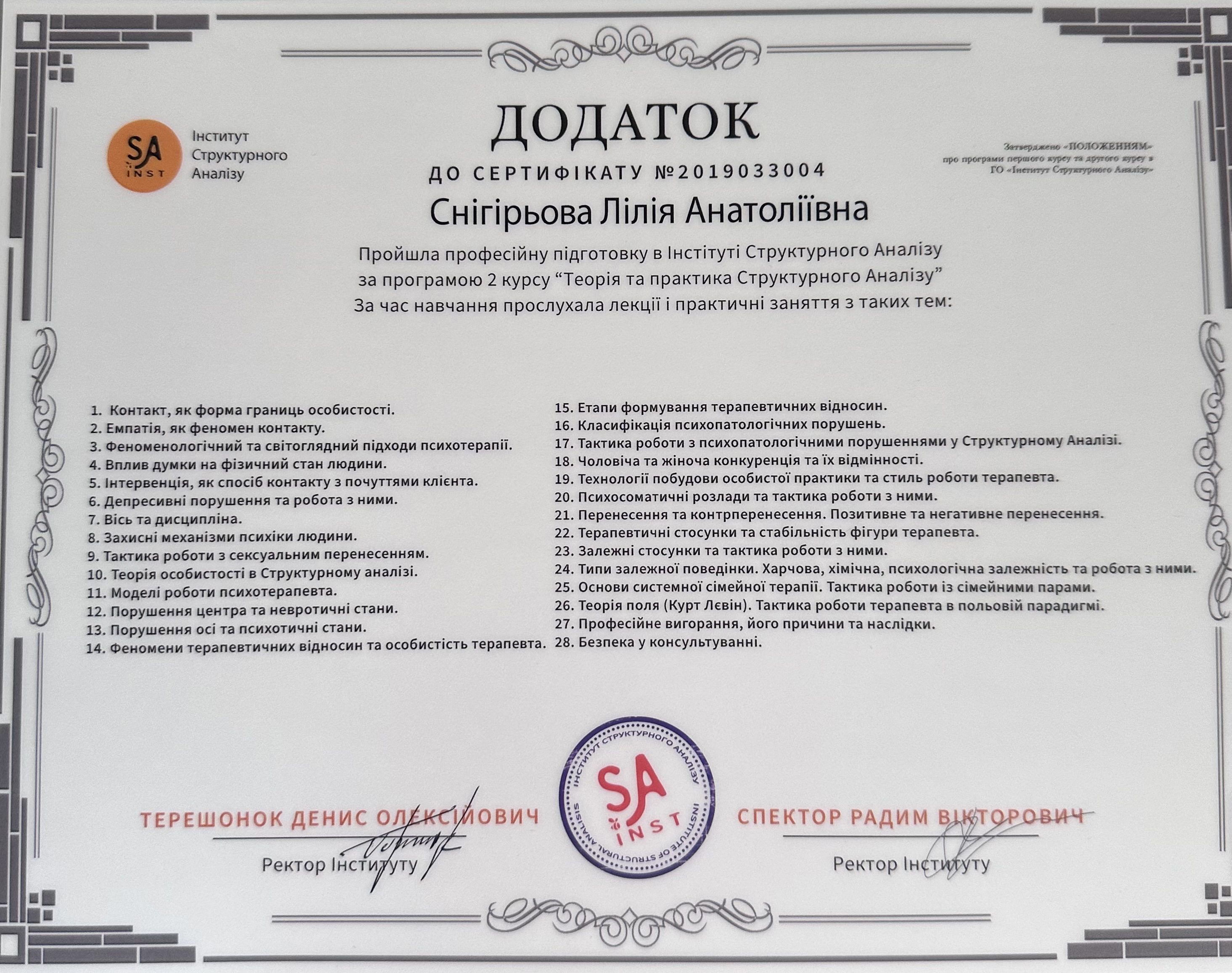 Я, Лилия Снегирева, психолог, психотерапевт. Работаю в методе "Структурный анализ". С уважением и интересом отношусь к каждому запросу, внимательна к деталям, вежлива и ответственна. Меня очень вдохновляет моя профессия, я постоянно нахожусь в развитии и совершенствовании профессиональных навыков. Кроме работы я увлекаюсь спортивной гимнастикой, потому что считаю, что в жизни очень важен баланс и что в здоровом теле зрительный дух.