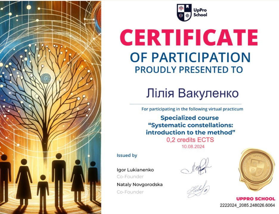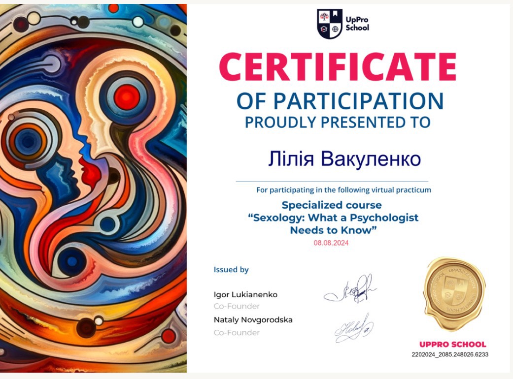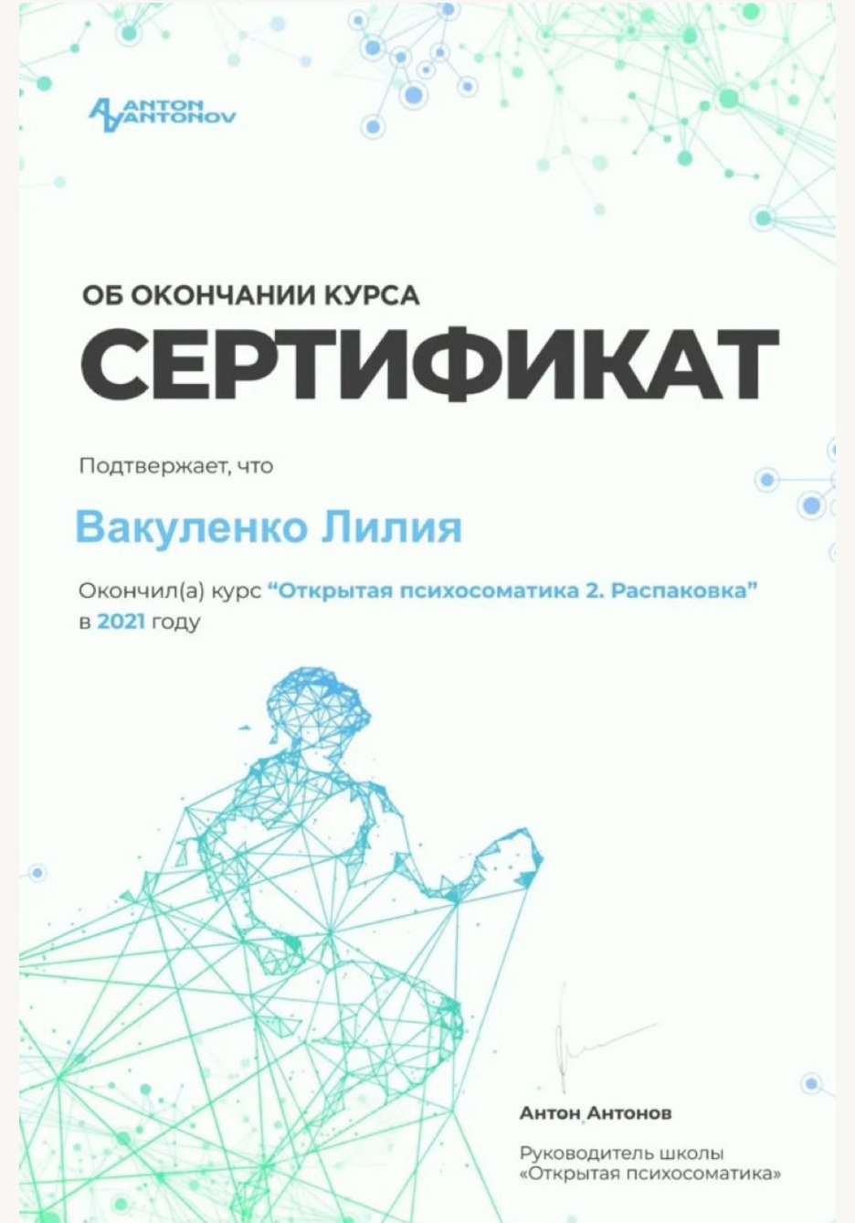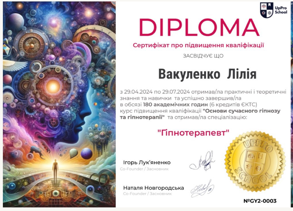 Я окончила Классический частный университет г. магистр психологии, сертификация гипнотерапевта в UpPro School, сертификация психосиматики в методе Psy2.0, сейчас прохожу обучение клинической психологии и коучингу