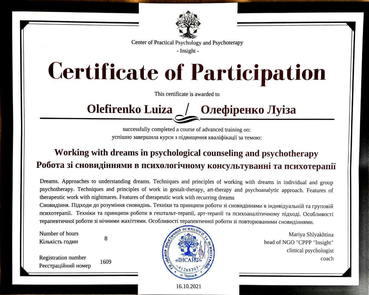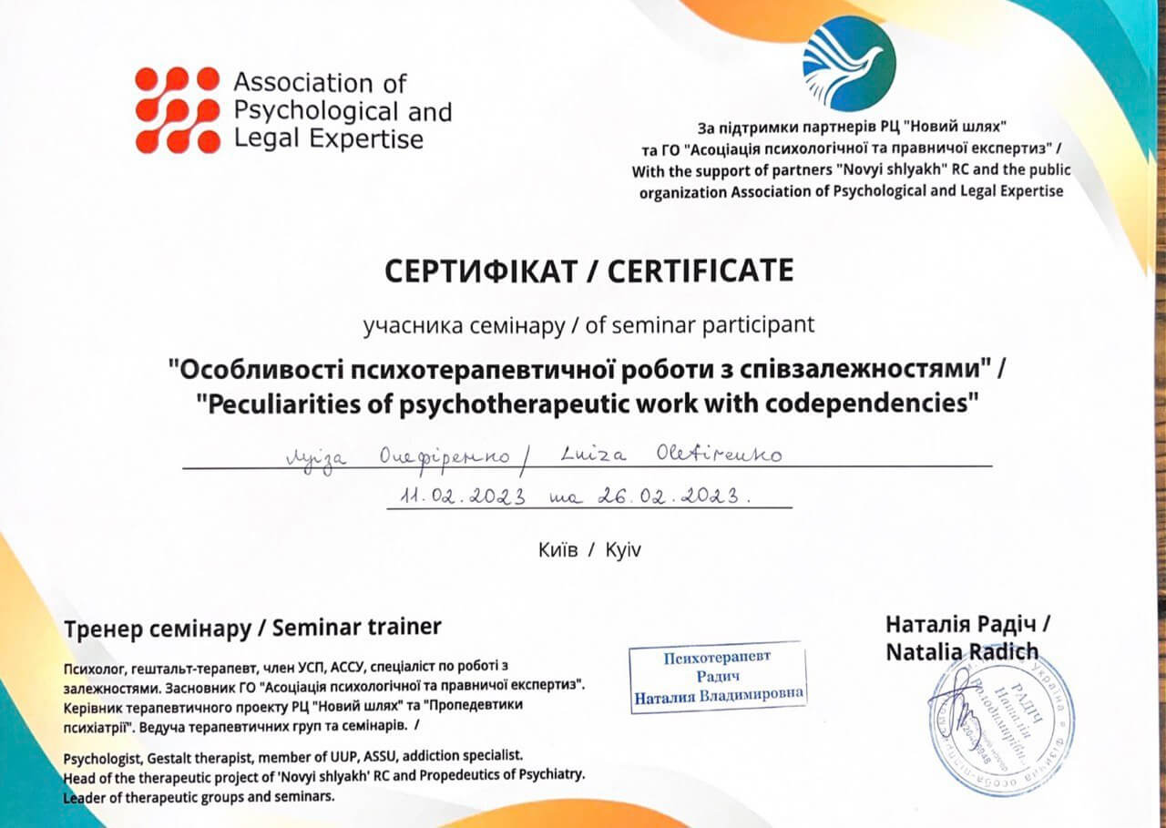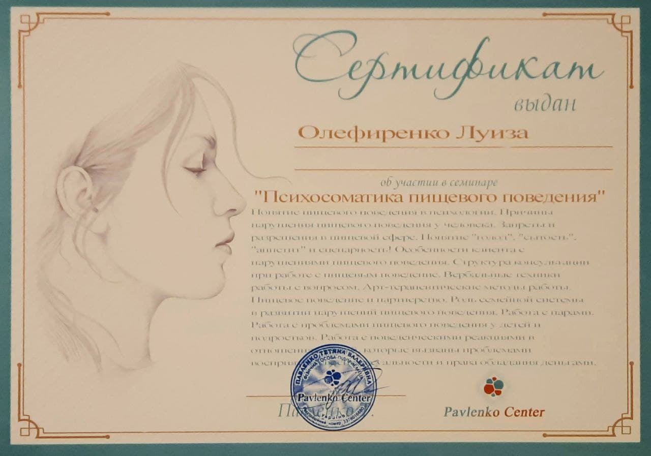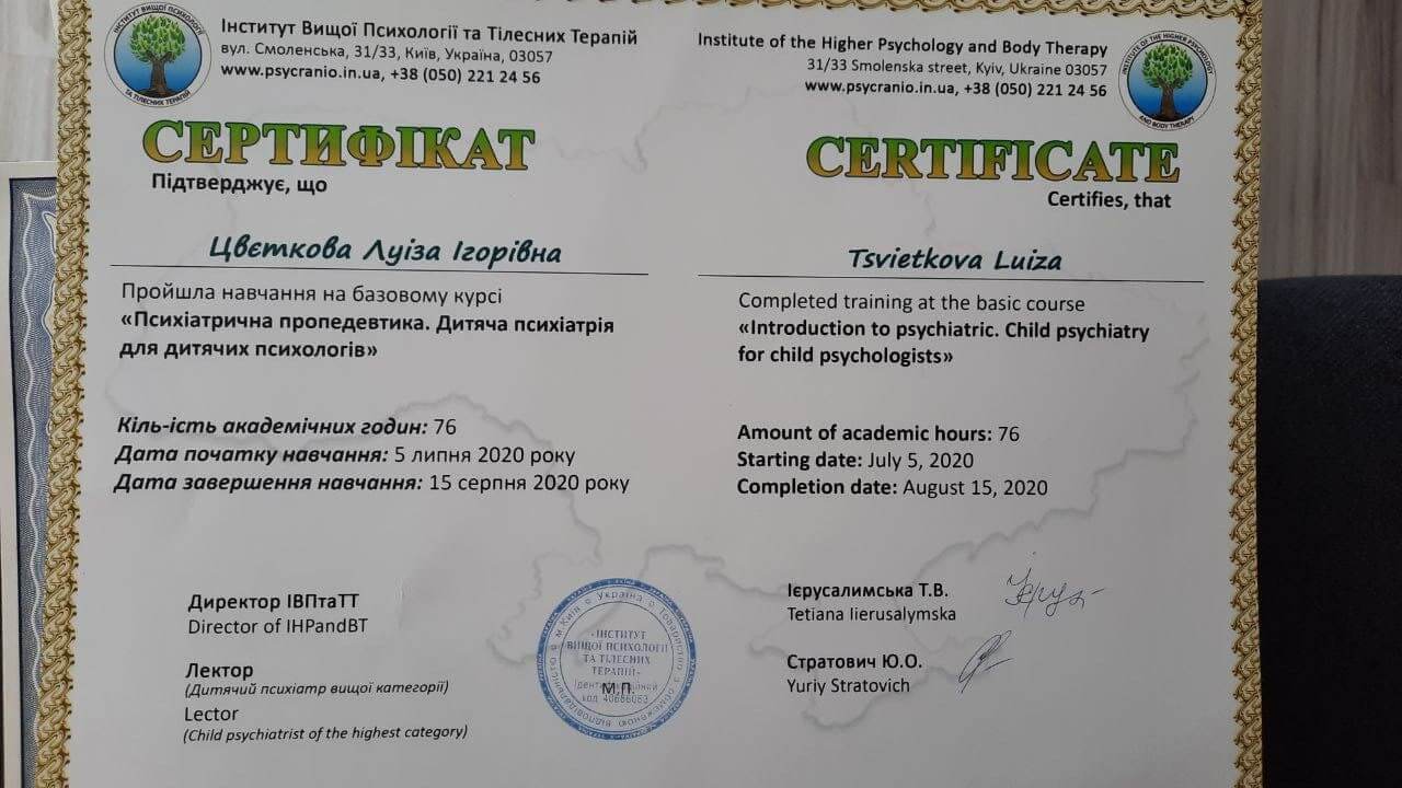 3. Повышение квалификации «Психіатрична пропедевтика. Дитяча психіатрія для дитячих психологів», Институт высшей психологии и телесных терапий.