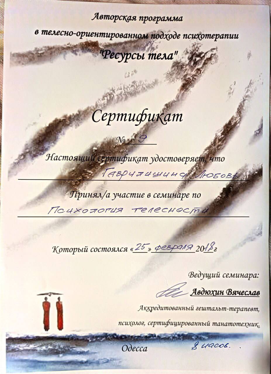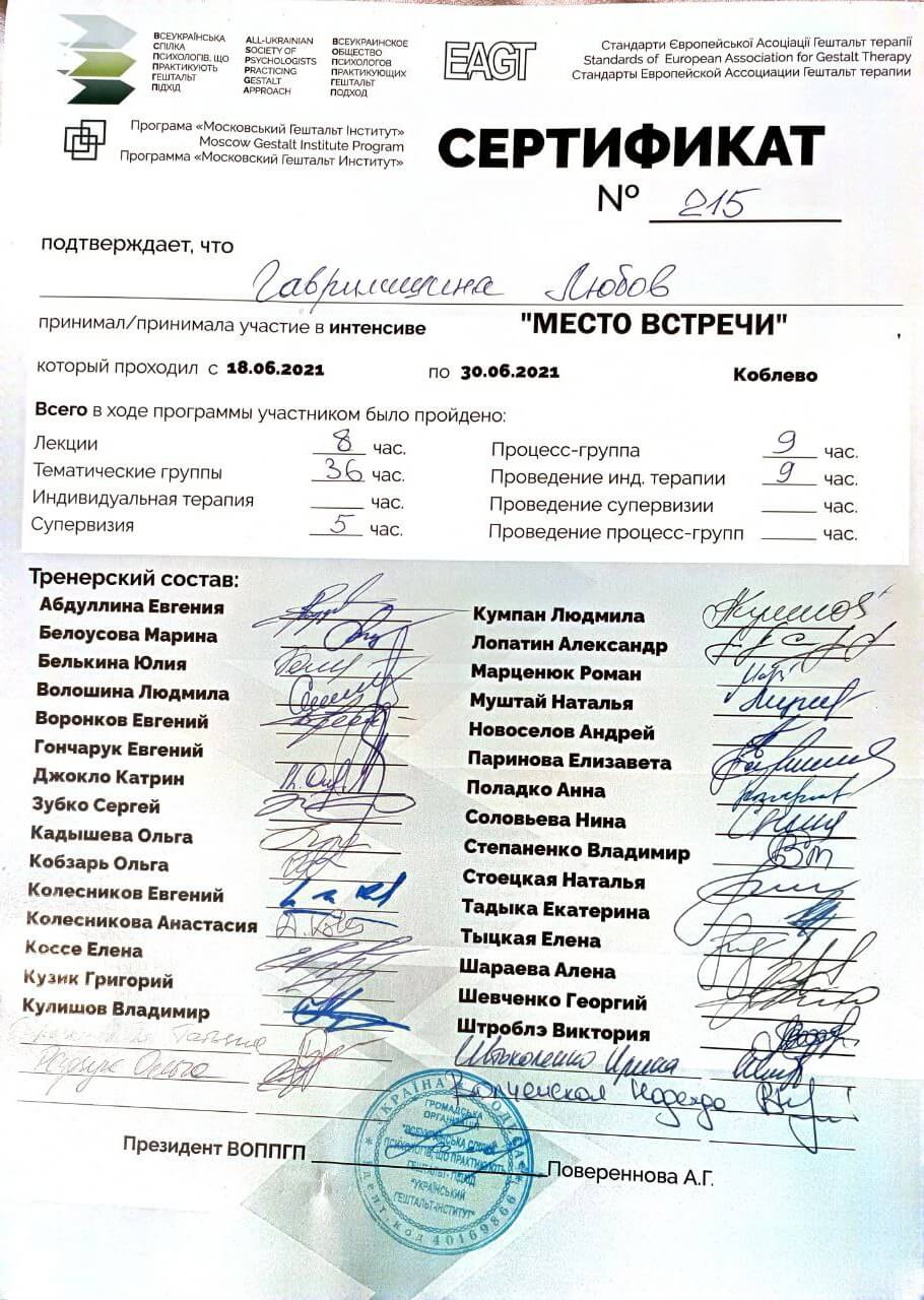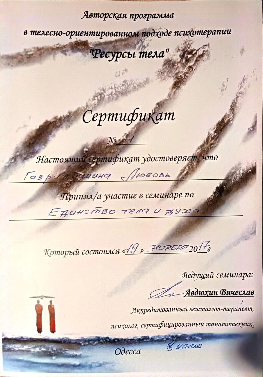 Окончила Одесский государственный университет по специальности "украинский язык и литература", аспирантуру по этой же специальности в вышеназванном вузе. Сертифицировалась в учебной программе по психологии "Теория и практика гештальт-терапии" НАГТУ, специализации "Гештальт-терапия в работе с детьми", "Гештальт-терапия и система подхода в работе с семьей", лекционный курс "Психиатрия для психологов" семинар "Основы консультирования ЛГБТ. Сексуальная вариативность", участвовала в работе конференций "Клинический подход в гештальт-терапии" и Рижского гештальт-института, в авторских семинарах "Психология телесности".