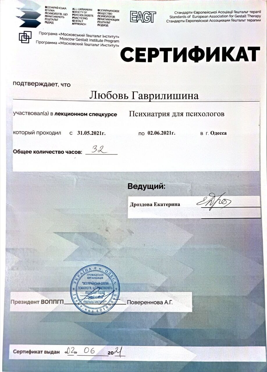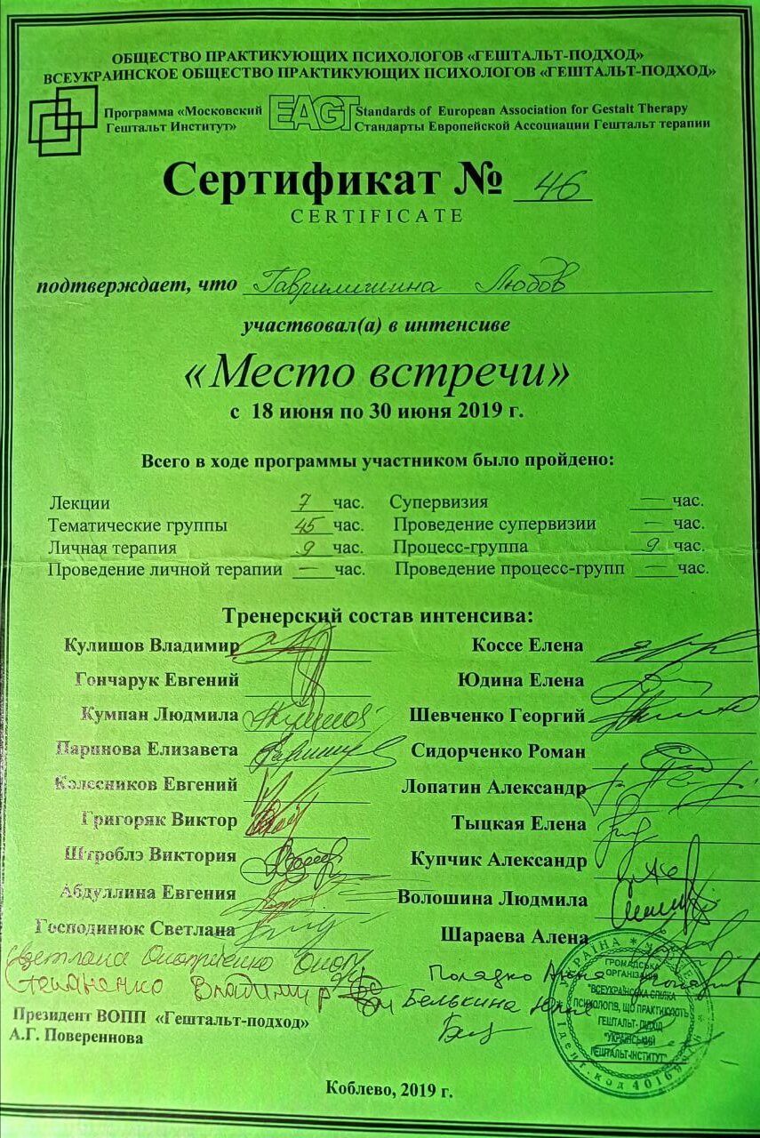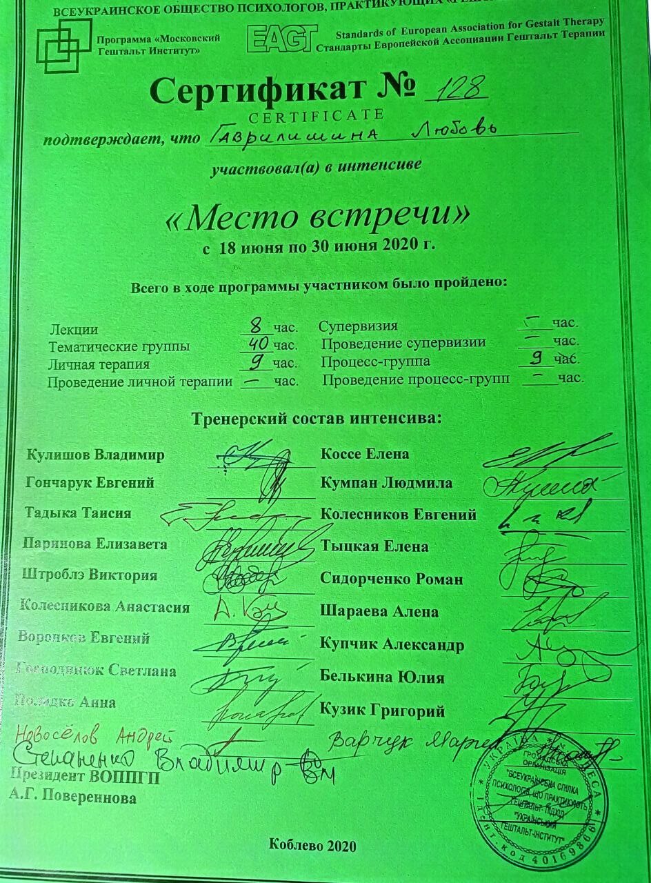 Окончила Одесский государственный университет по специальности "украинский язык и литература", аспирантуру по этой же специальности в вышеназванном вузе. Сертифицировалась в учебной программе по психологии "Теория и практика гештальт-терапии" НАГТУ, специализации "Гештальт-терапия в работе с детьми", "Гештальт-терапия и система подхода в работе с семьей", лекционный курс "Психиатрия для психологов" семинар "Основы консультирования ЛГБТ. Сексуальная вариативность", участвовала в работе конференций "Клинический подход в гештальт-терапии" и Рижского гештальт-института, в авторских семинарах "Психология телесности".