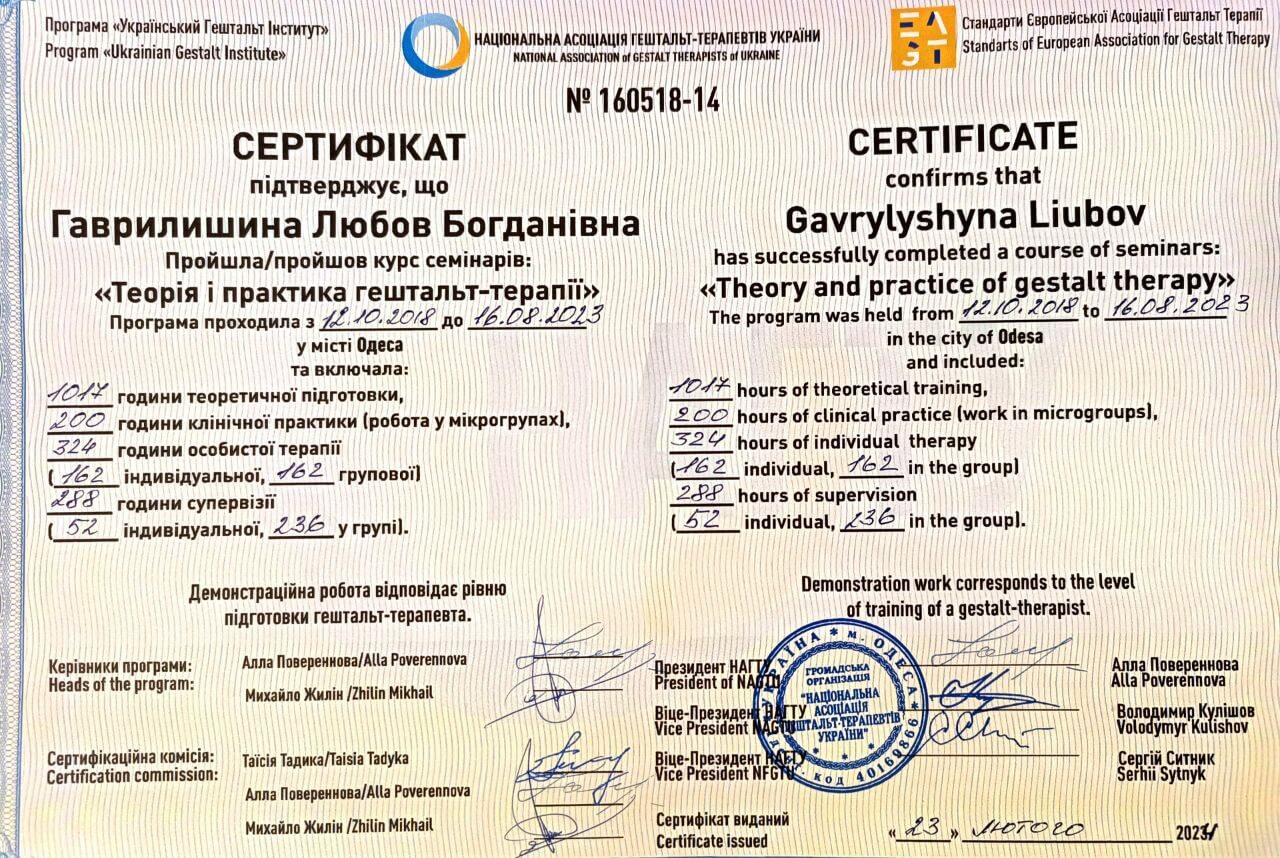 Я внимательный и отзывчивый, глубокий, эмпатический, ответственный и творческий человек. Мои ценности – свобода, качество работы, честность, искренний интерес к делу, которым восхищаюсь. Я люблю дело, в котором работаю. В психологию пришла 12 лет назад, отыскивая ответ на вопрос: "Как не испытывать боли?". Люблю читать и обсуждать книги, обожаю кино, хожу на книгоклуб, а до войны организовывали взрослые и детские киноклубы. Последний год совместно с коллегой вела языковой клуб с целью помочь людям заговорить на украинском языке. Люблю классическую и современную музыку. Фотографирую и все еще мечтаю стать фотографом. Счастливая в отношениях с любимым мужчиной. Имею четырех кошек.