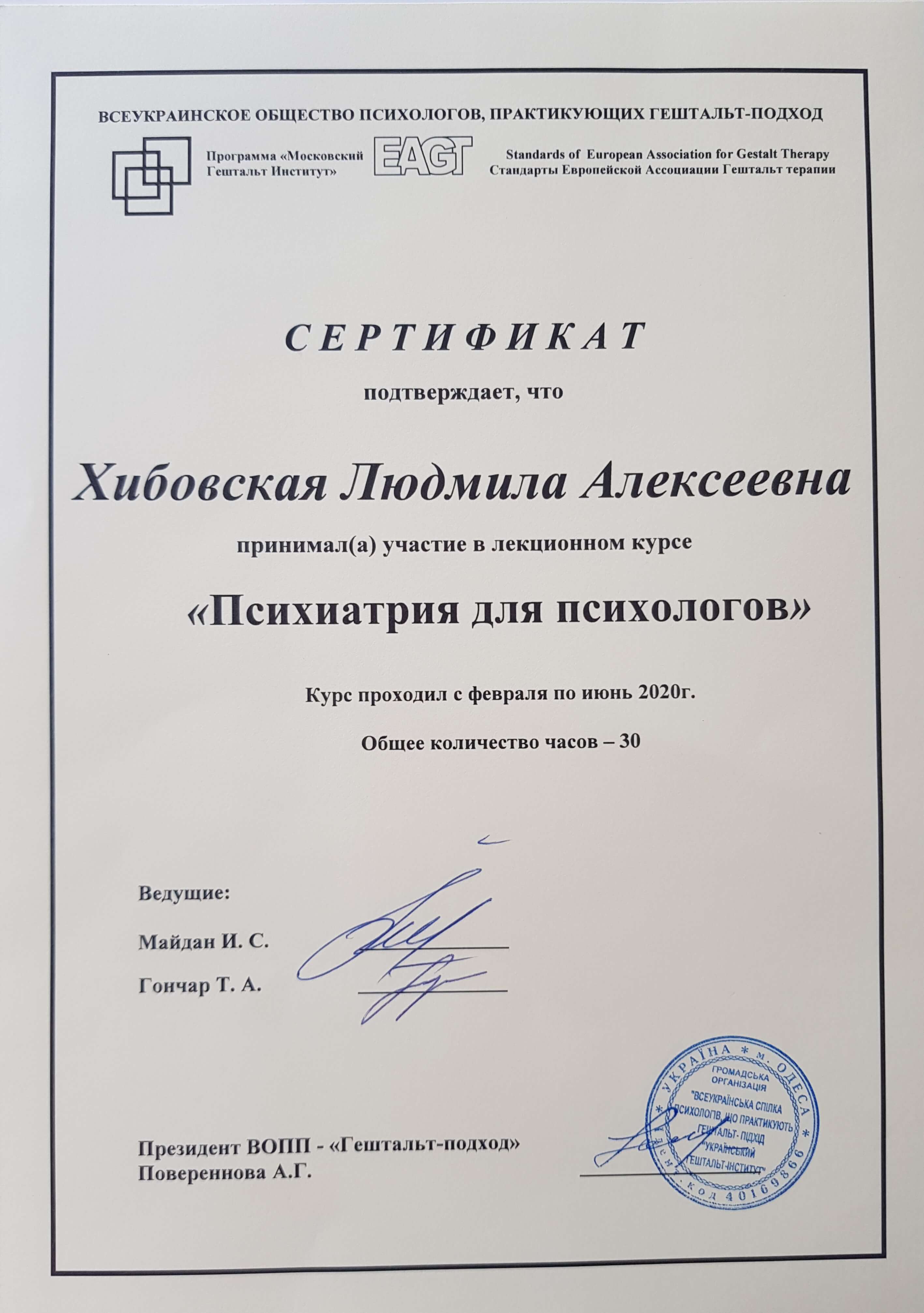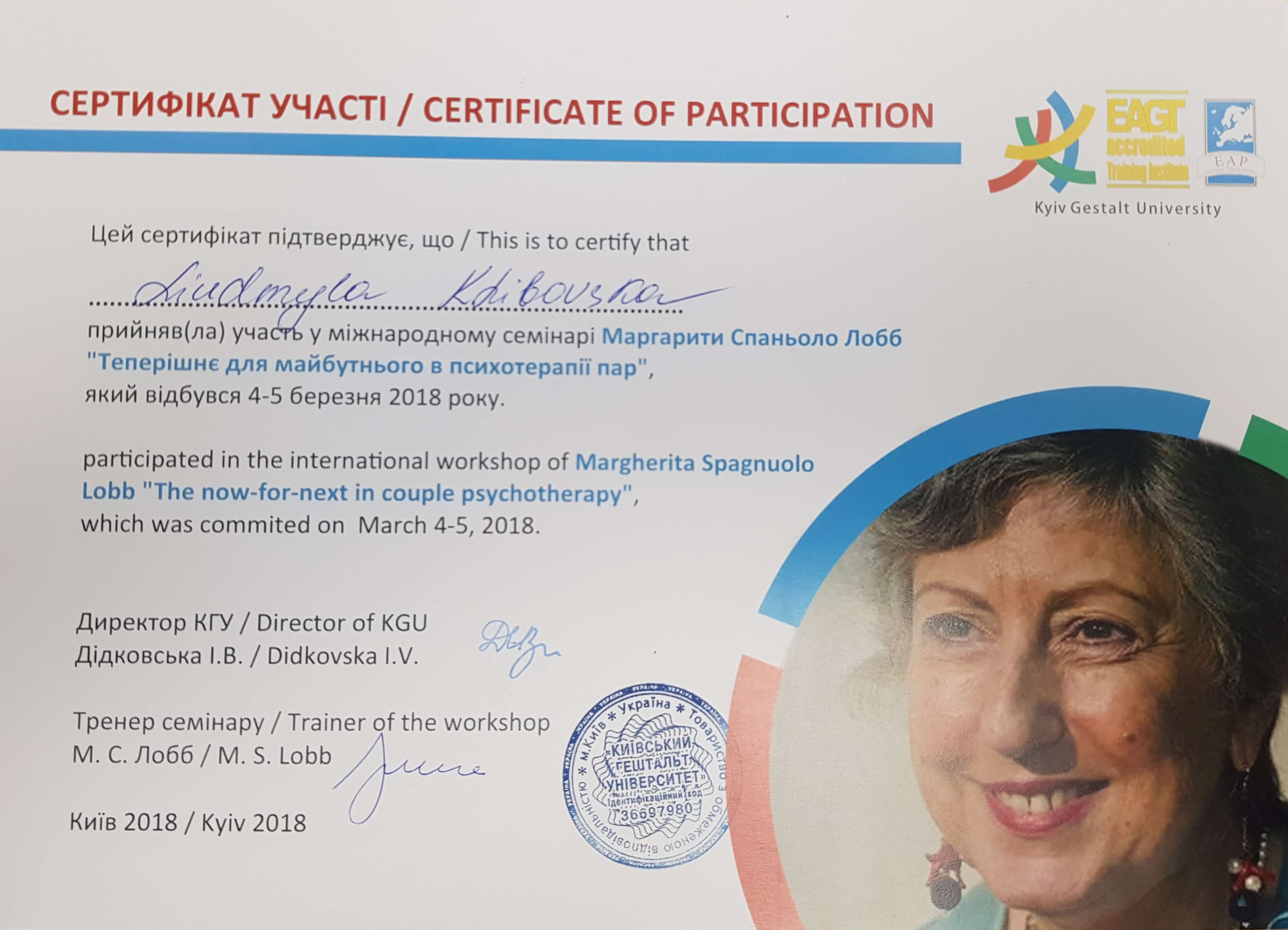 Активная, энергичная, постоянно учусь и развиваюсь. Прошла и прохожу много курсов, тренингов и семинаров отечественных и зарубежных специалистов. Внимательная, чуткая и бережная. Поддерживающая, вдохновляющая, с богатым личным и профессиональным опытом. С юных лет психология мой верный спутник. 12 лет работала зам.директора по персоналу в большой компании Киева. Желание развиваться привело меня в Киевский Гештальт Университет, который успешно закончила. Совершенствую английский язык в психотерапии. Посещала в Великобритании CAVENDISH SCHOOL. Замужем 35 лет. Две взрослых дочери, два внука. Люблю жизнь, люблю путешествовать, знакомиться с людьми. Увлекаюсь пилатесом, посещаю бассейн. Пешеходные треки - Карпаты, Гималаи, Фанские горы, Кавказ, Крым.