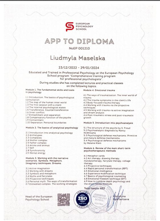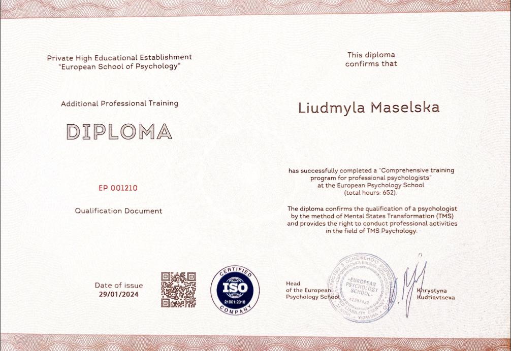 Психология - мое второе высшее: магистратура Киевского национального университета имени Тараса Шевченко, диплом с отличием "Психология семьи с основами психотерапии", 2022-2024 гг.