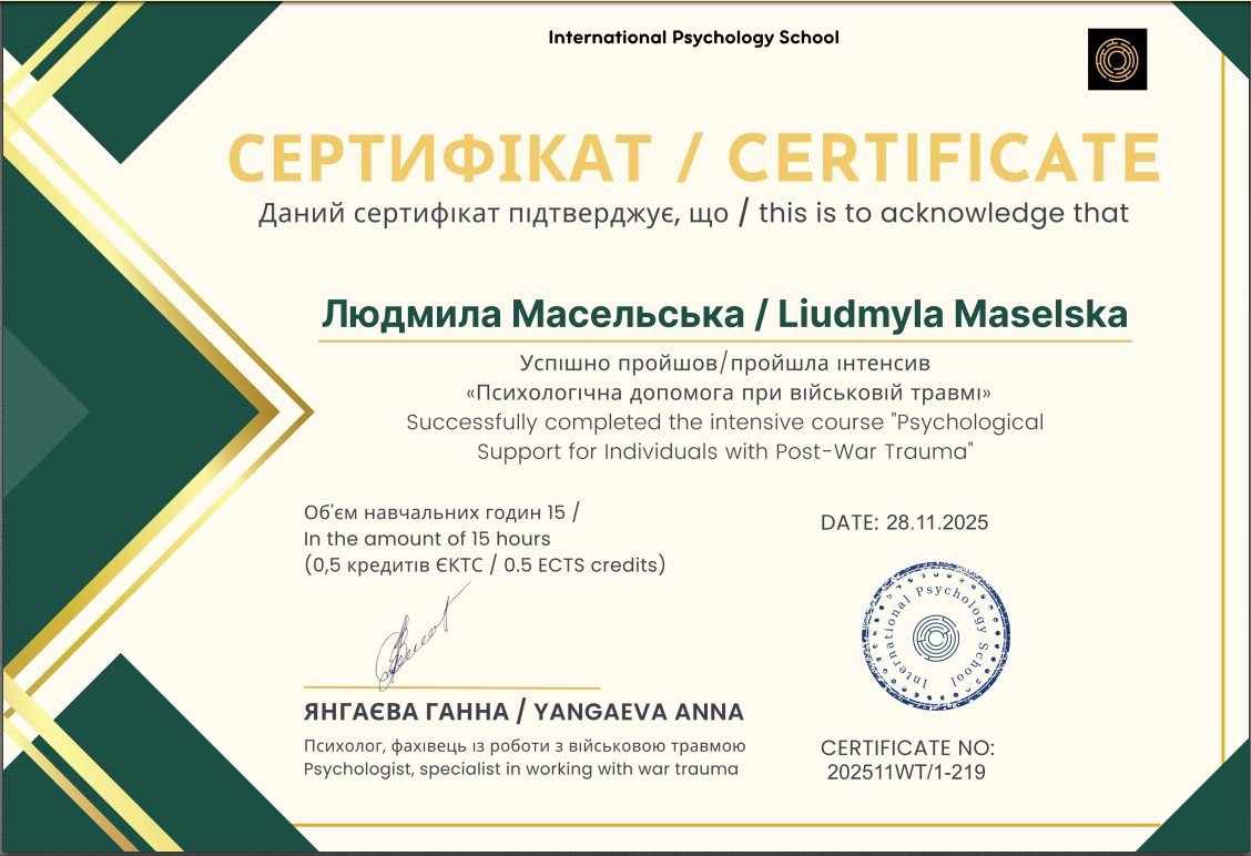 В 2024 году завершила обучение по программе "Кризисное консультирование" (135 учебных часов), преподаватель – проф. кафедры психологии развития КНУ имени Шевченко Екатерина Милютина (практическая техника работы с травмой: «Кинозал», реимпринтинг, эпистемологическая метафора, методика Шапиро, «Картировка», «Чистое пространство», «Безопасное место», «Вещи в теле» для преодоления телесных симптомов)