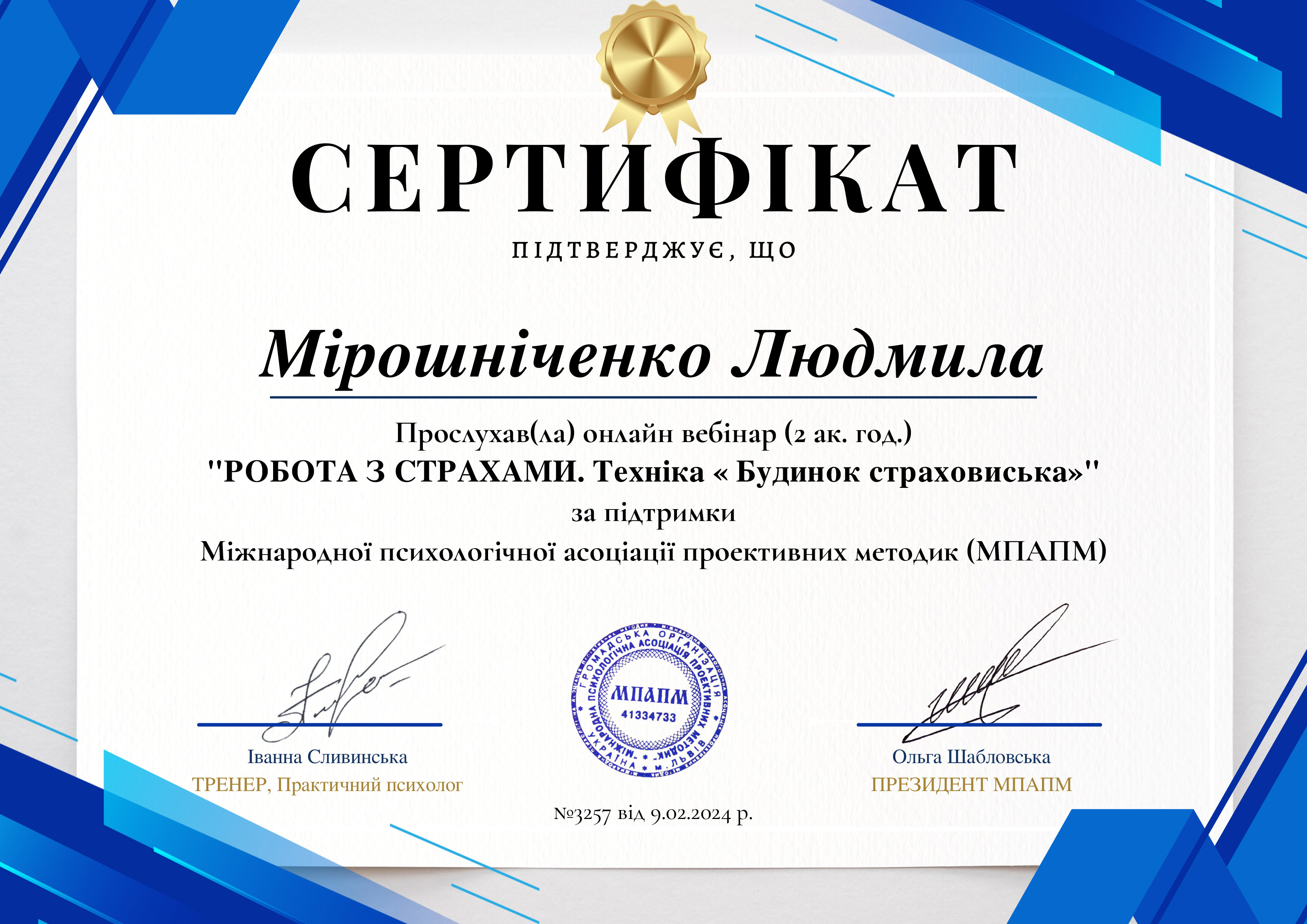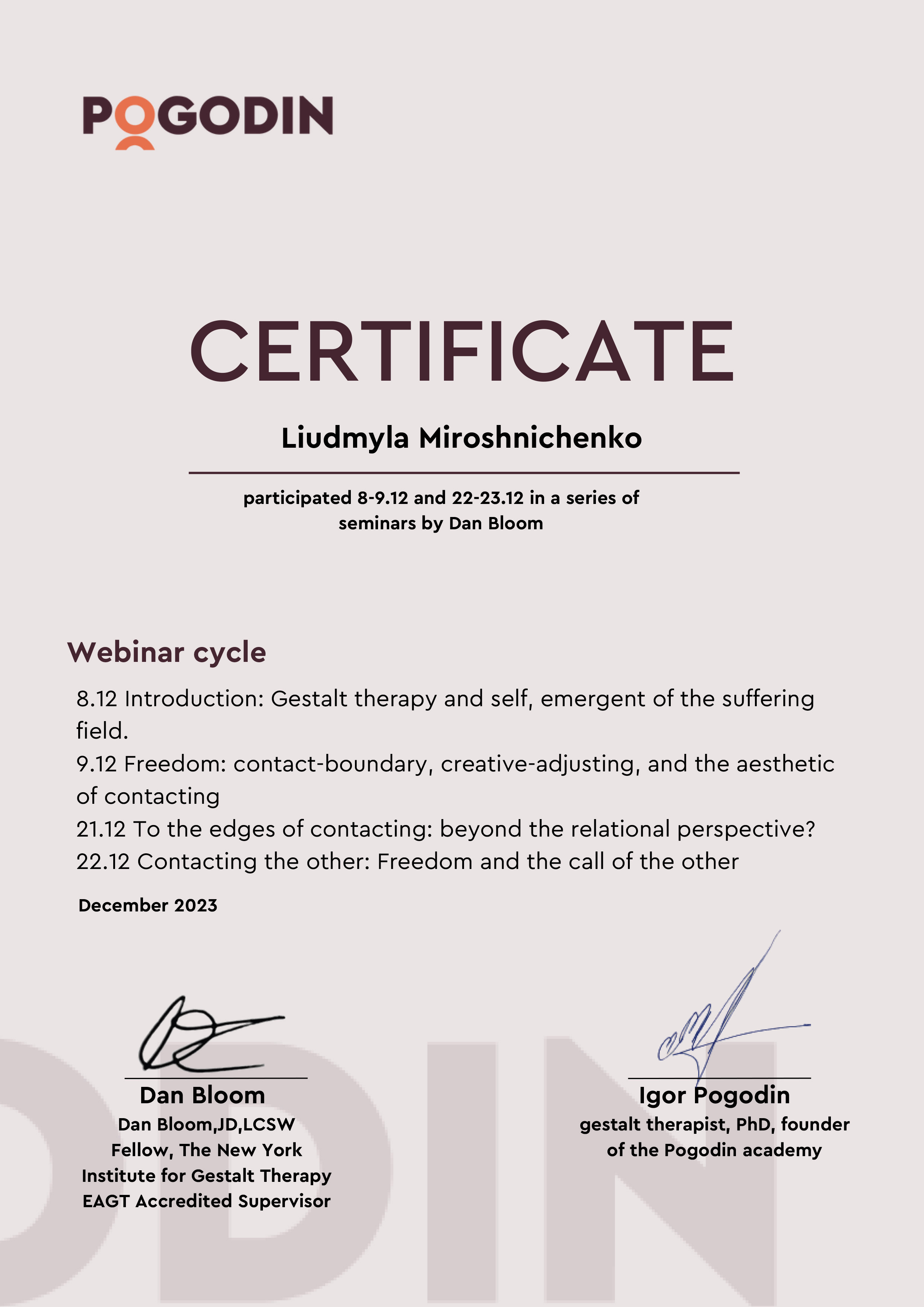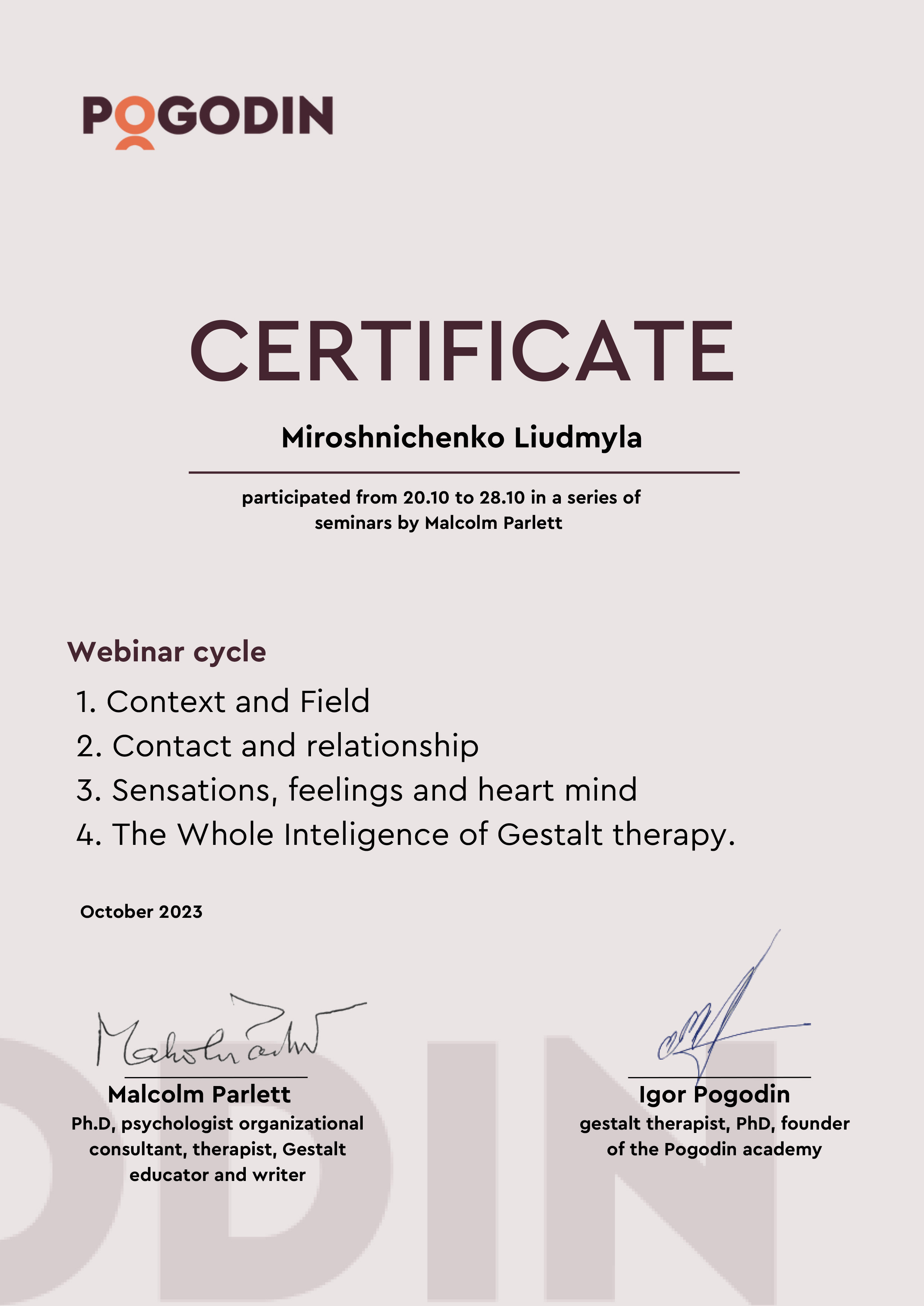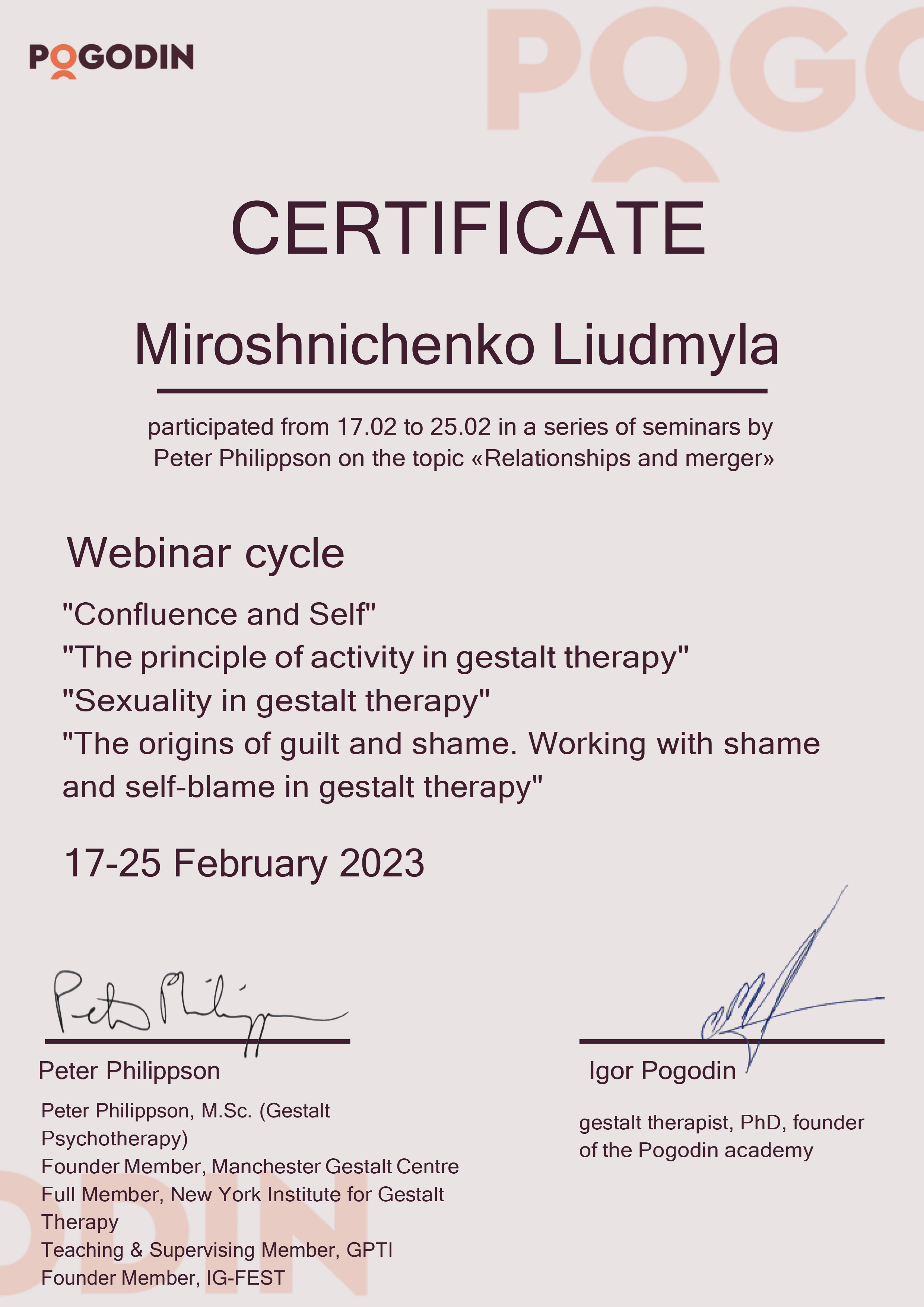 Есть сертификаты по прохождению обучения по работе с семьями, с психосоматикой, травмой, детскими кризисами. Постоянно принимаю участие в ежегодных конференциях гештальт-терапевтов и интинсивах.