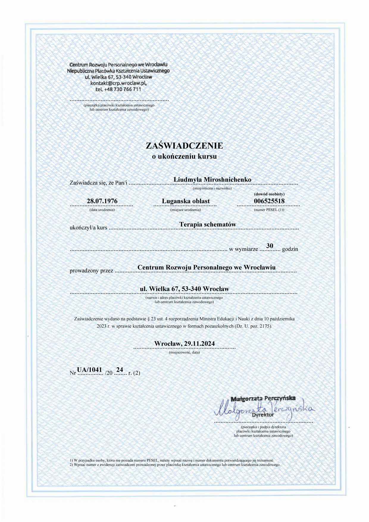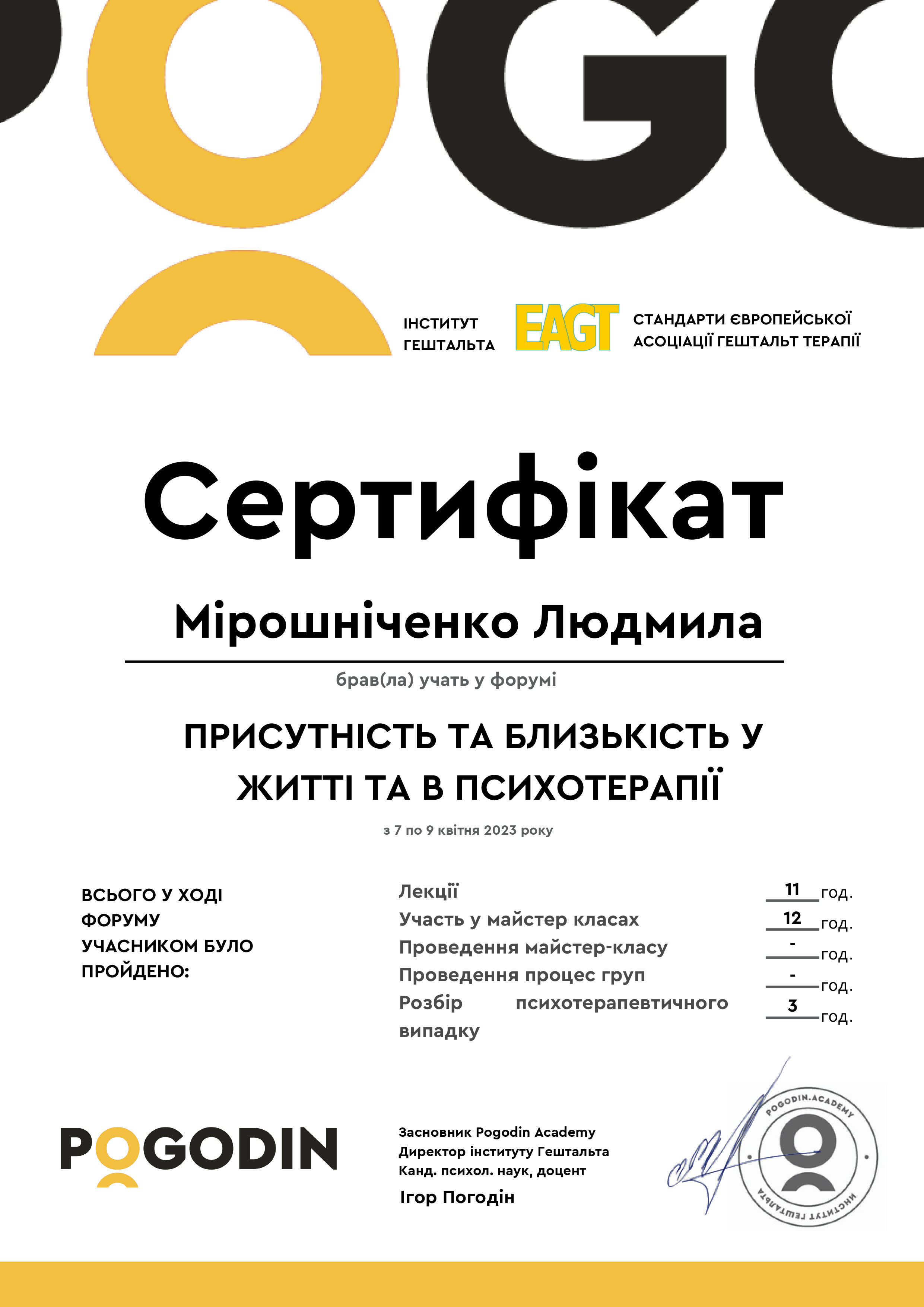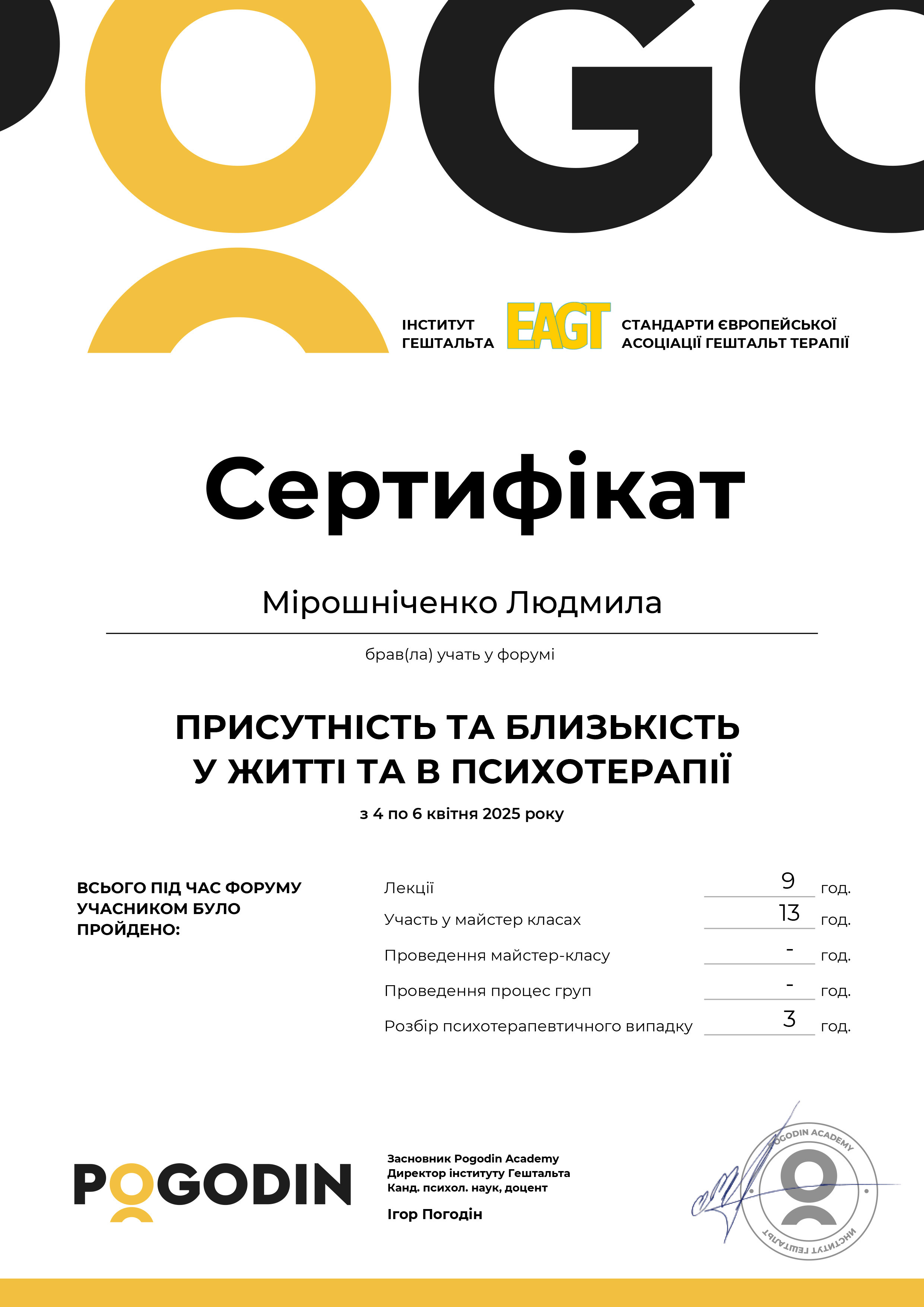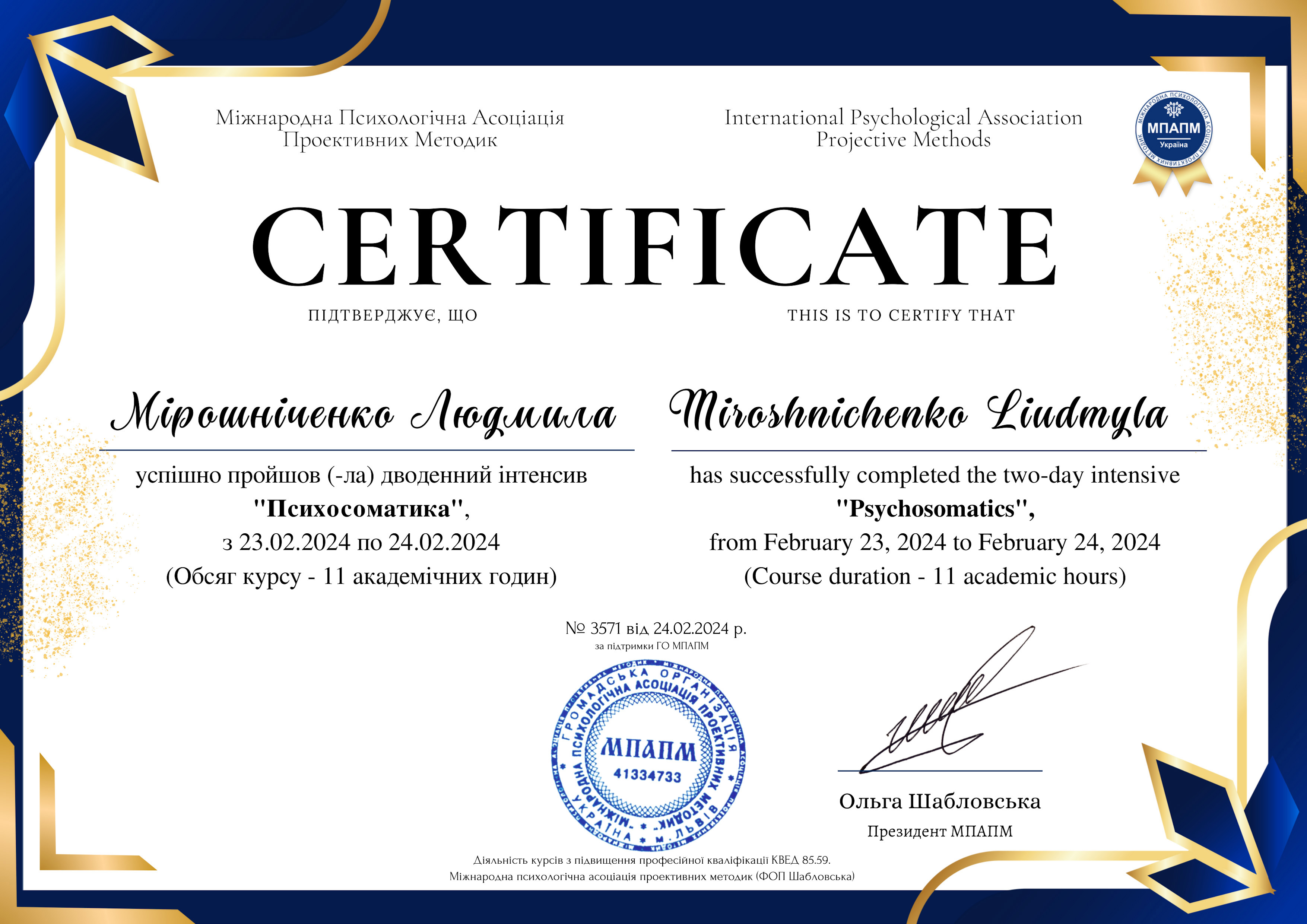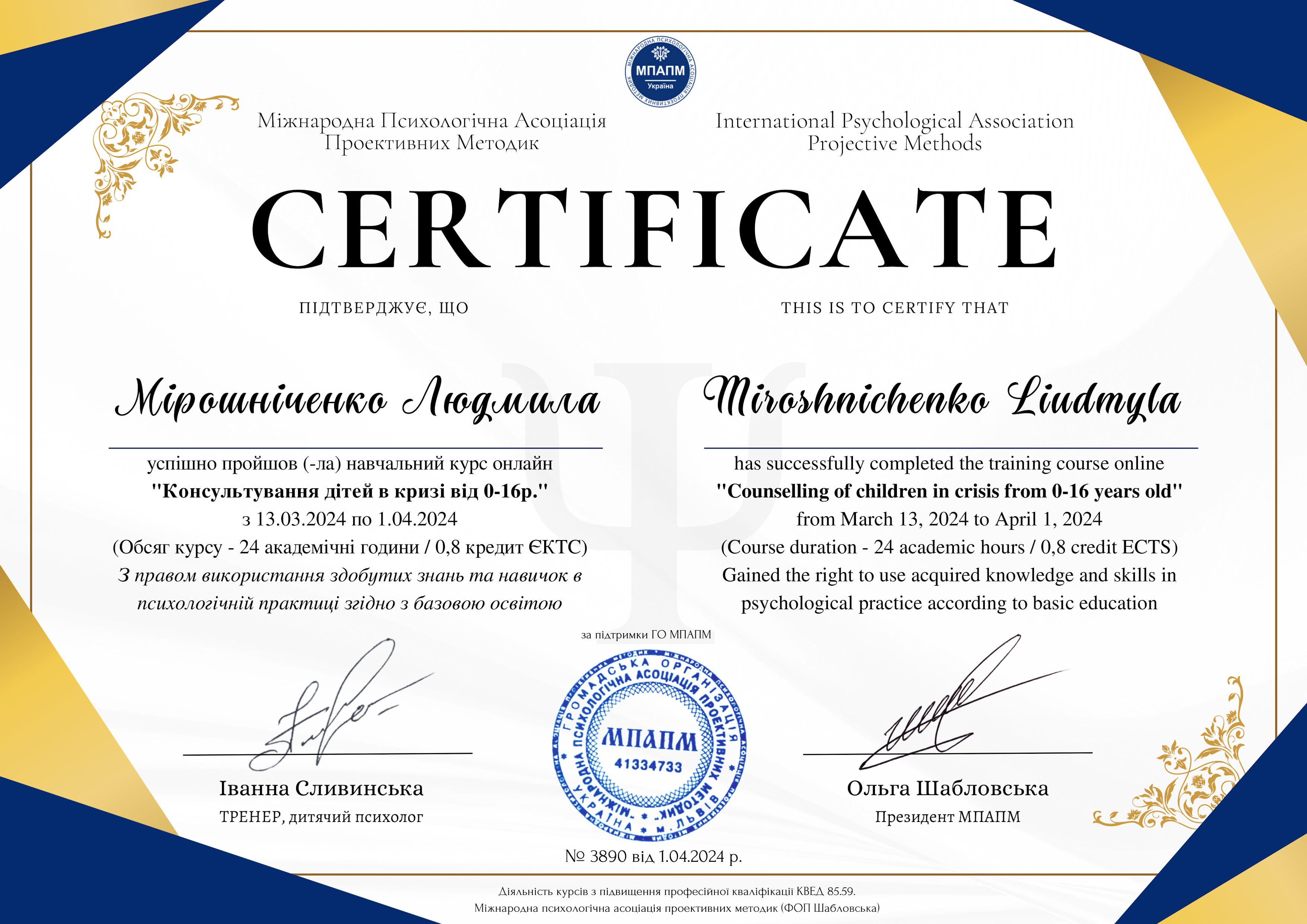 Магистр психологии (КНУ им.Шевченко), готовлюсь к сертификации как гештальт-терапевт (академия Погодина), имею сертификаты по прохождению обучения по работе с семьями, с психосоматикой, травмой, детскими кризисами. Постоянно принимаю участие в ежегодных конференциях гештальт-терапевтов и интинсивах. Работаю под супервидением.
