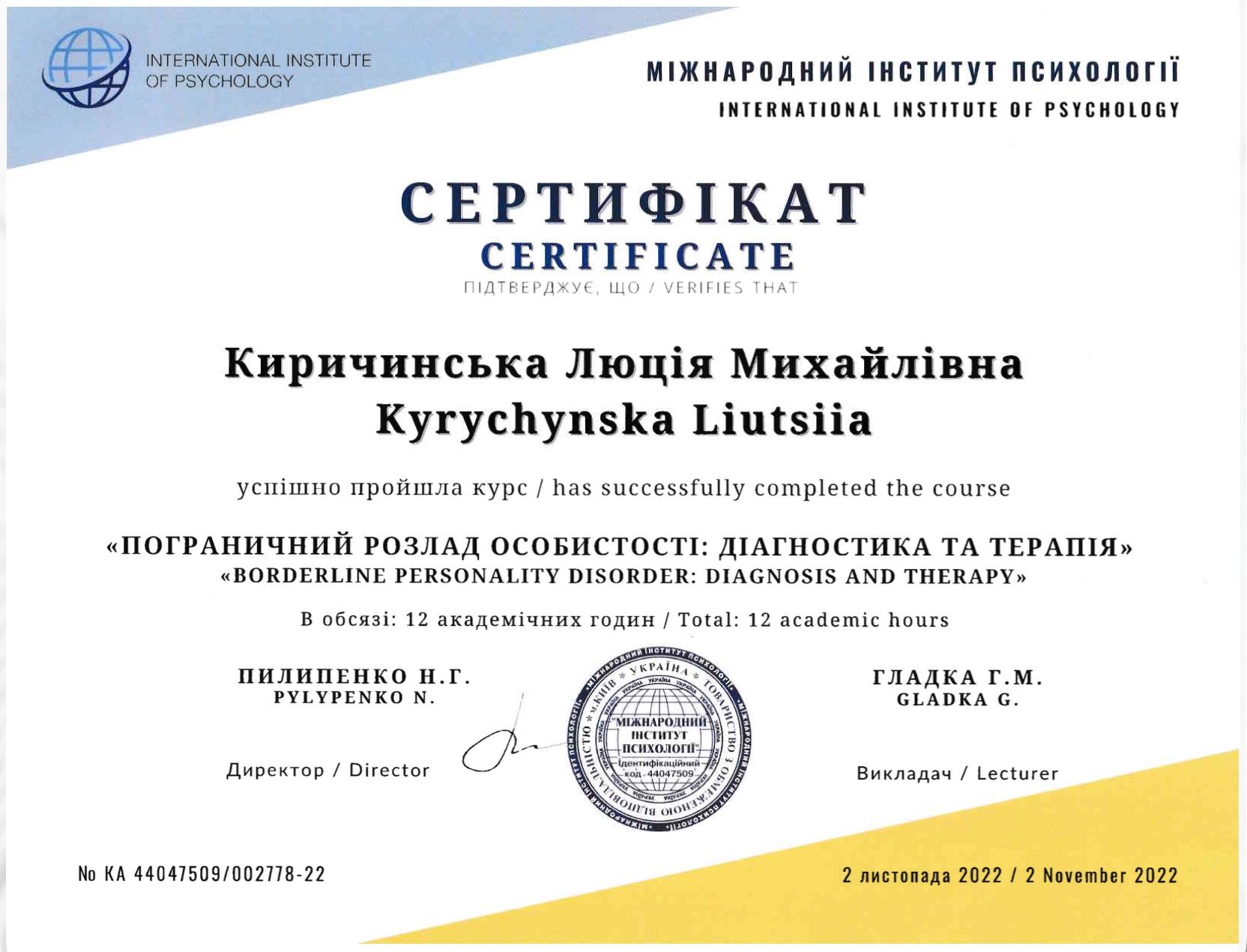 • Международный институт психологии – «Граничное расстройство личности: диагностика и терапия»;