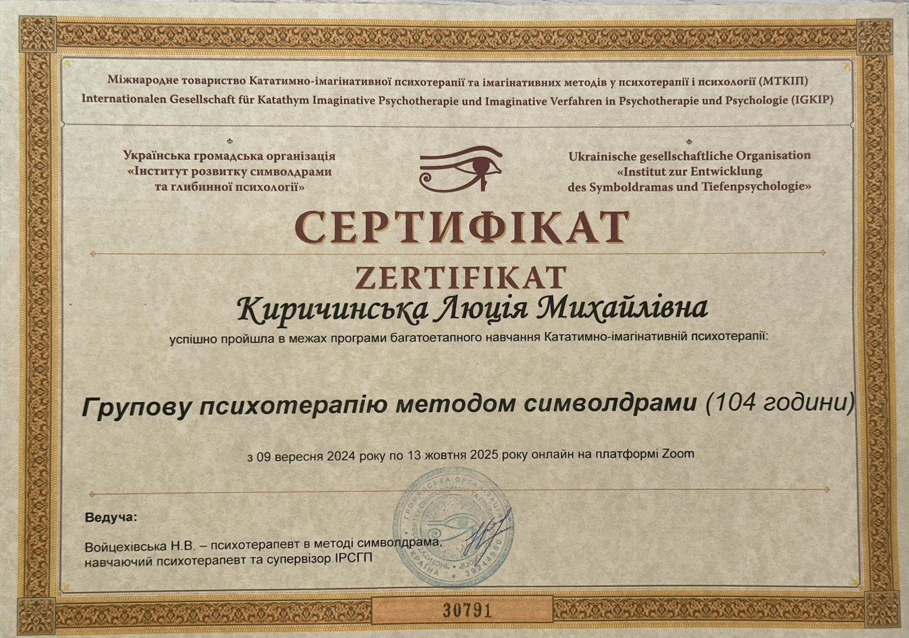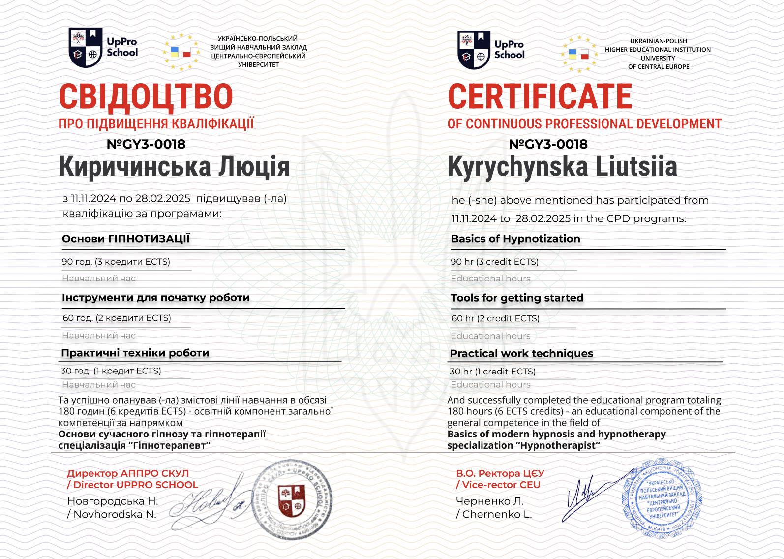 • UpPro School – «Основы современного гипноза и гипнотерапии», спец. «гипнотерапевт»;