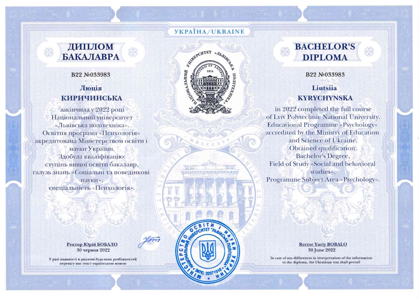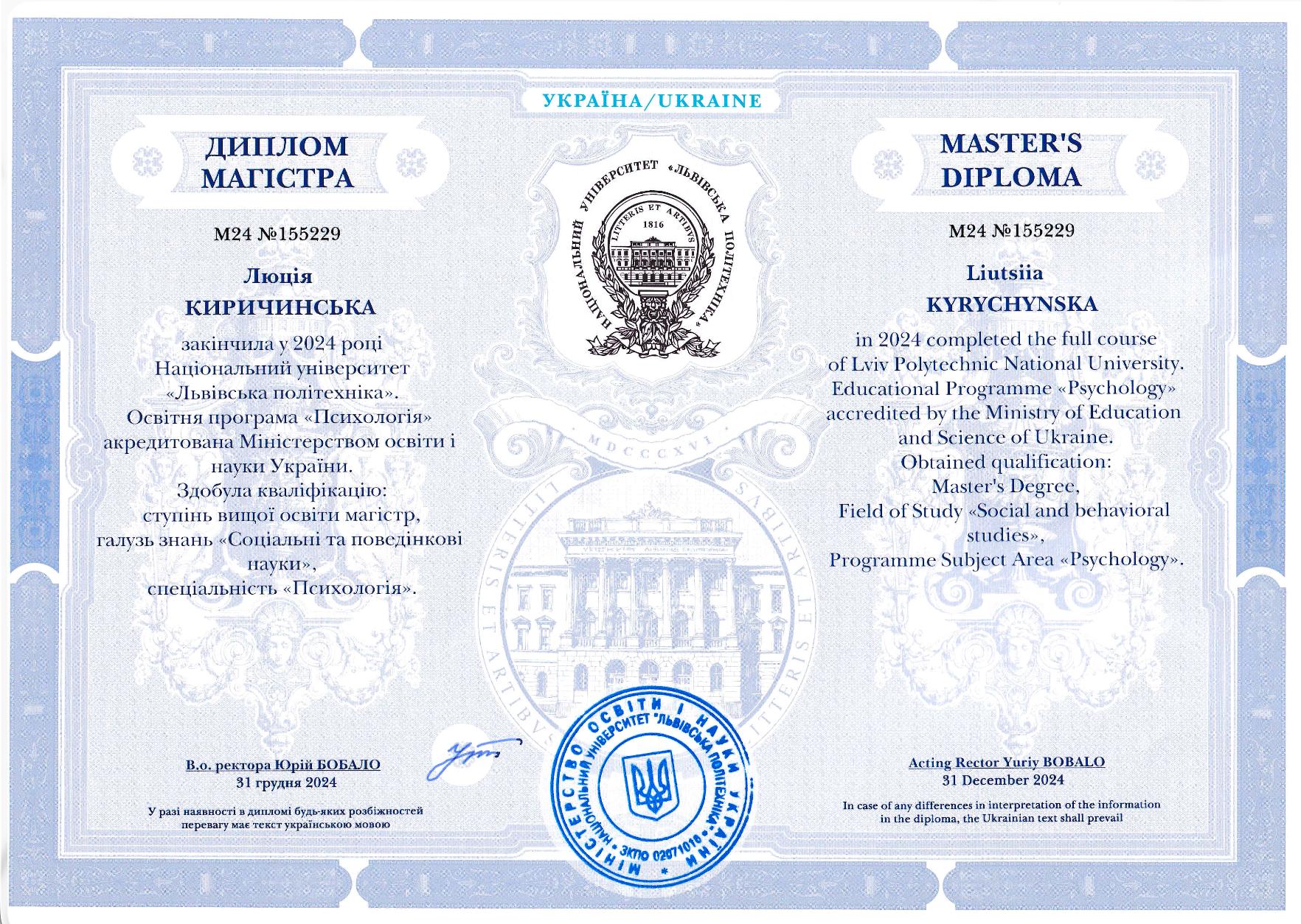 • бакалавр и магистр психологии, Институт права, психологии и инновационного образования, НУ «Львовская политехника»;
