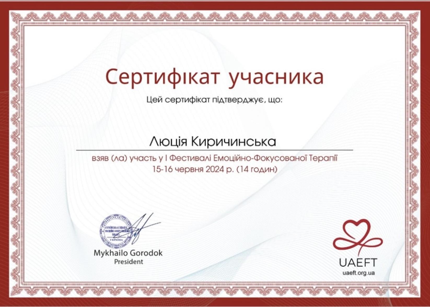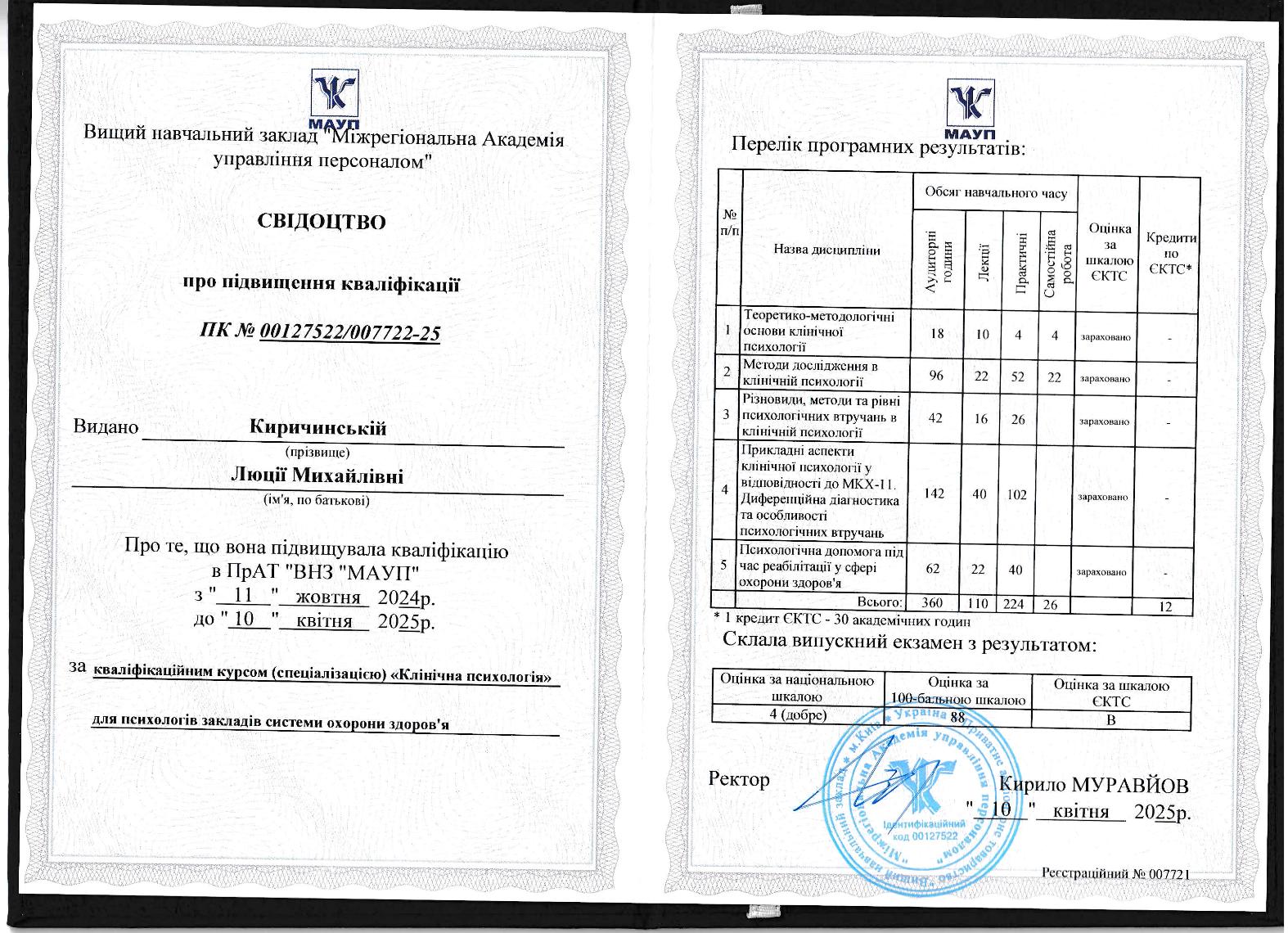 • специализация «клинический психолог», вуз «Межрегиональная Академия управления персоналом» (360 часов).