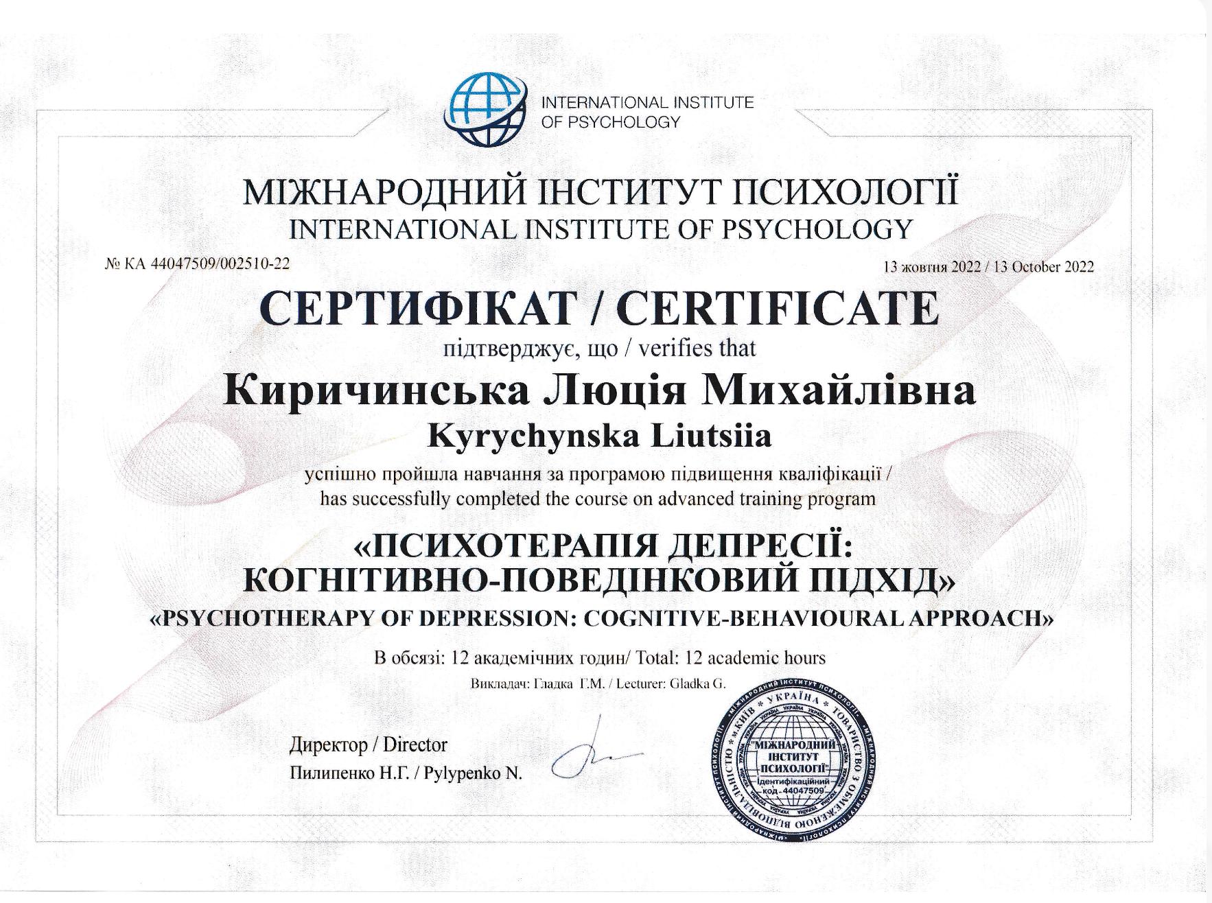 • Международный институт психологии – «Психотерапия депрессии: КПТ-подход»;