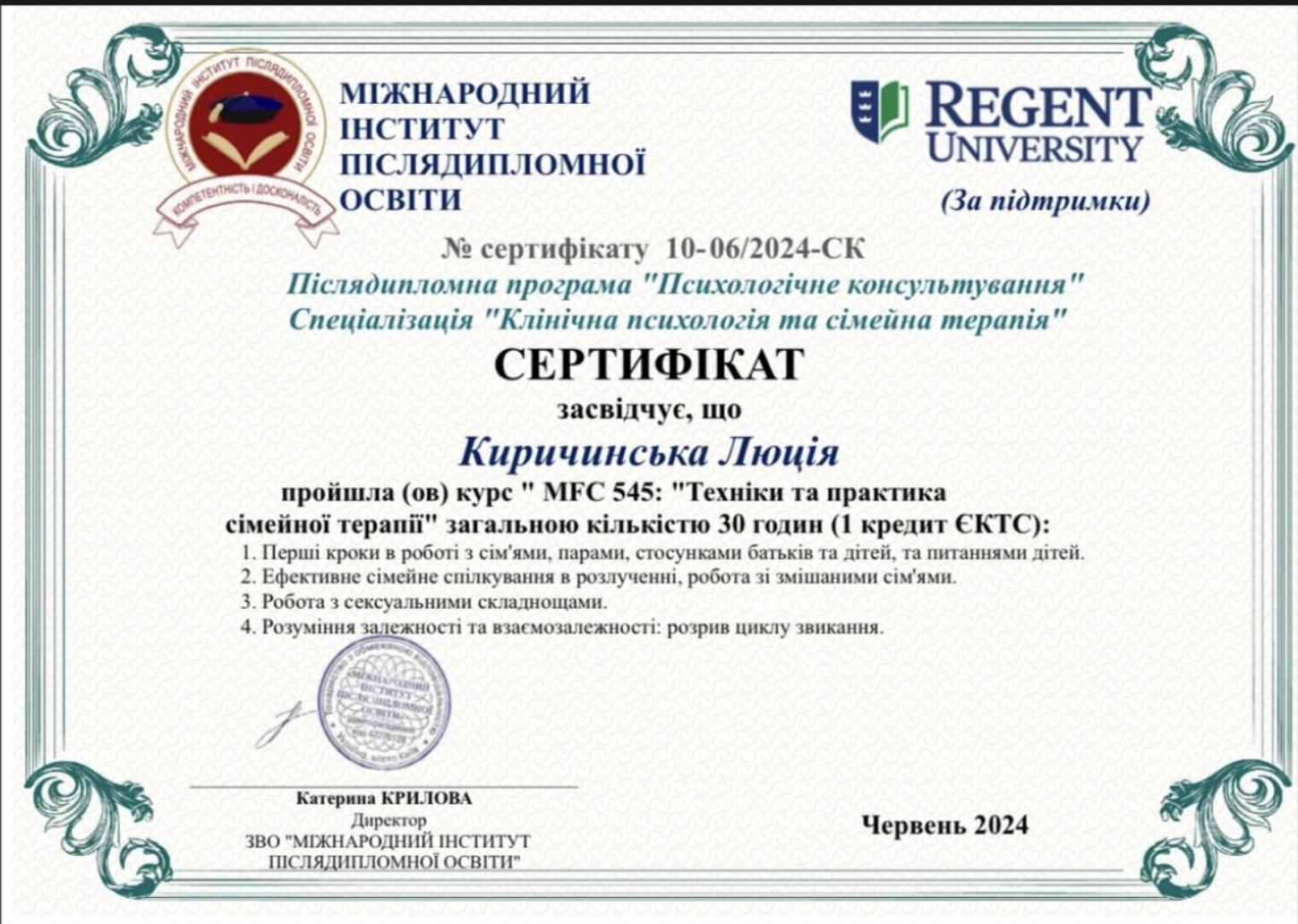 • Международный институт последипломного образования – «Техники и практика семейной терапии»;