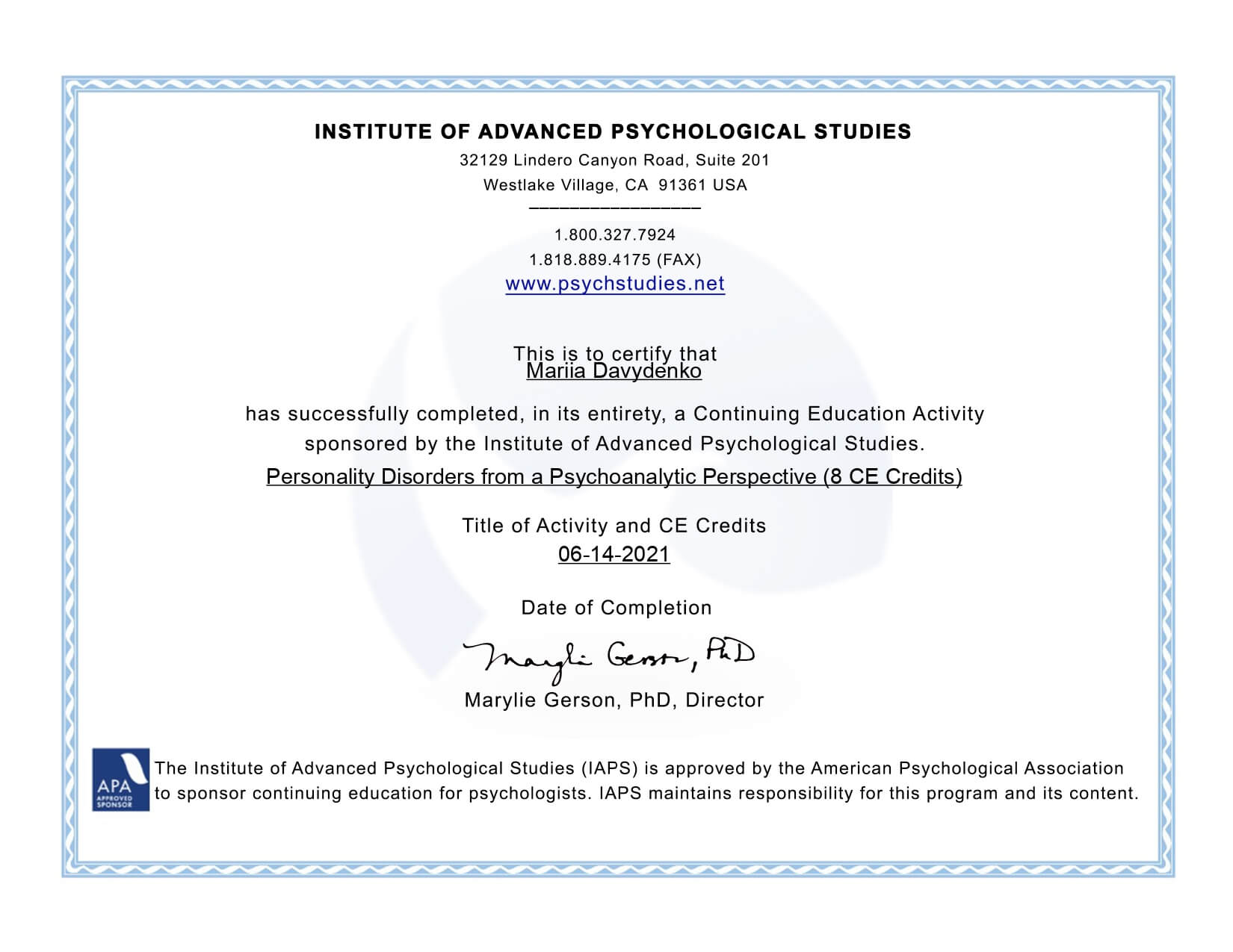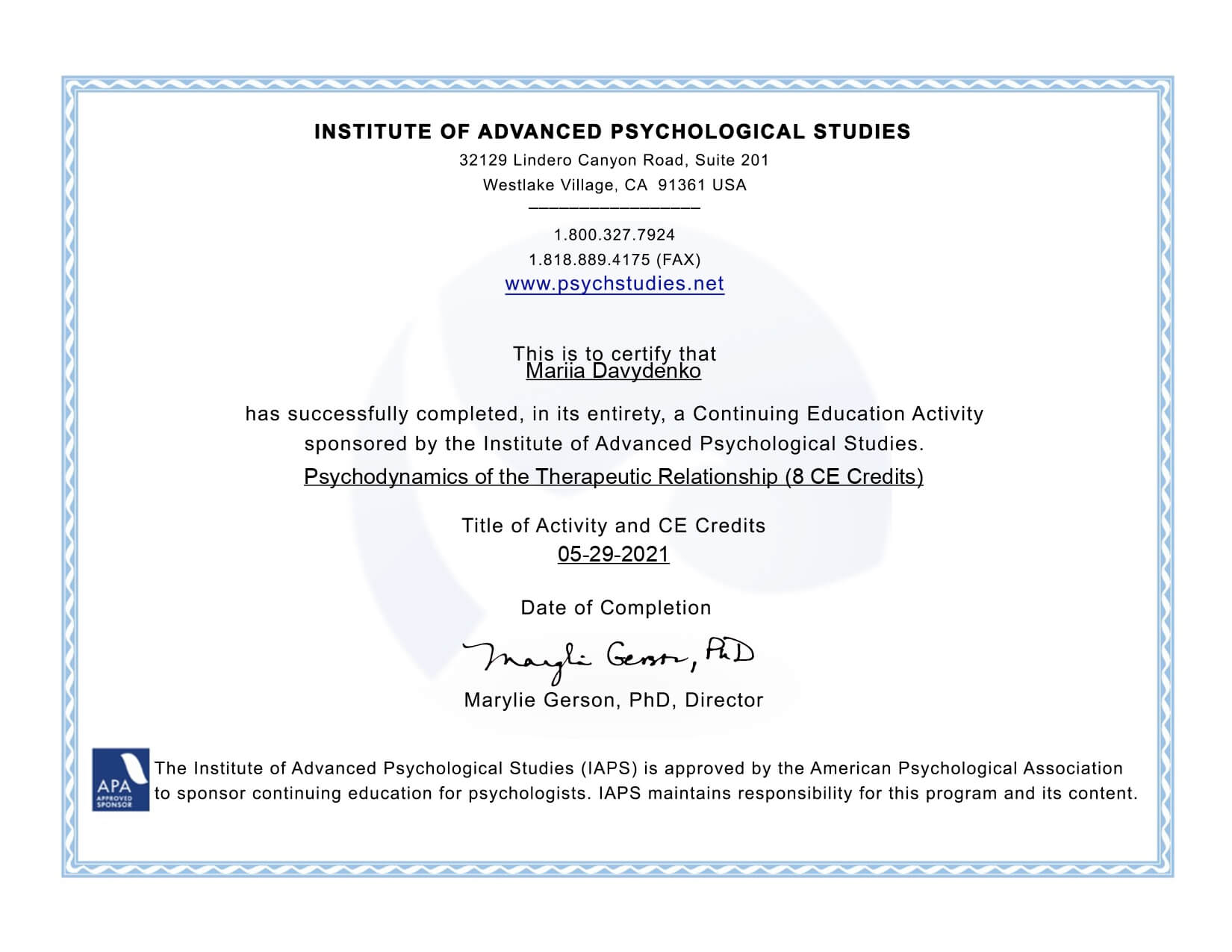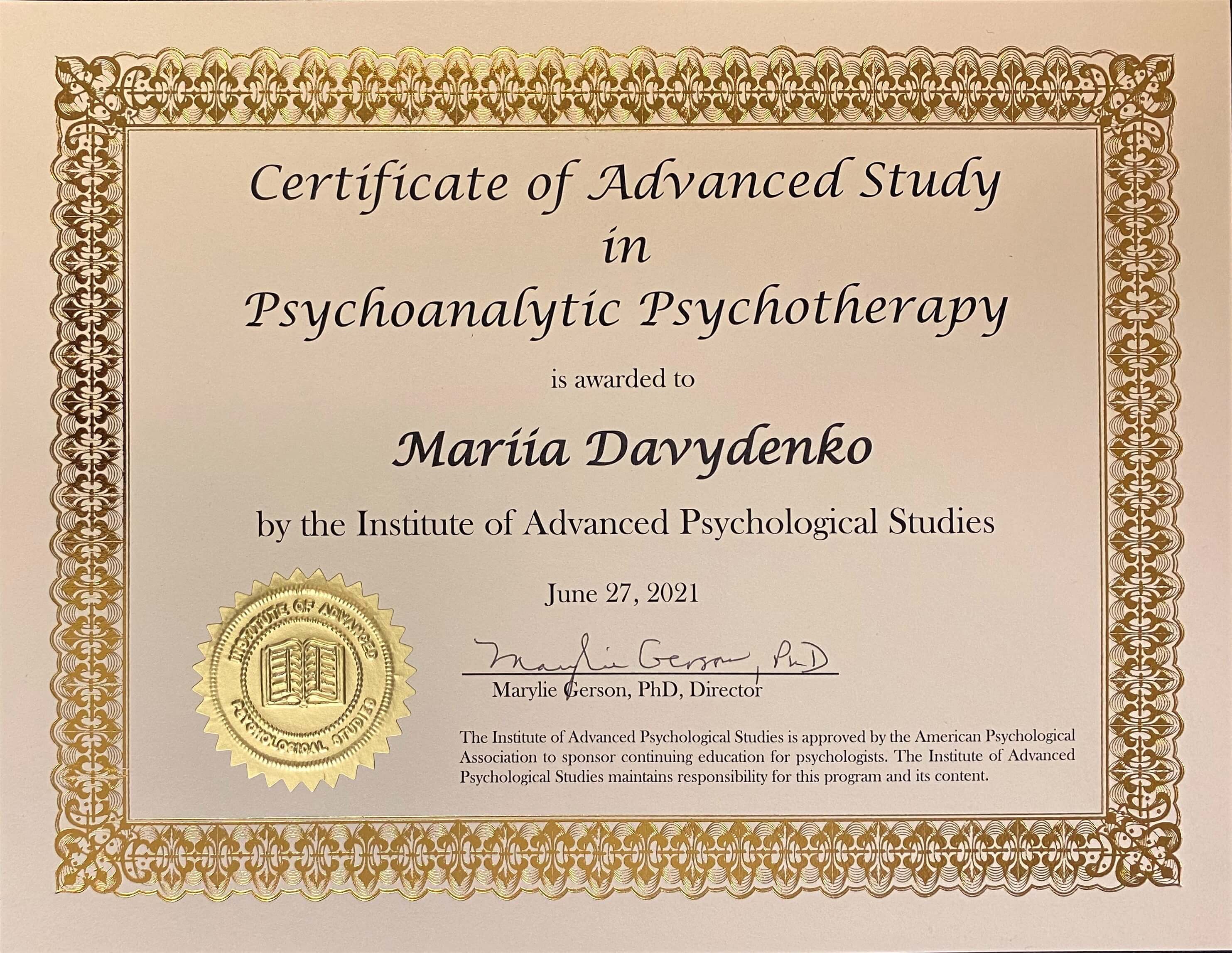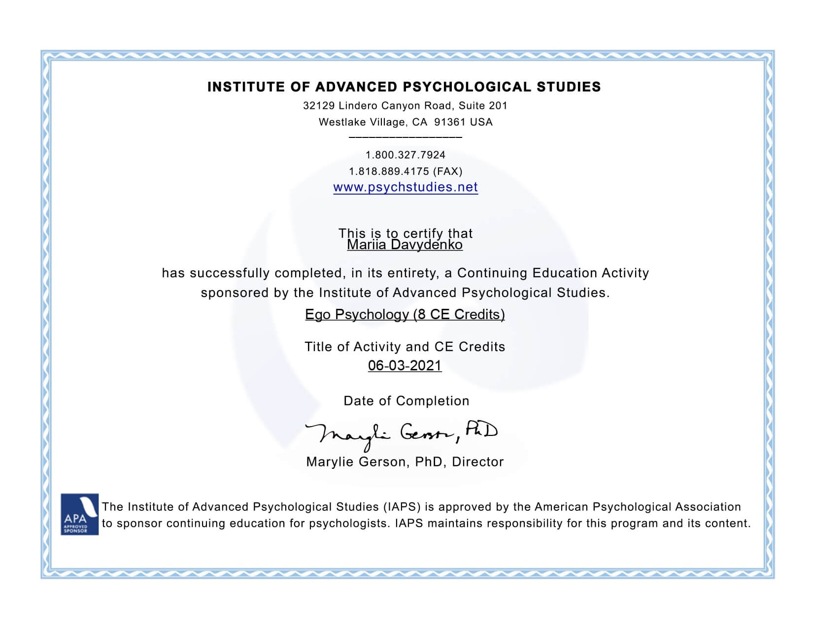 Institute of Advanced Psychological Studies (USA) - специализация "Psychoanalytic Psychotherapy"