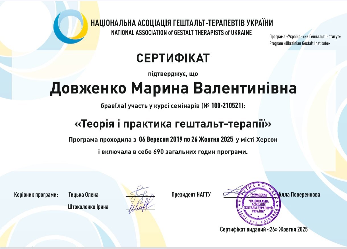 Я гештальт-терапевт с 9-летним опытом. Моя идентичность как специалиста сформирована не только обучением, но и глубоким личным опытом преодоления кризисов. После трех лет эмиграции в Германии я сознательно выбрала вернуться в Украину, доказав себе, что внутренние опоры – это то, что мы носим с собой сквозь любые штормы.