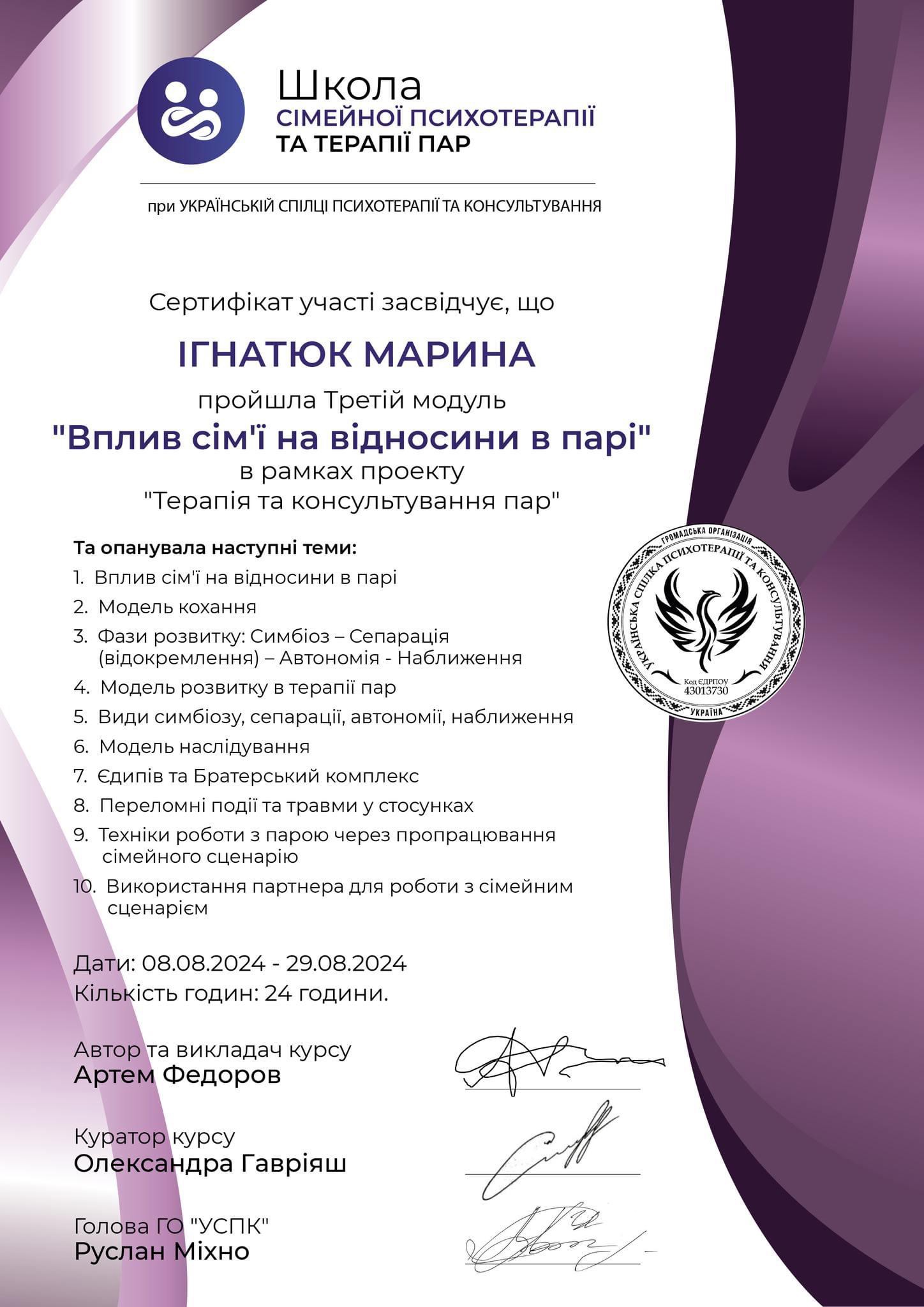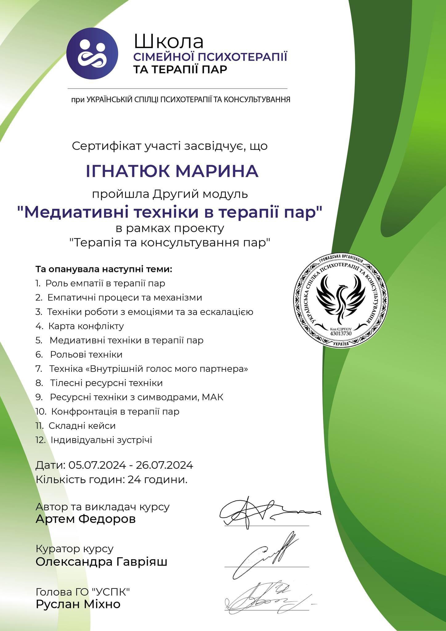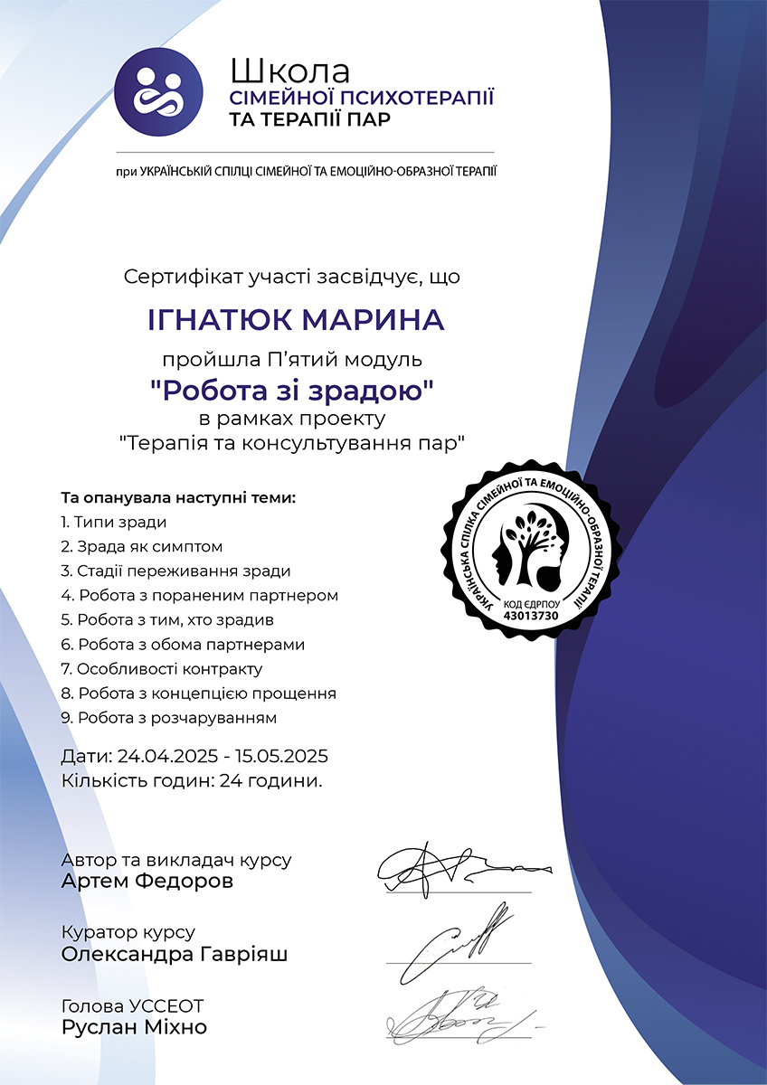 В данный момент обучаюсь «Когнитивно-образной терапии» – это современный метод психотерапии созданный А. Колендо-Смирновой. Представляет собой метод работы с подсознанием с помощью образов меняющих трансформирующих глубинные деструктивные убеждения.