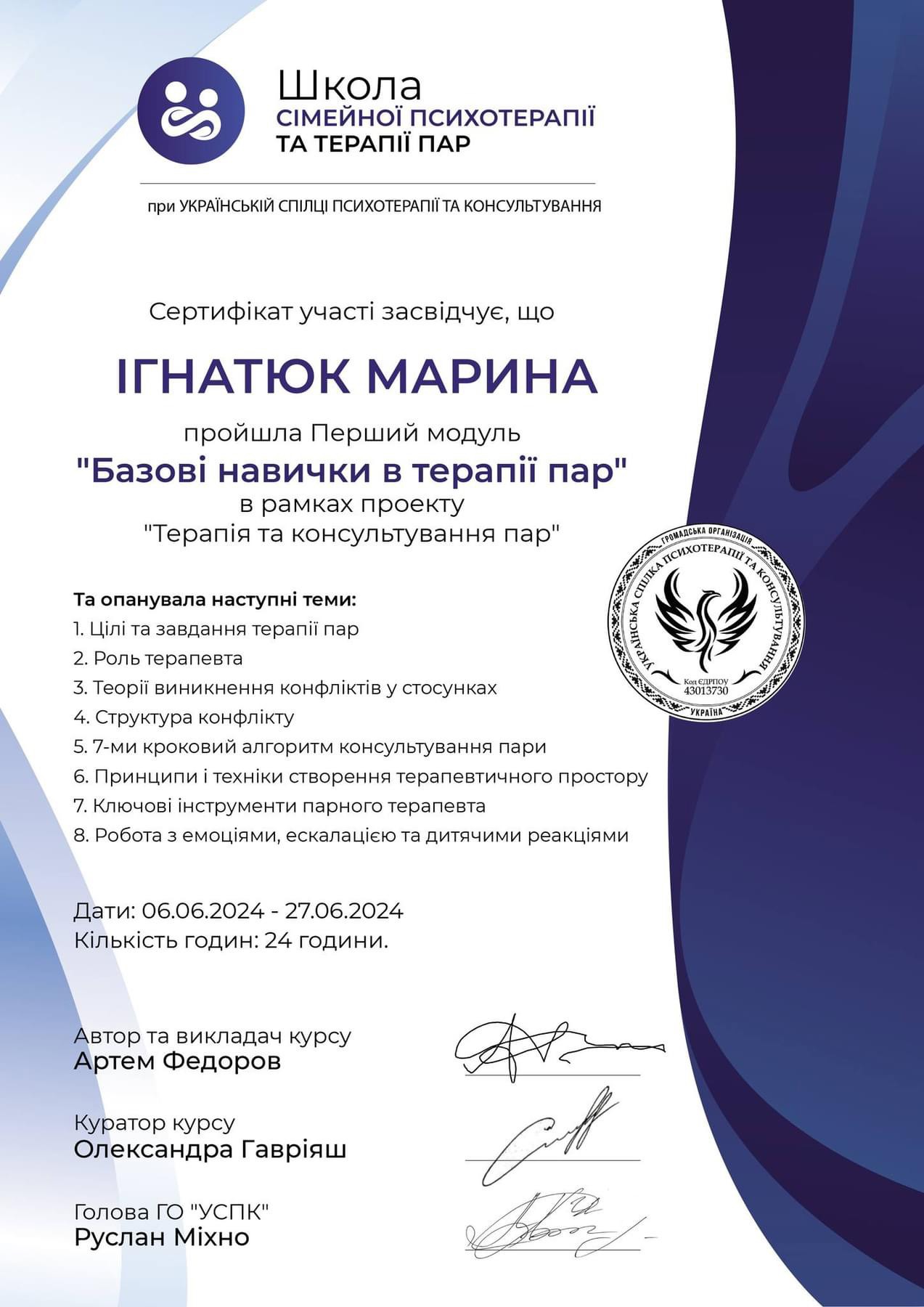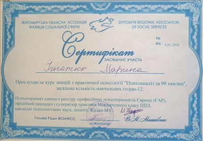 Житомирский государственный университет им. И. Франко, профессиональная квалификация - магистр психологии, психолог.