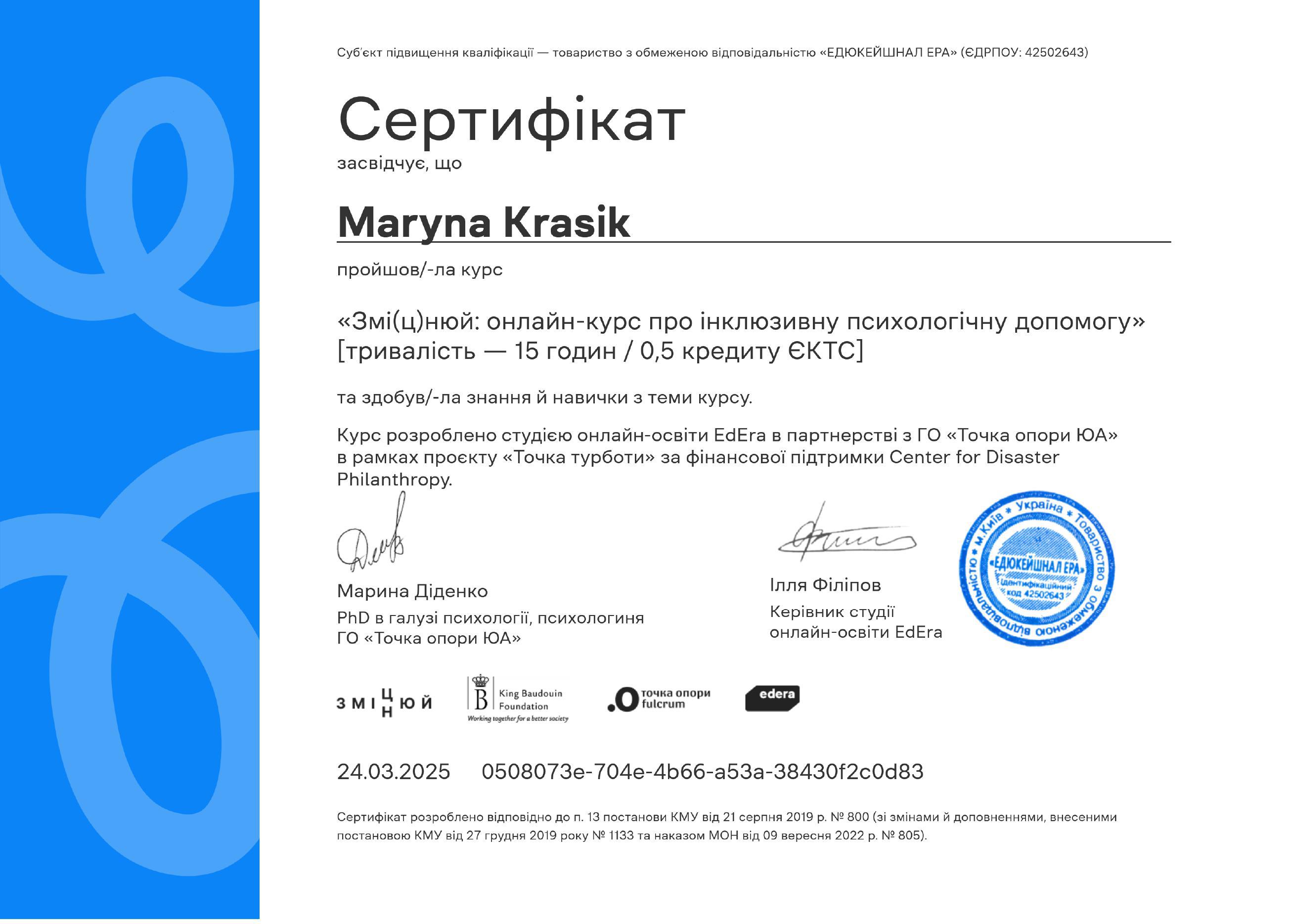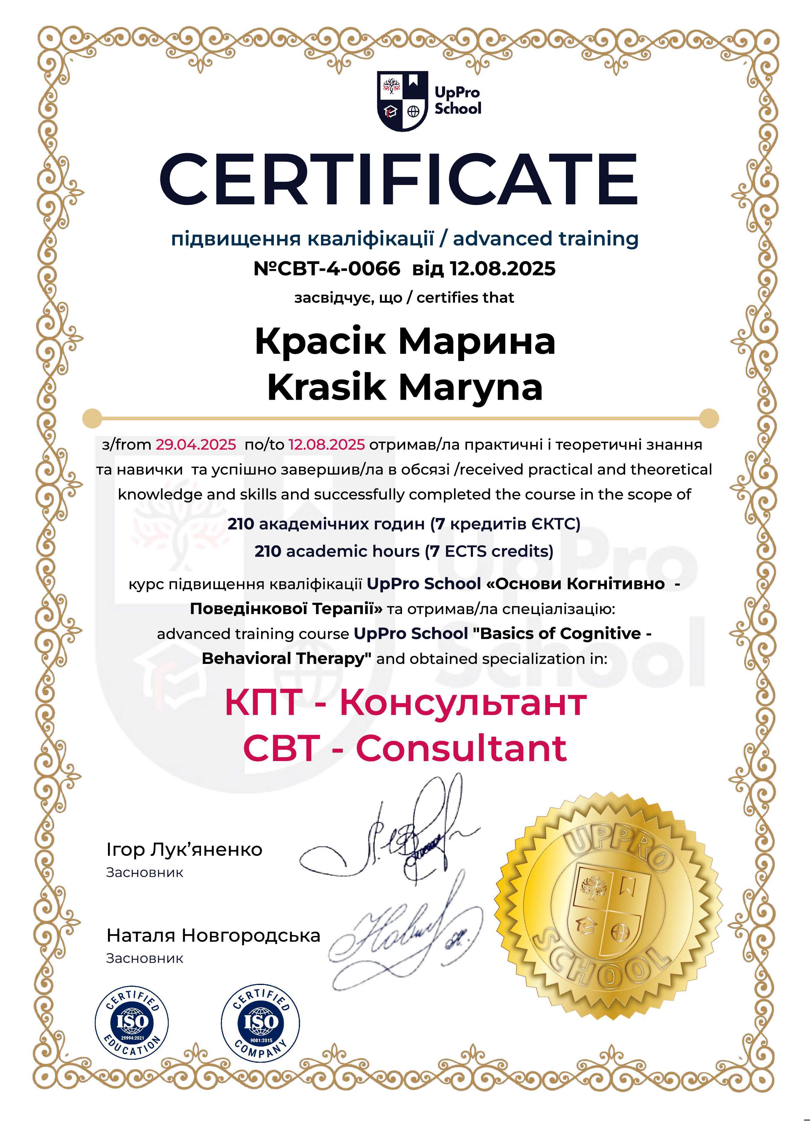 Годовая программа EUROPEAN PSYCHOLOGY SCHOOL, специализация психолог-консультант по аналитическому подходу. Украинско-польское высшее учебное заведение Центрально-Европейский университет, специализация КПТ-консультант. Прохожу обучение на 4-х летней программе 202 курса "Транзакционный Анализ в психотерапии" союз УАТА.