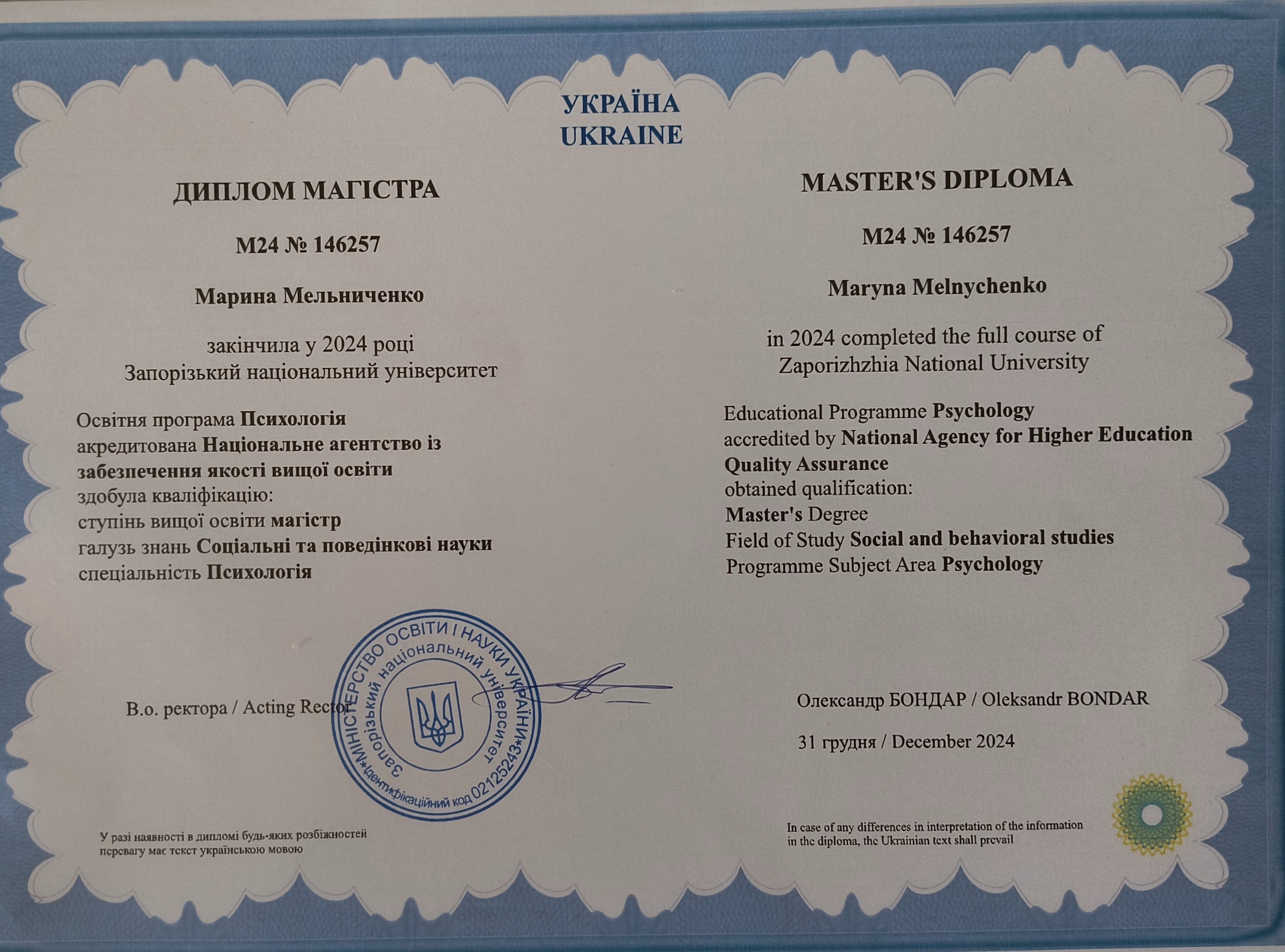 • Запорожский национальный университет 2024г. «Психология» М24№146257