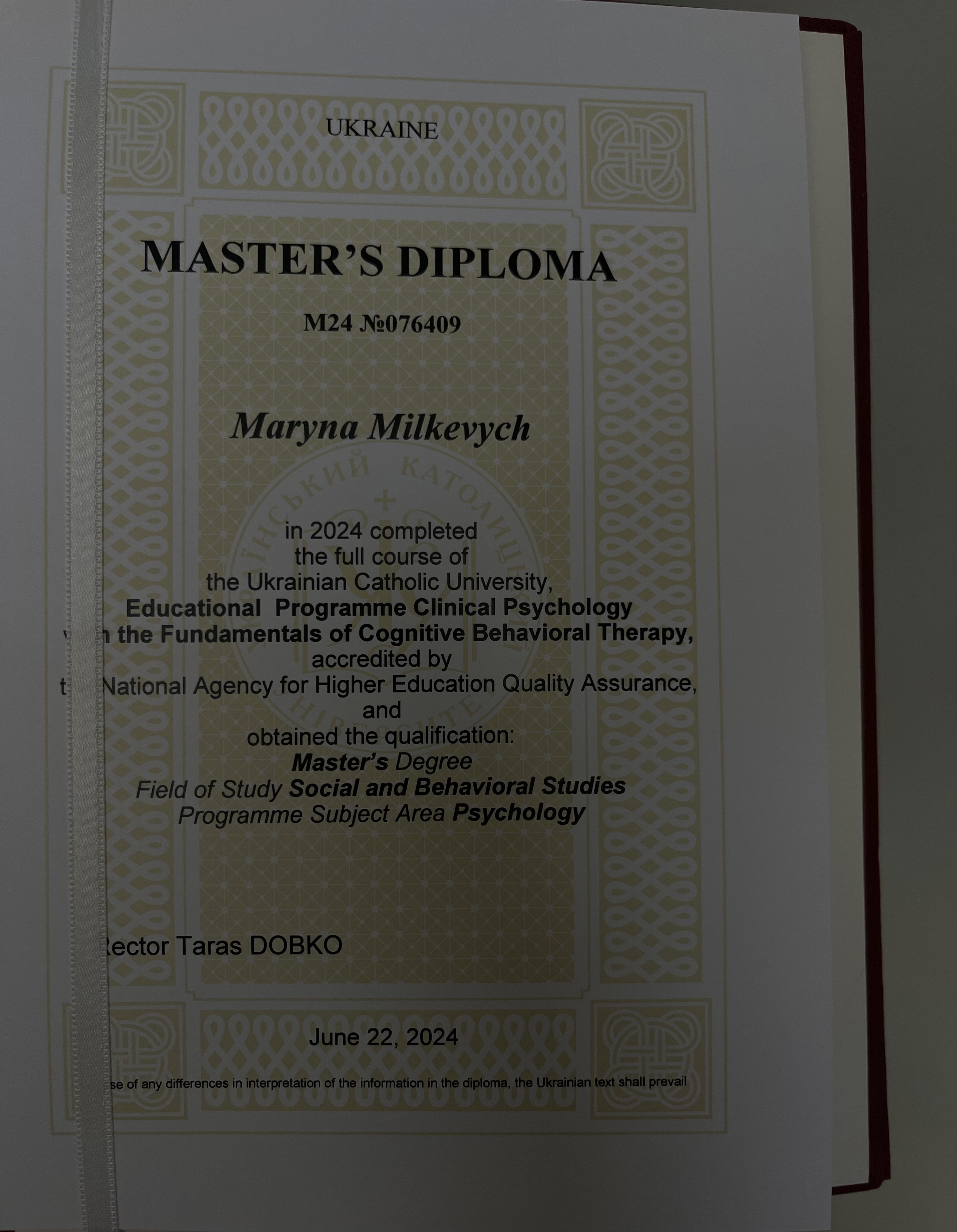 – Окончила магистратуру Украинского католического университета (Львов) по образовательной программе «Клиническая психология с основами когнитивно поведенческой терапии (КПТ)», 2024 год.