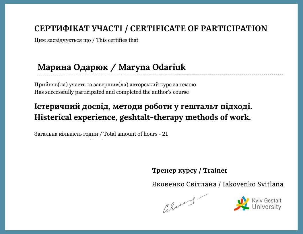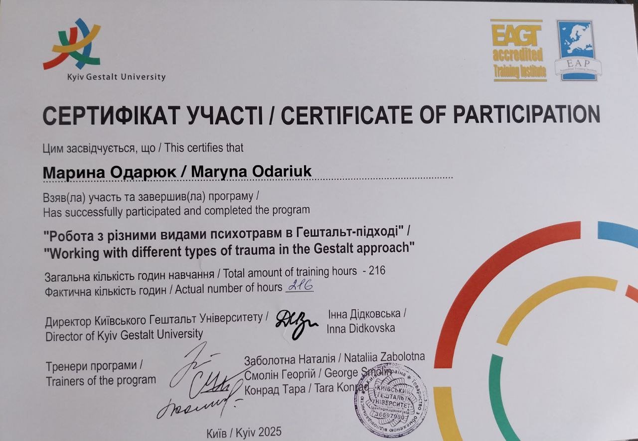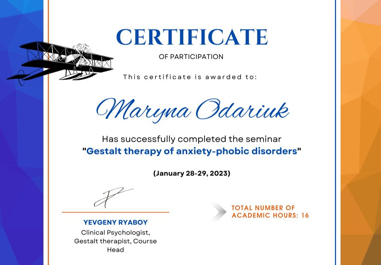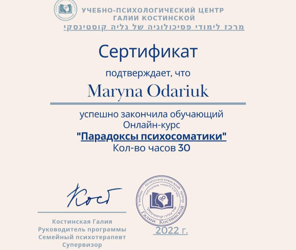 Завдяки психотерапії я почала відчувати себе і розуміти свої почуття, йти за своїми потребами, вибудовувати кордони, впоралася з багатьма страхами, почала більше спиратися на себе. Більш щирими та справжніми стали стосунки у сім'ї, покращилася якість життя та з'явилося більше ресурсу на досягнення своїх мрій.