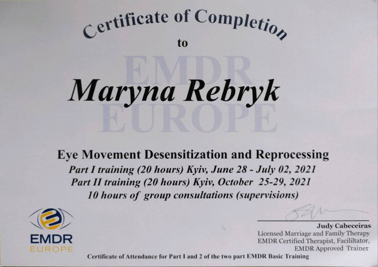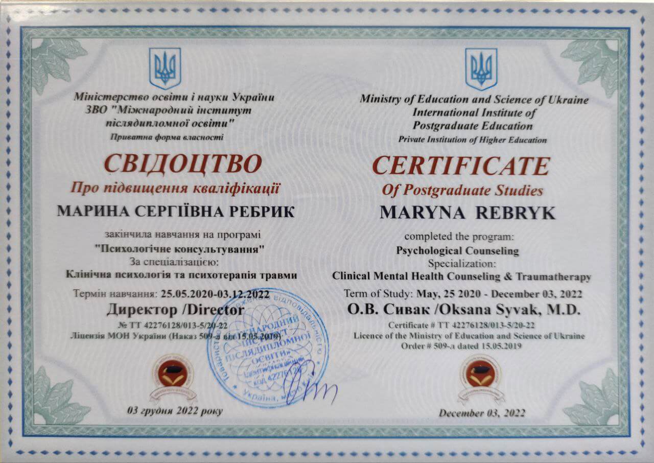 Придя в свое время в психотерапию в качестве клиента, я убедилась, насколько она улучшает качество жизни и решила, что хочу обучаться этому искусству. А сегодня я сама практикующий психолог и психотерапевт. Я – искренний, открытый человек, который уже прошел долгий путь и продолжает обучаться и развиваться. Работаю я со взрослыми и подростками. Владею четырьмя иностранными языками (кроме русского и украинского) – английским, польским (свободно), немецким и французским (на уровне чтения). Соответственно, сессии могу проводить также на английском и польском. Очень люблю читать, а периодически сама пишу стихи и прозу. Много лет занимаюсь йогой. Пребываю в стабильных и счастливых отношениях, замужем.