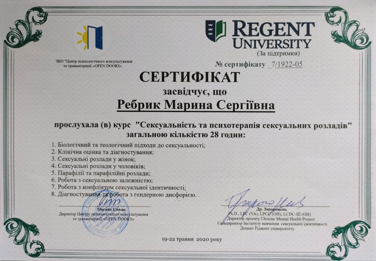 — Курс «Сексуальность и психотерапия сексуальных расстройств» (Др. Марк Ярхауз, США; Regent University, USA, Центр психологического консультирования и травматерапии Open Doors)