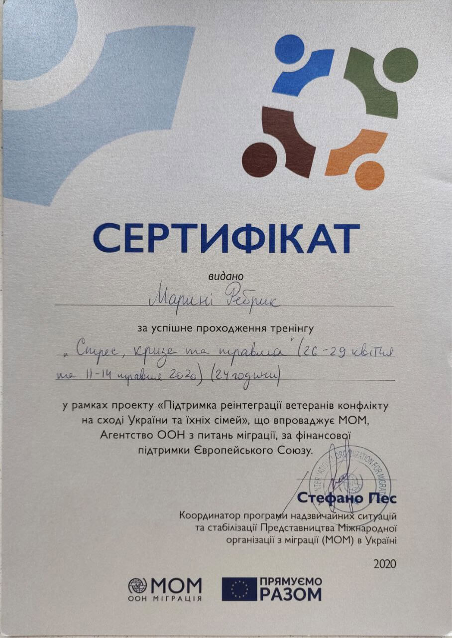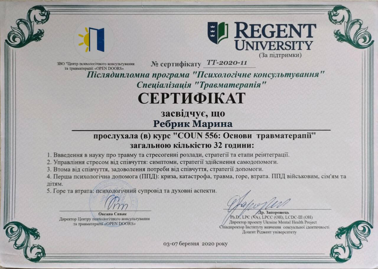 — Программа последипломного обучения психологов «Травматерапия» (Regent University, USA, Международный университет последипломного образования; в процессе обучения)