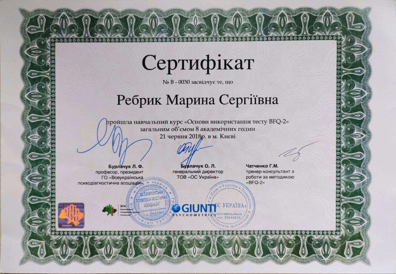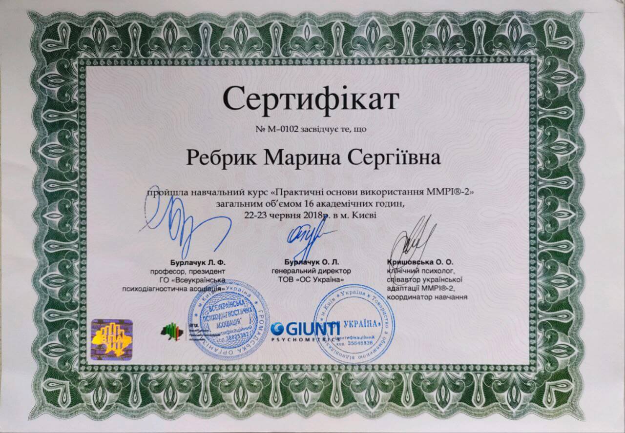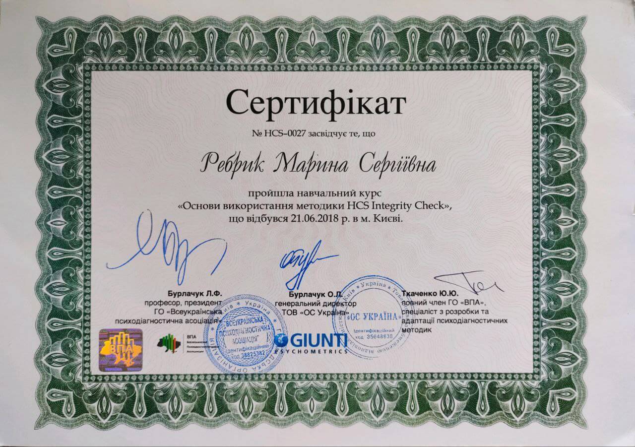 - обучение по работе с психодиагностическими инструментами MMPI-2, BFQ, HCS (Giunti Psychometrics, сертификаты эксперта)