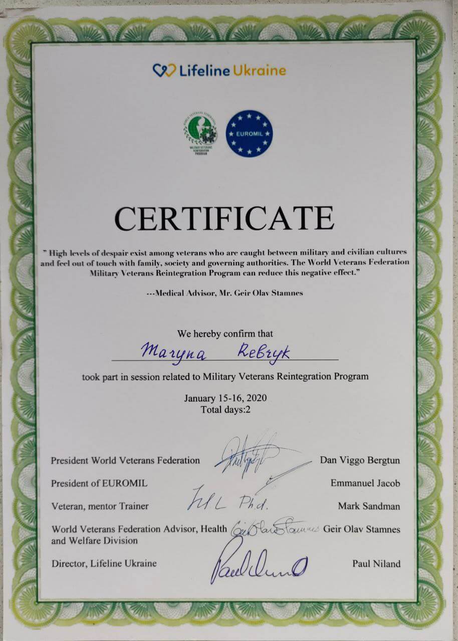 - тренинг «Проект реинтеграции ветеранов Украины» (Эммануэль Якоб (президент Euromil), Дан-Вигго Бергтун, (президент ВФВ), Гейр Стамнес, (советник ВФВ, подразделение здоровья и благополучия), Марк Сендман (травматерапевт)